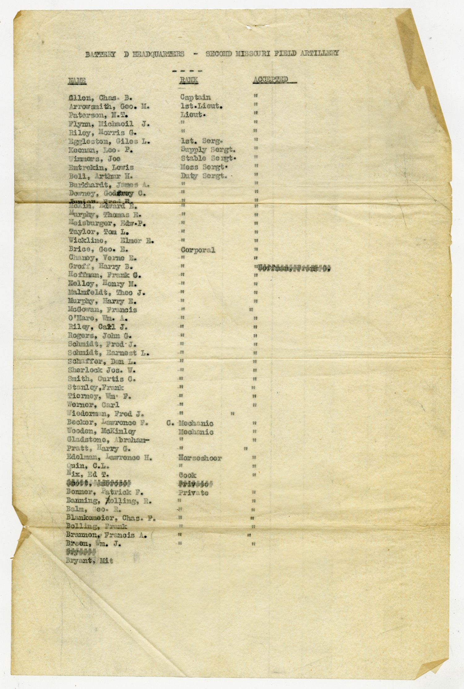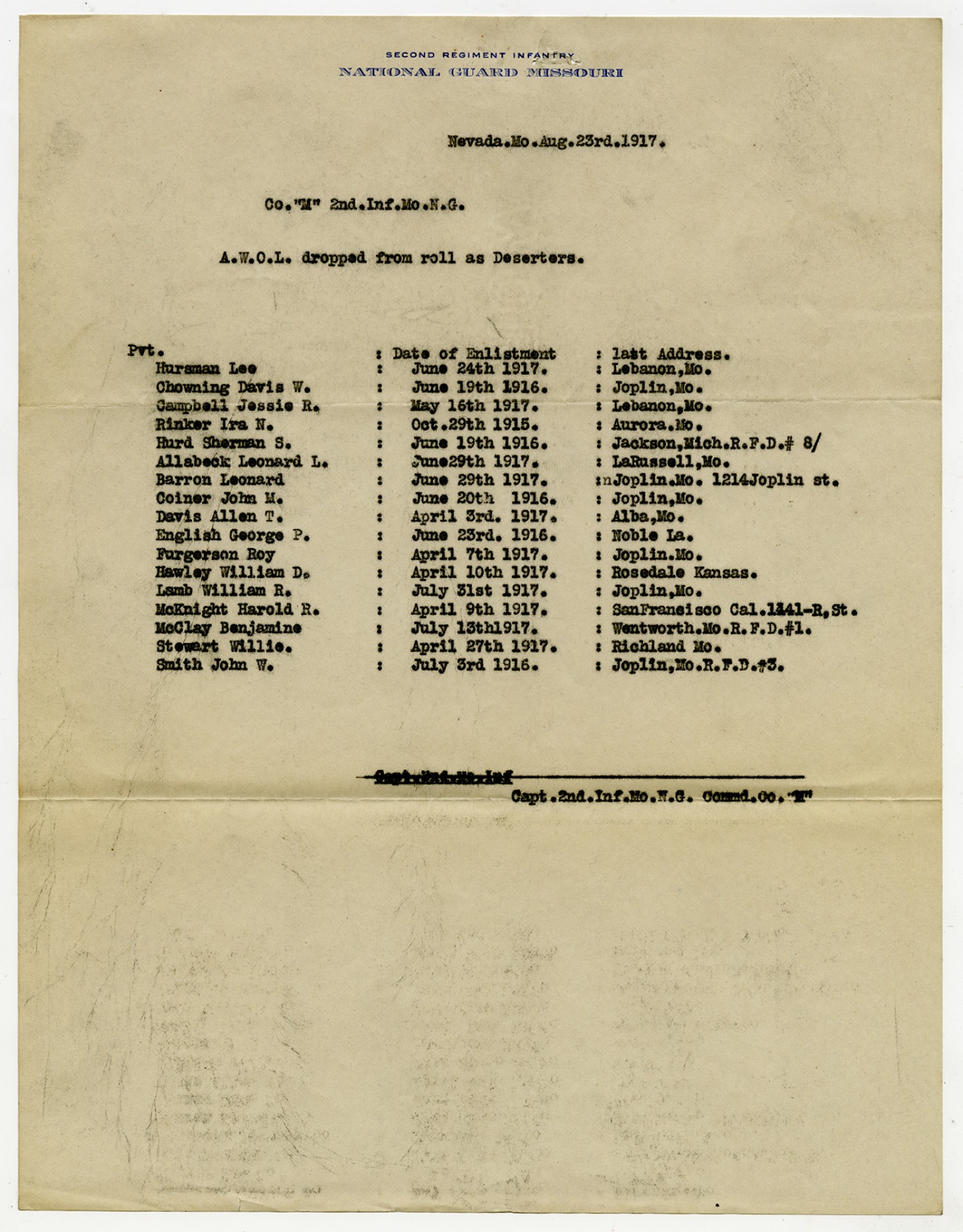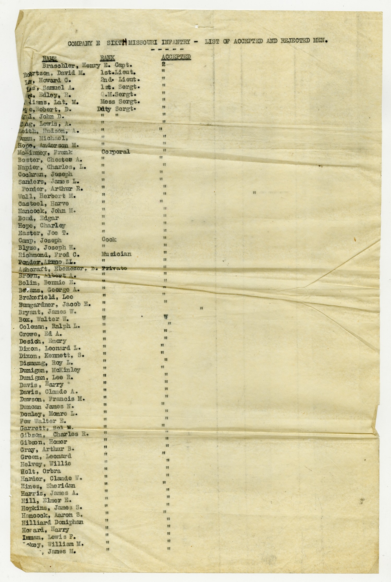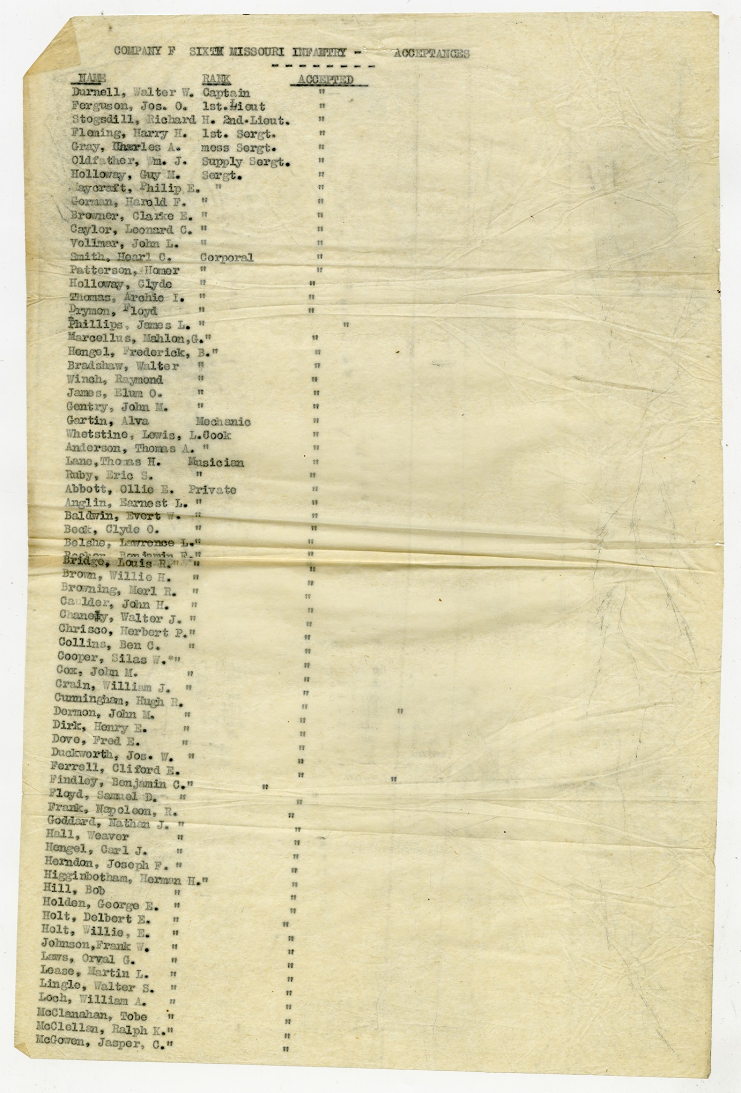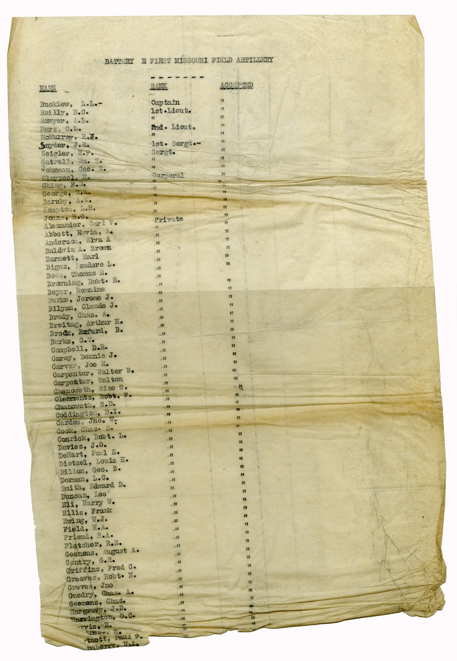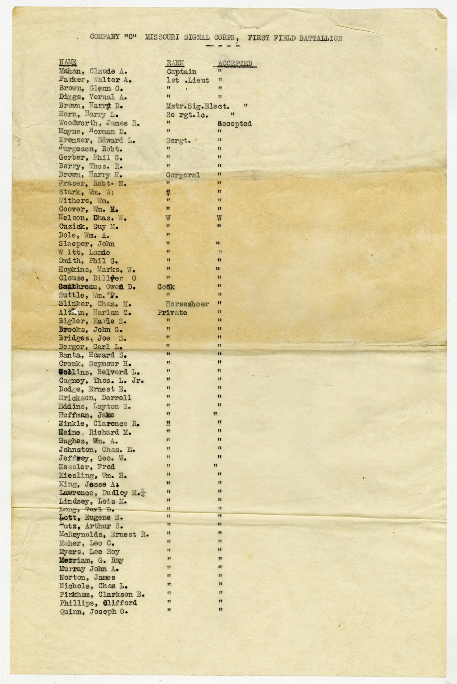 | Source | Missouri National Guard; Military Rosters, Physical Qualifications, List of Officers, List of Acceptances, List of Rejected, Weekly Report, Oath and Contract of Enlistment, Correspondence, List of Deserters, telegrams, and other papers regarding the enlis |