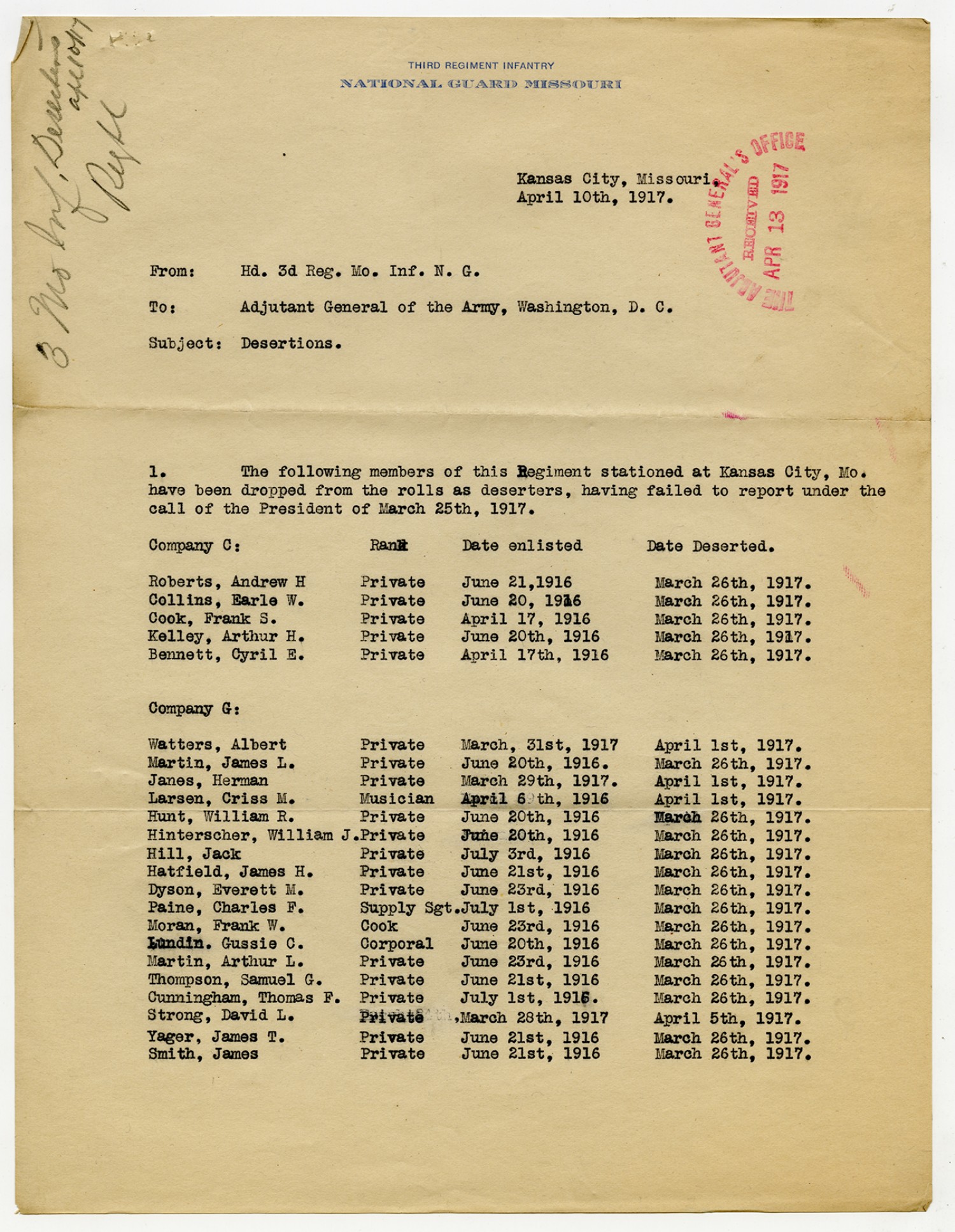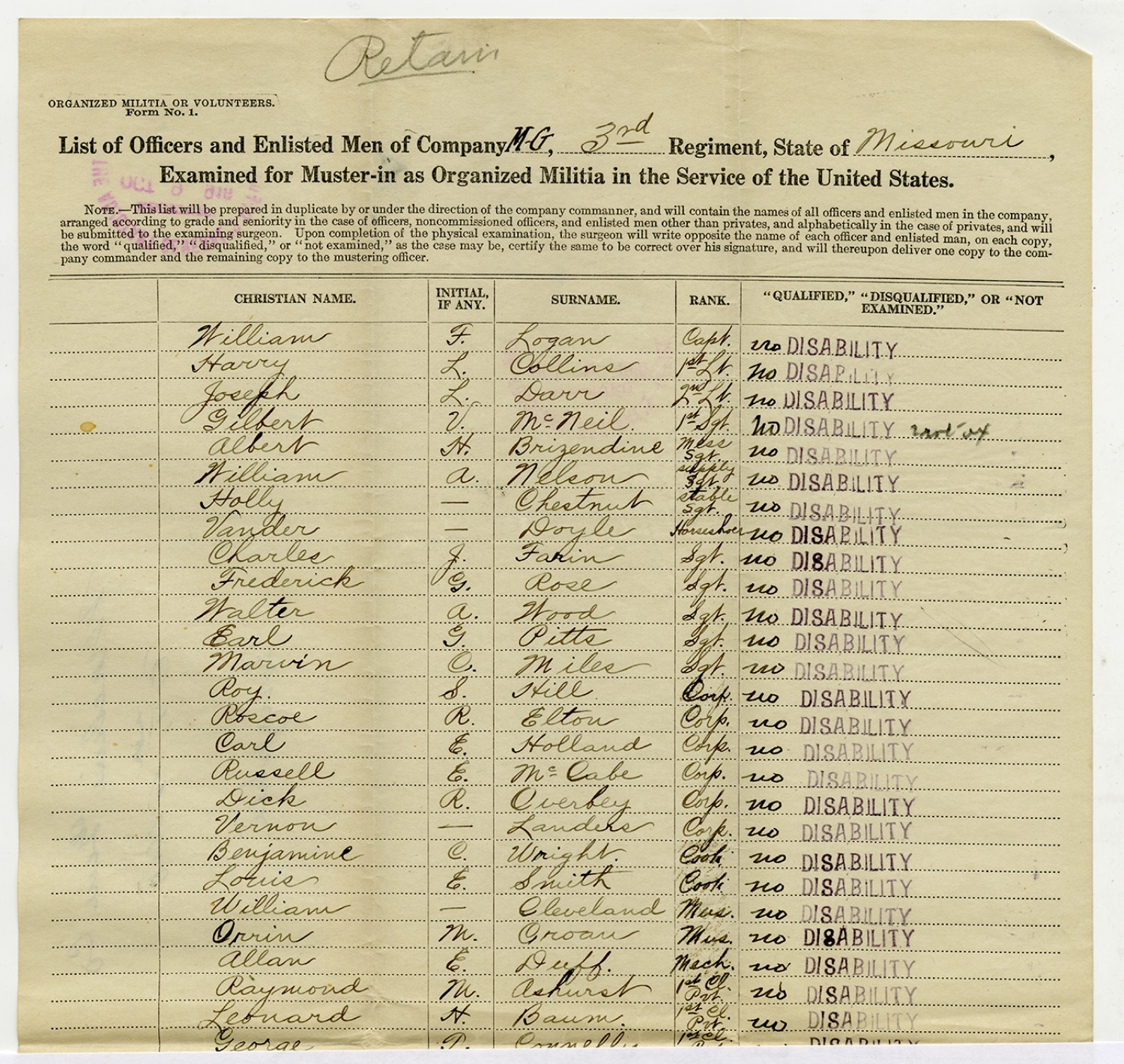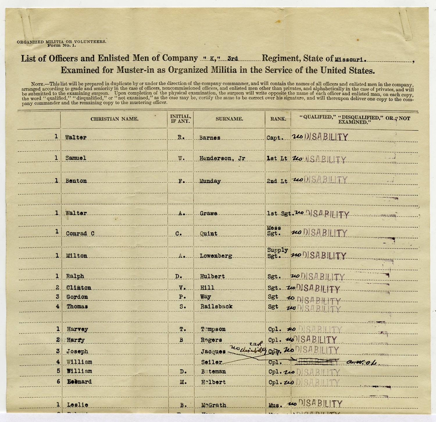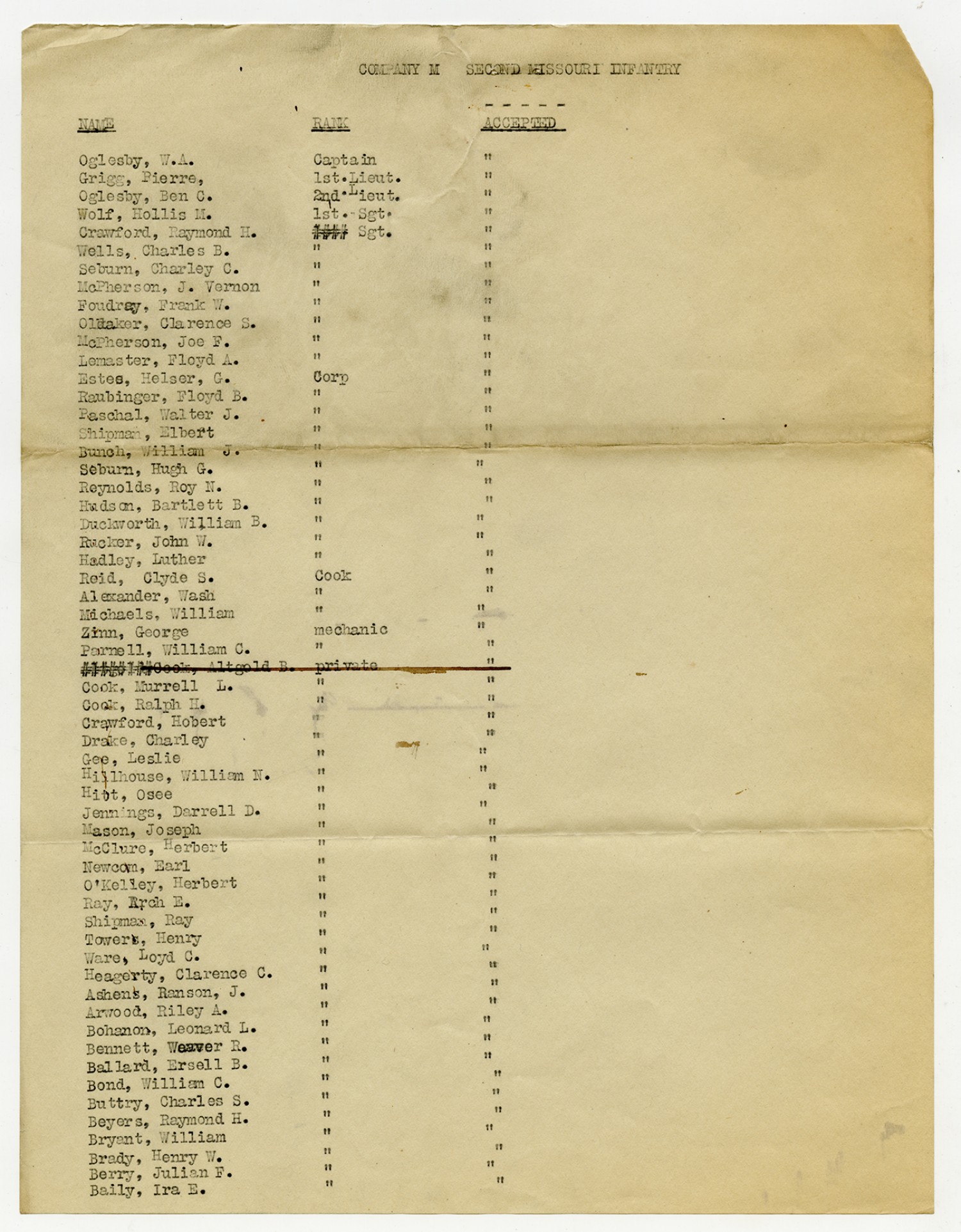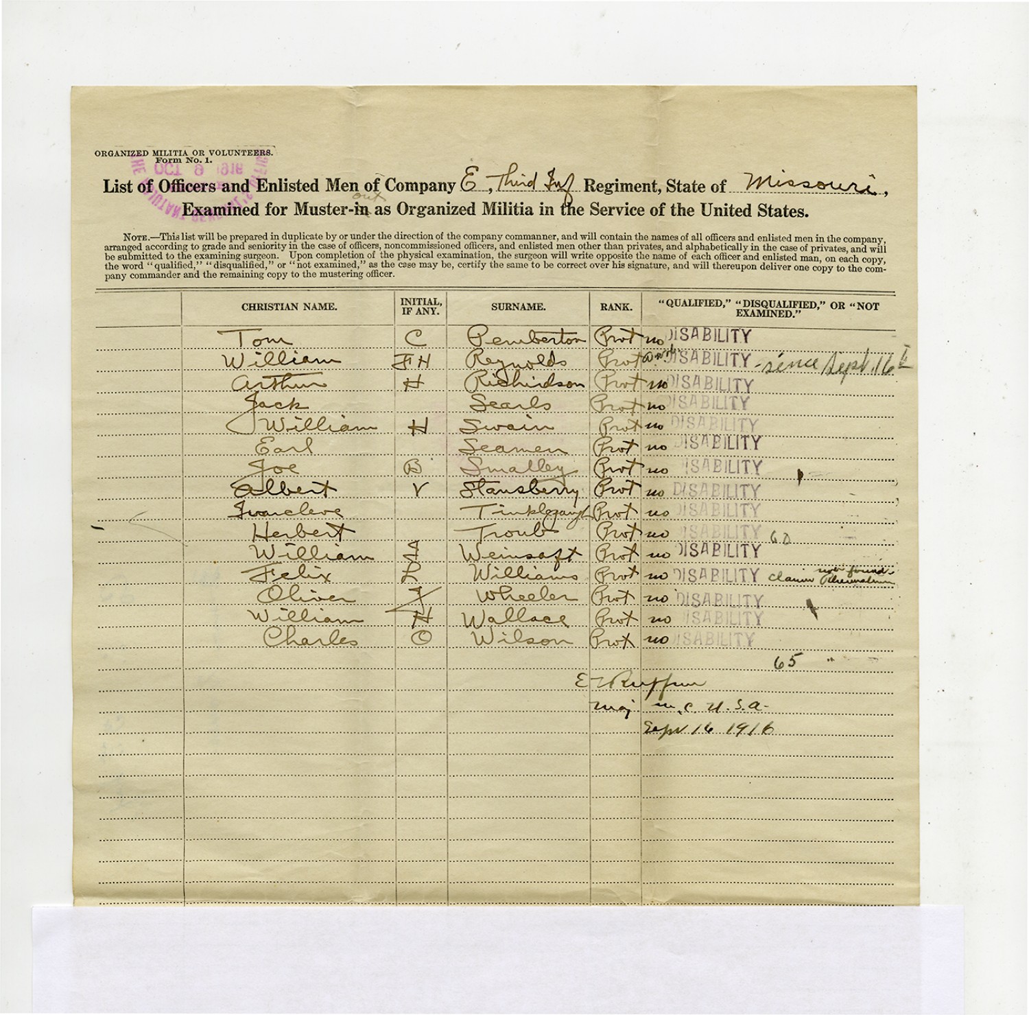 | Source | Missouri National Guard; Military Rosters, Physical Qualifications, List of Officers, List of Acceptances, List of Rejected, Weekly Report, Oath and Contract of Enlistment, Correspondence, List of Deserters, telegrams, and other papers regarding the enlis |