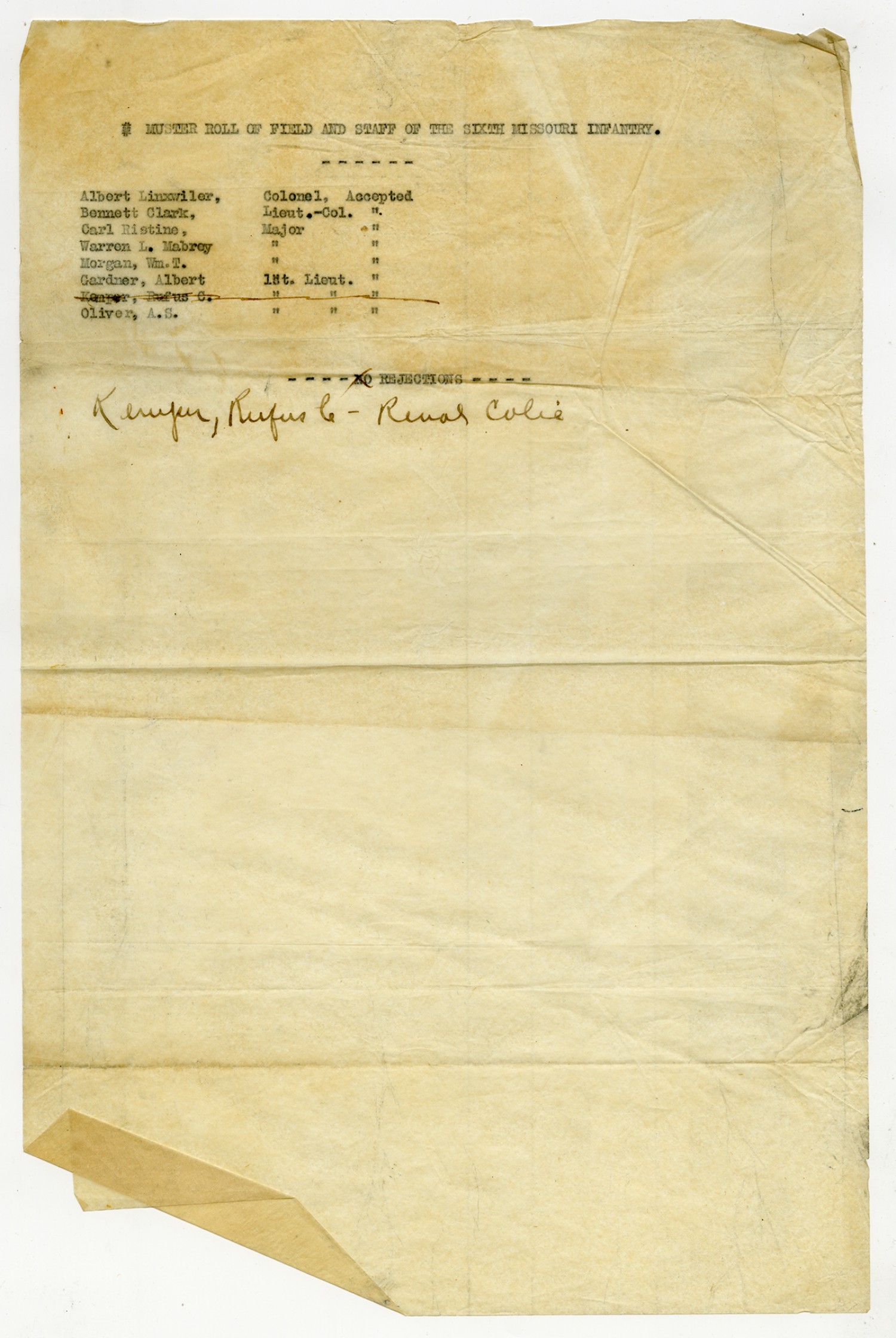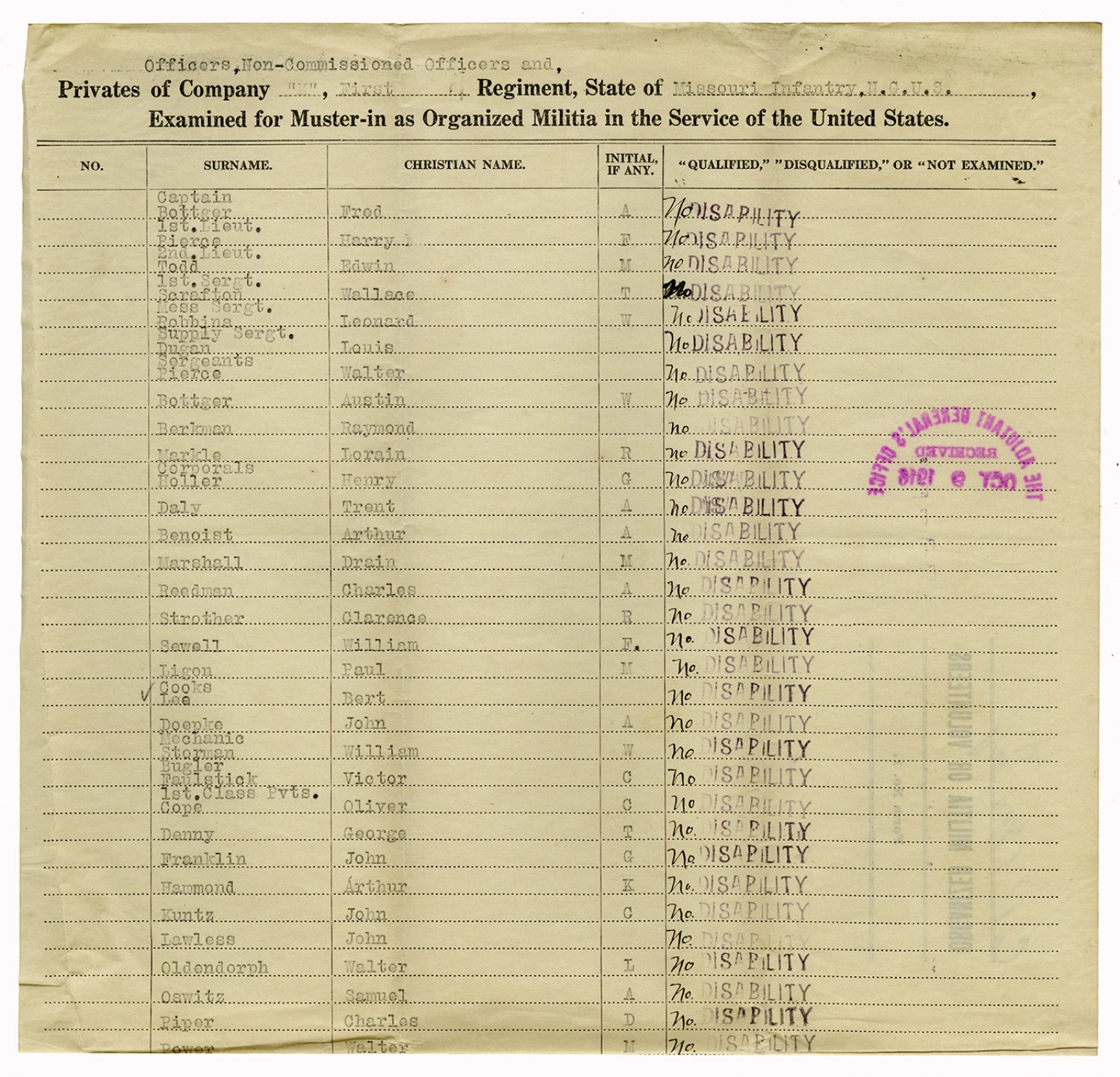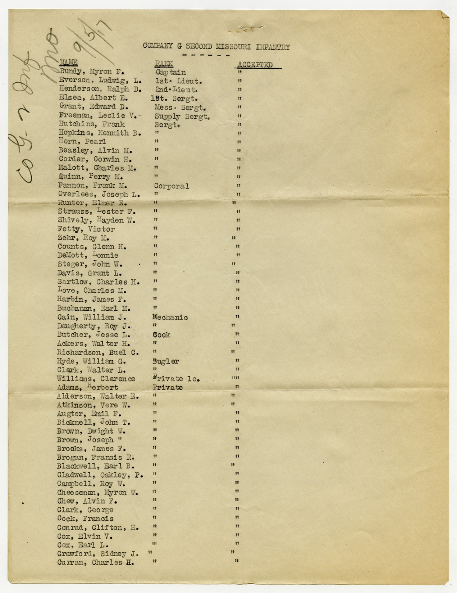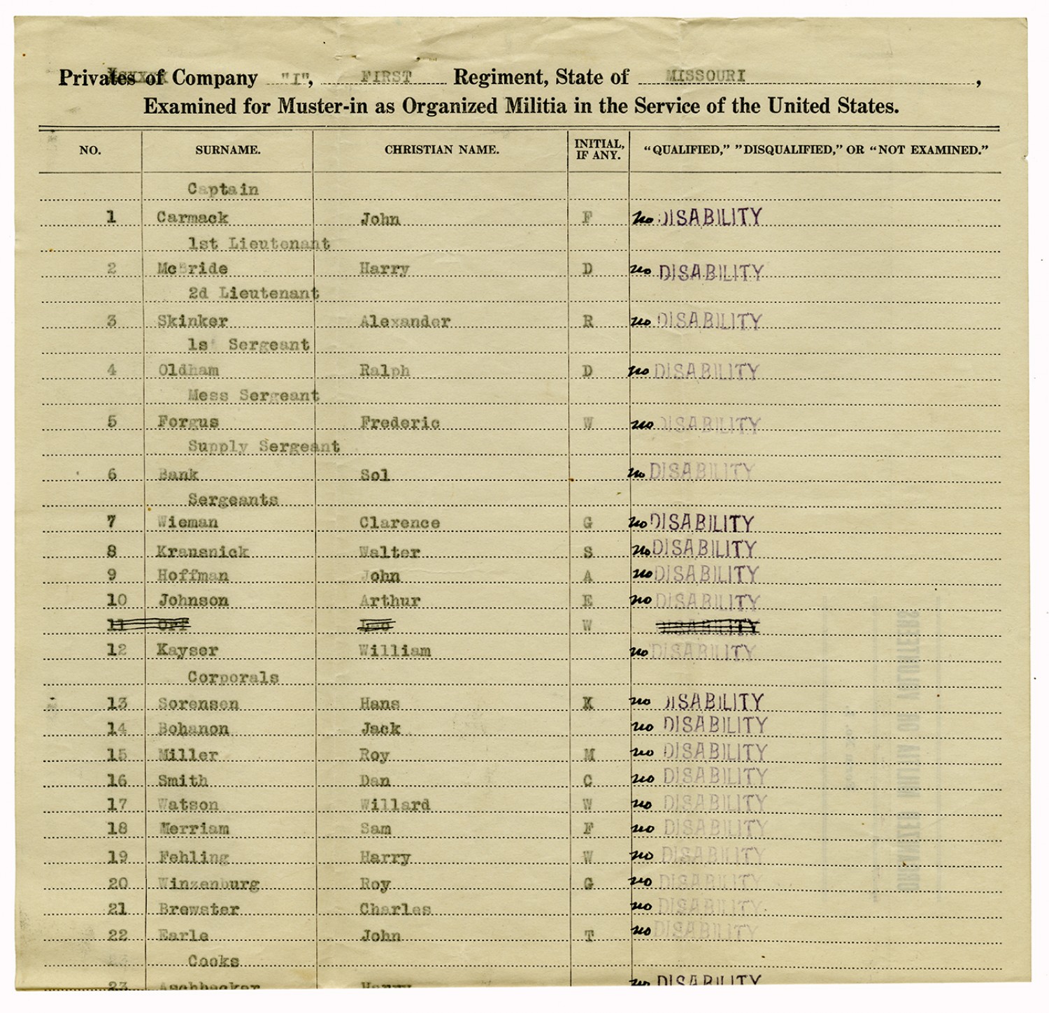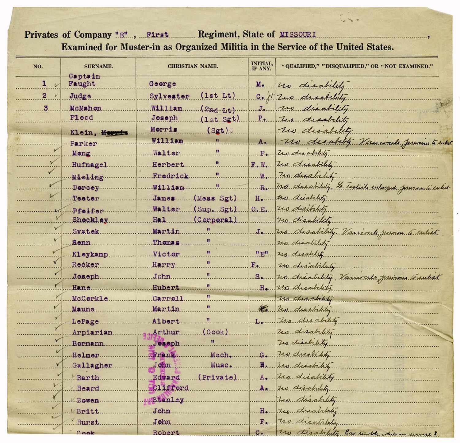 | Source | Missouri National Guard; Military Rosters, Physical Qualifications, List of Officers, List of Acceptances, List of Rejected, Weekly Report, Oath and Contract of Enlistment, Correspondence, List of Deserters, telegrams, and other papers regarding the enlis |