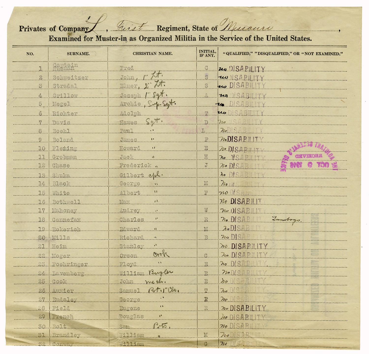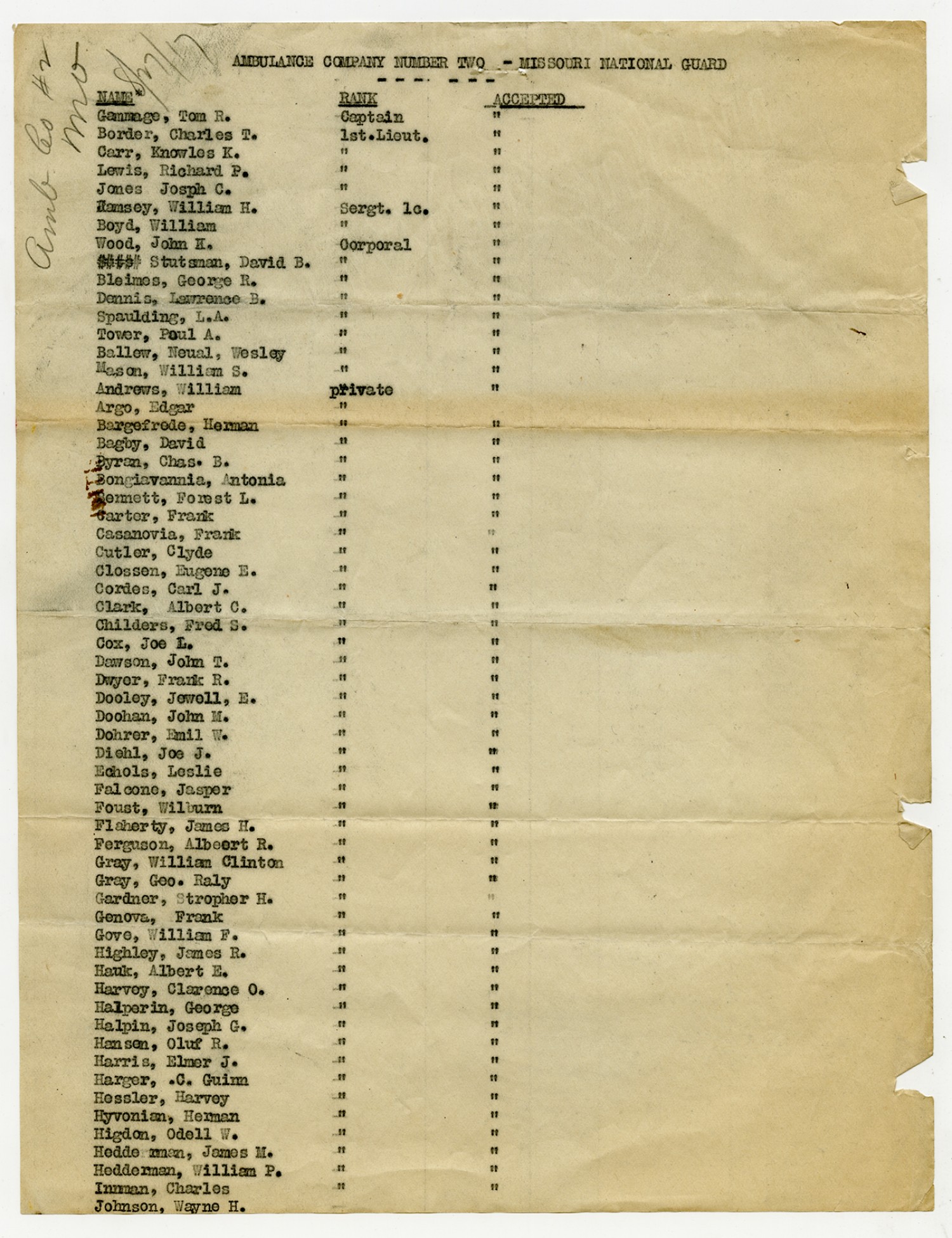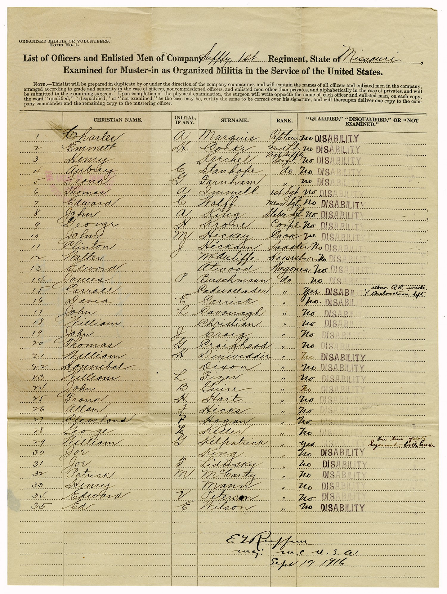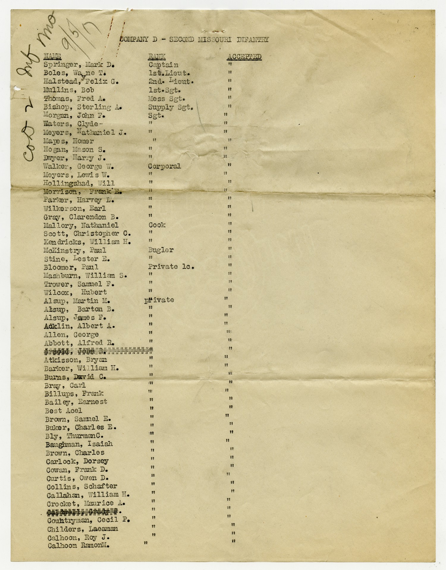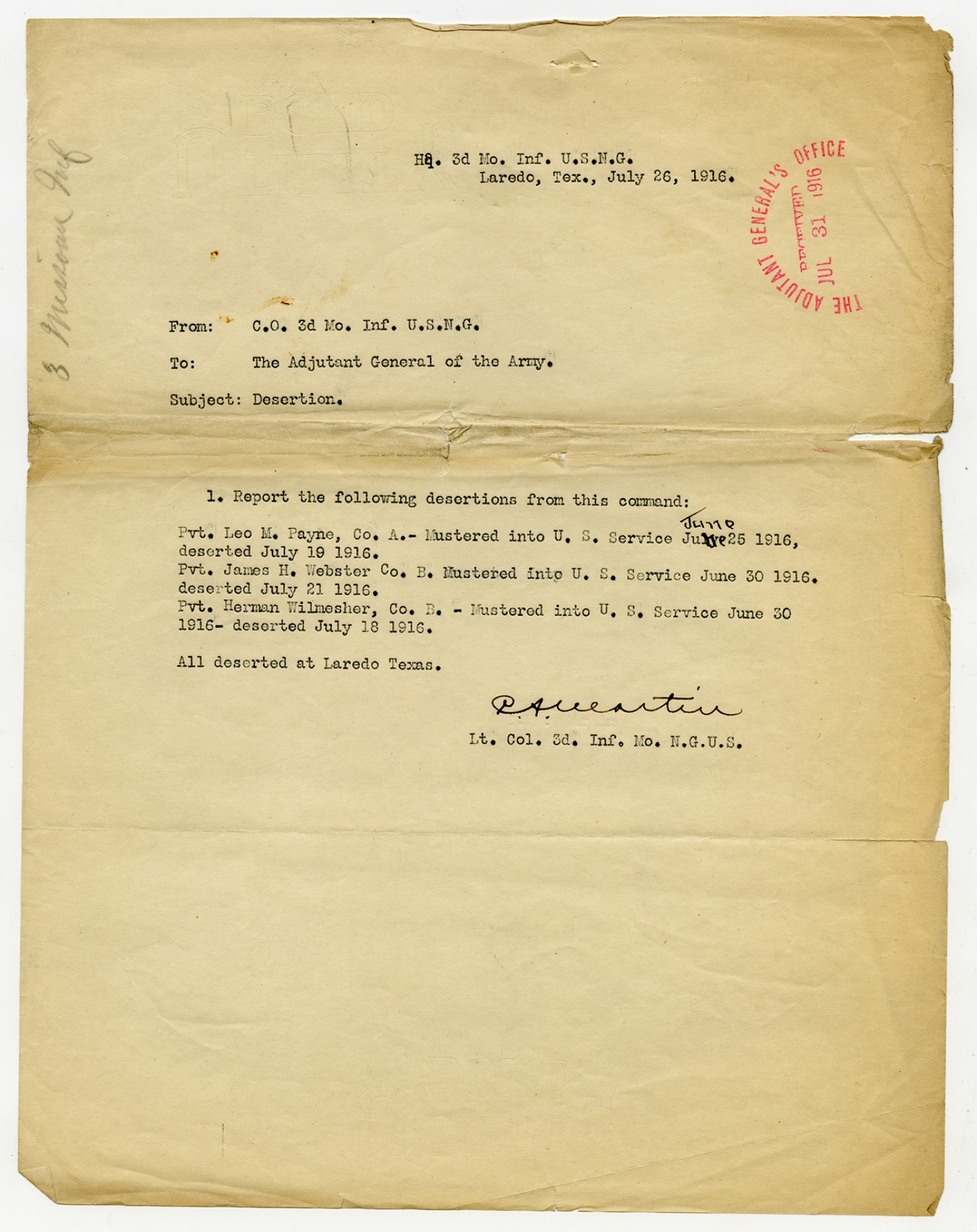 | Source | Missouri National Guard; Military Rosters, Physical Qualifications, List of Officers, List of Acceptances, List of Rejected, Weekly Report, Oath and Contract of Enlistment, Correspondence, List of Deserters, telegrams, and other papers regarding the enlis |