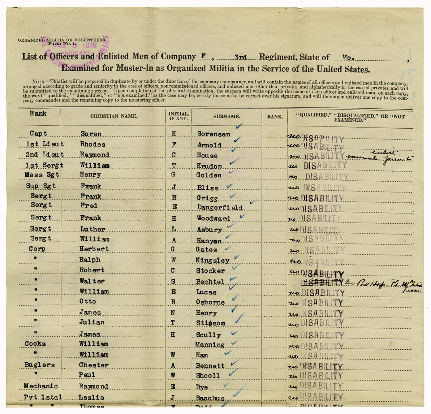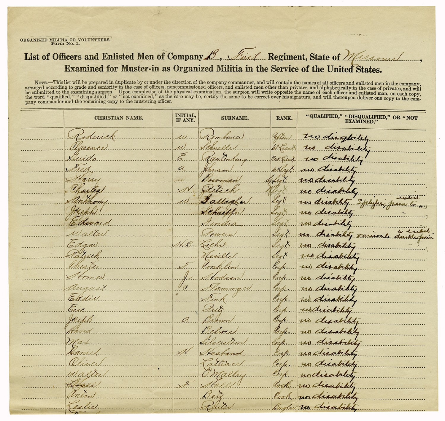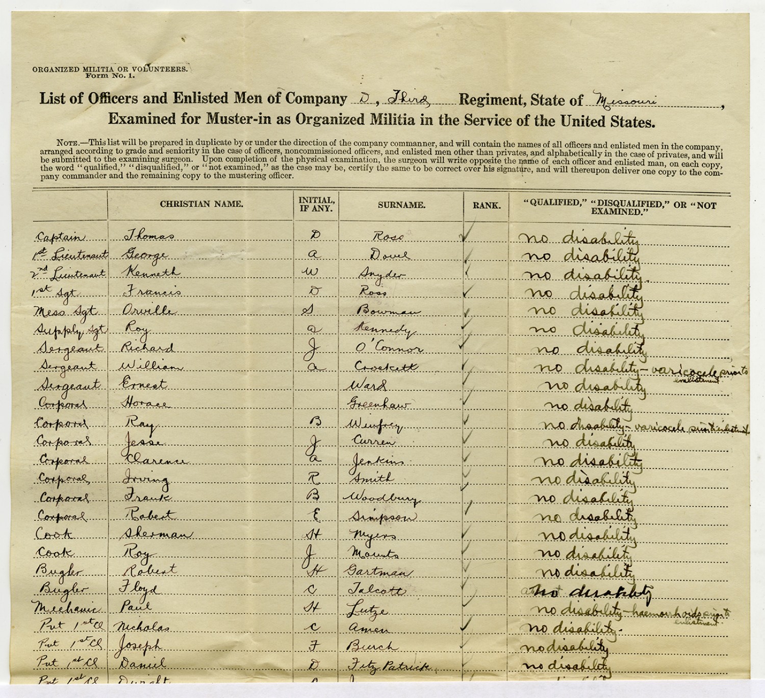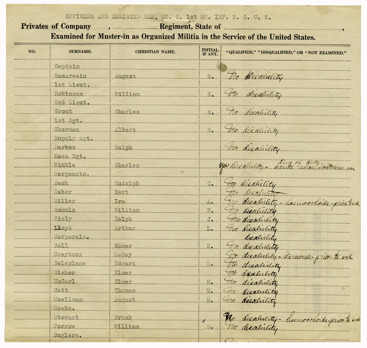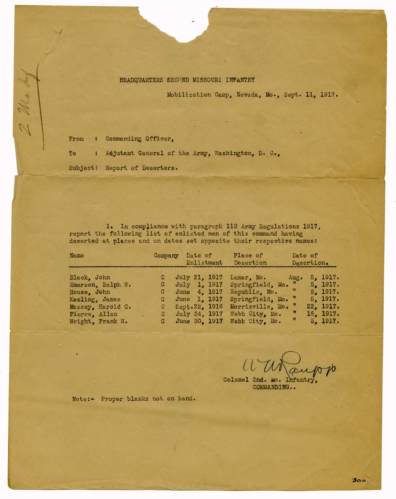 | Source | Missouri National Guard; Military Rosters, Physical Qualifications, List of Officers, List of Acceptances, List of Rejected, Weekly Report, Oath and Contract of Enlistment, Correspondence, List of Deserters, telegrams, and other papers regarding the enlis |