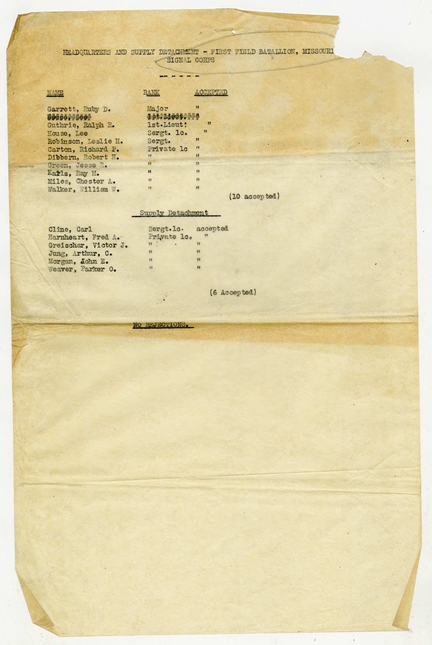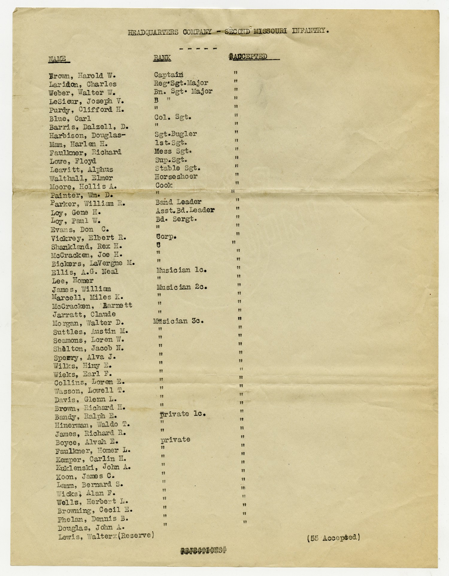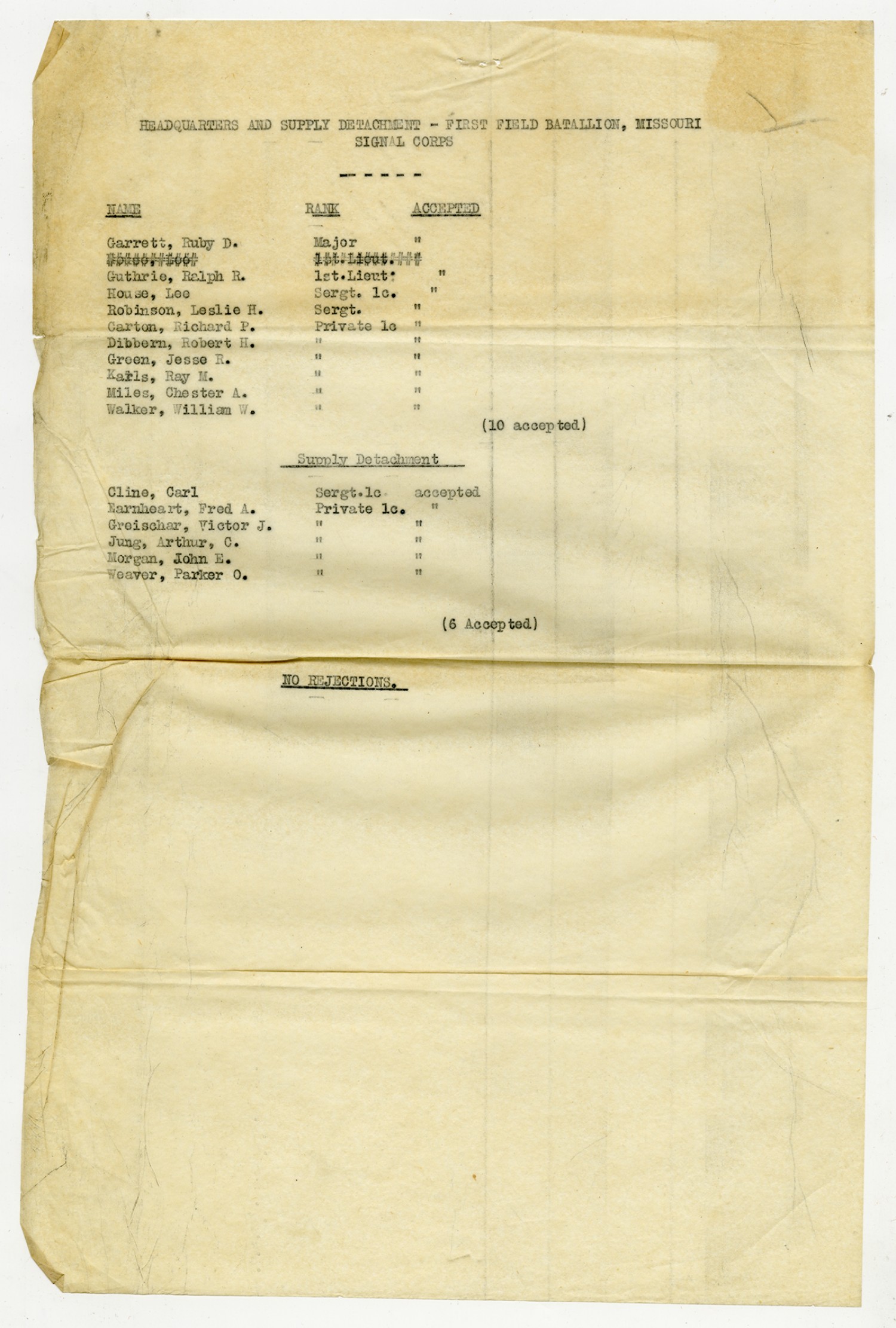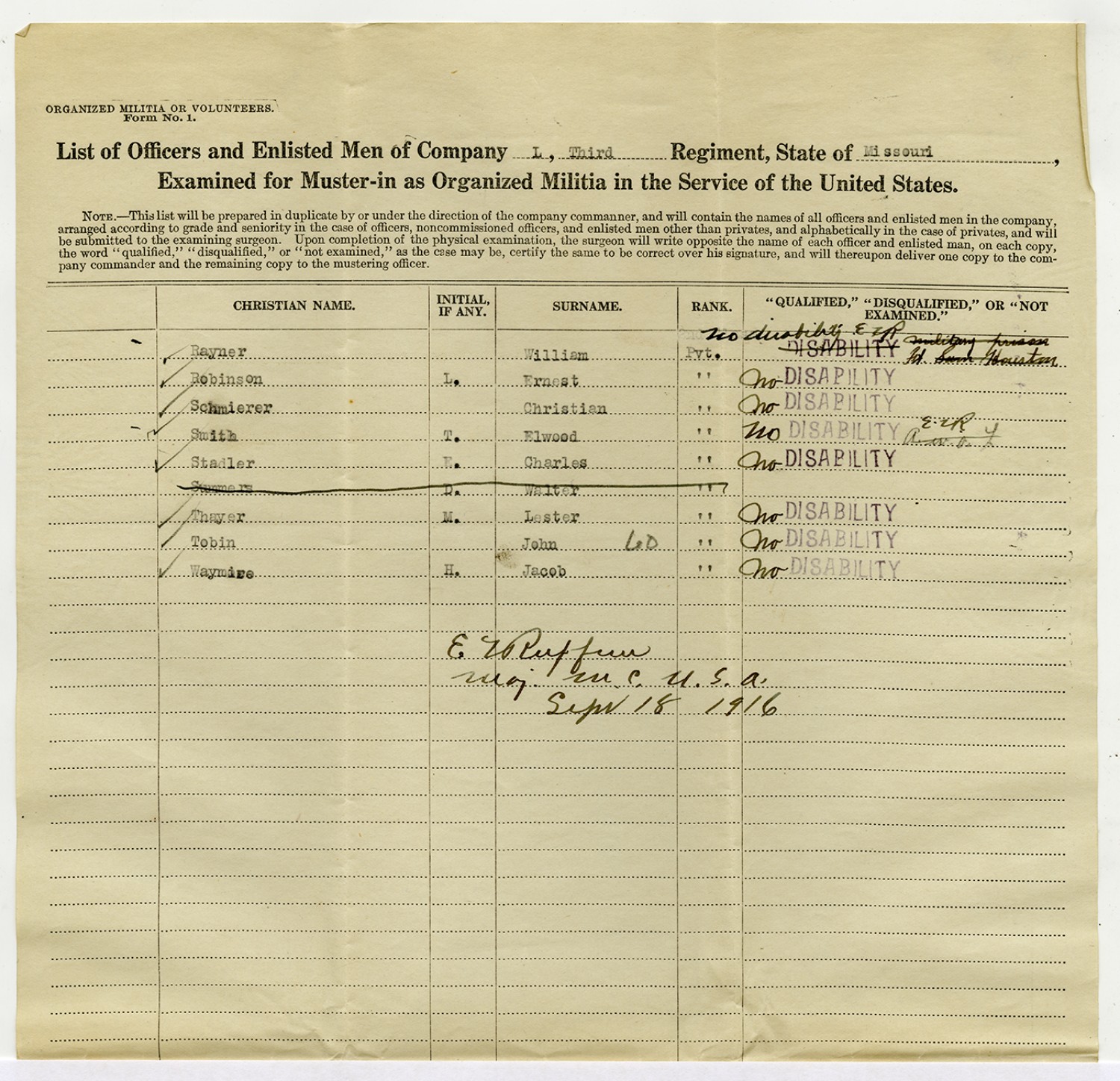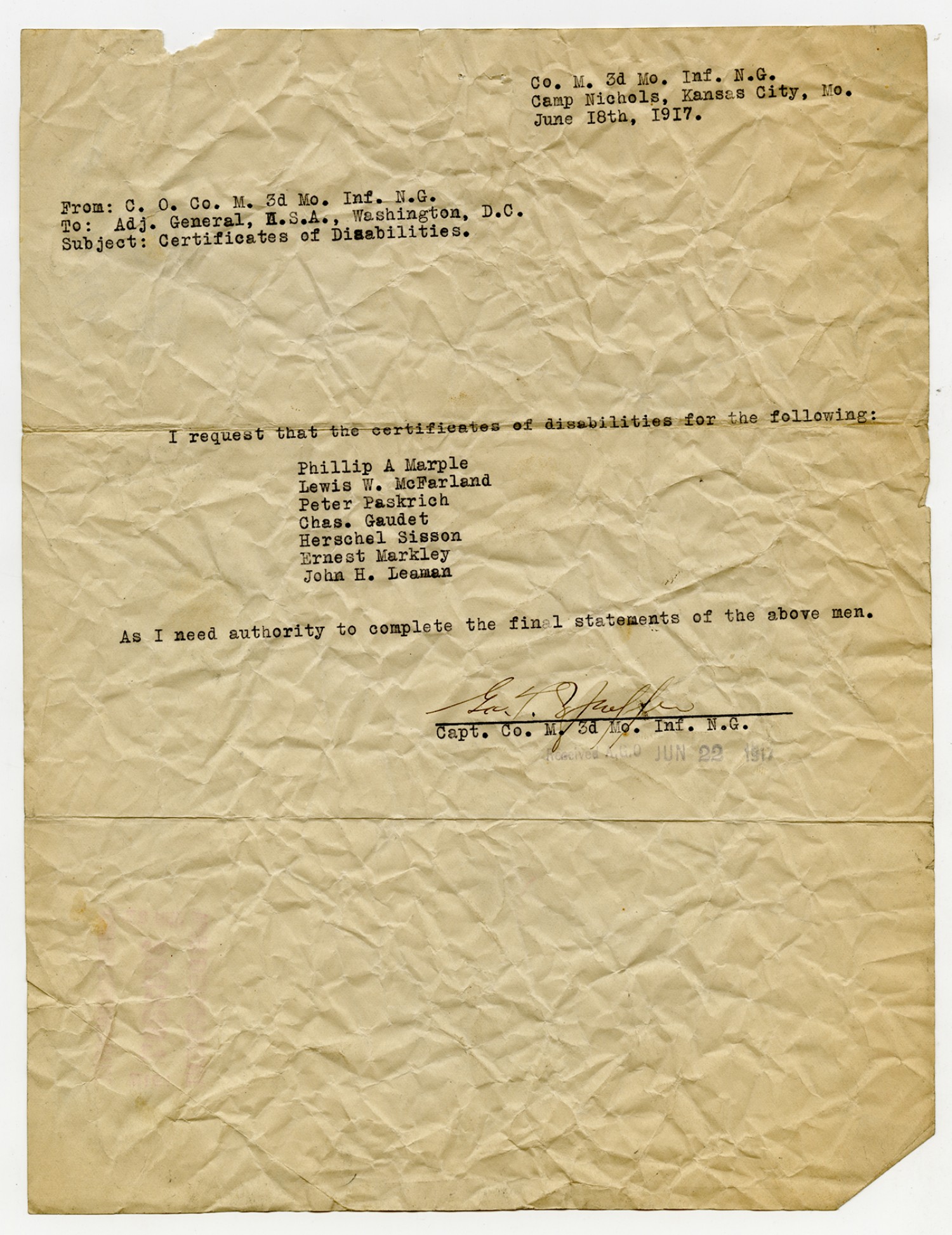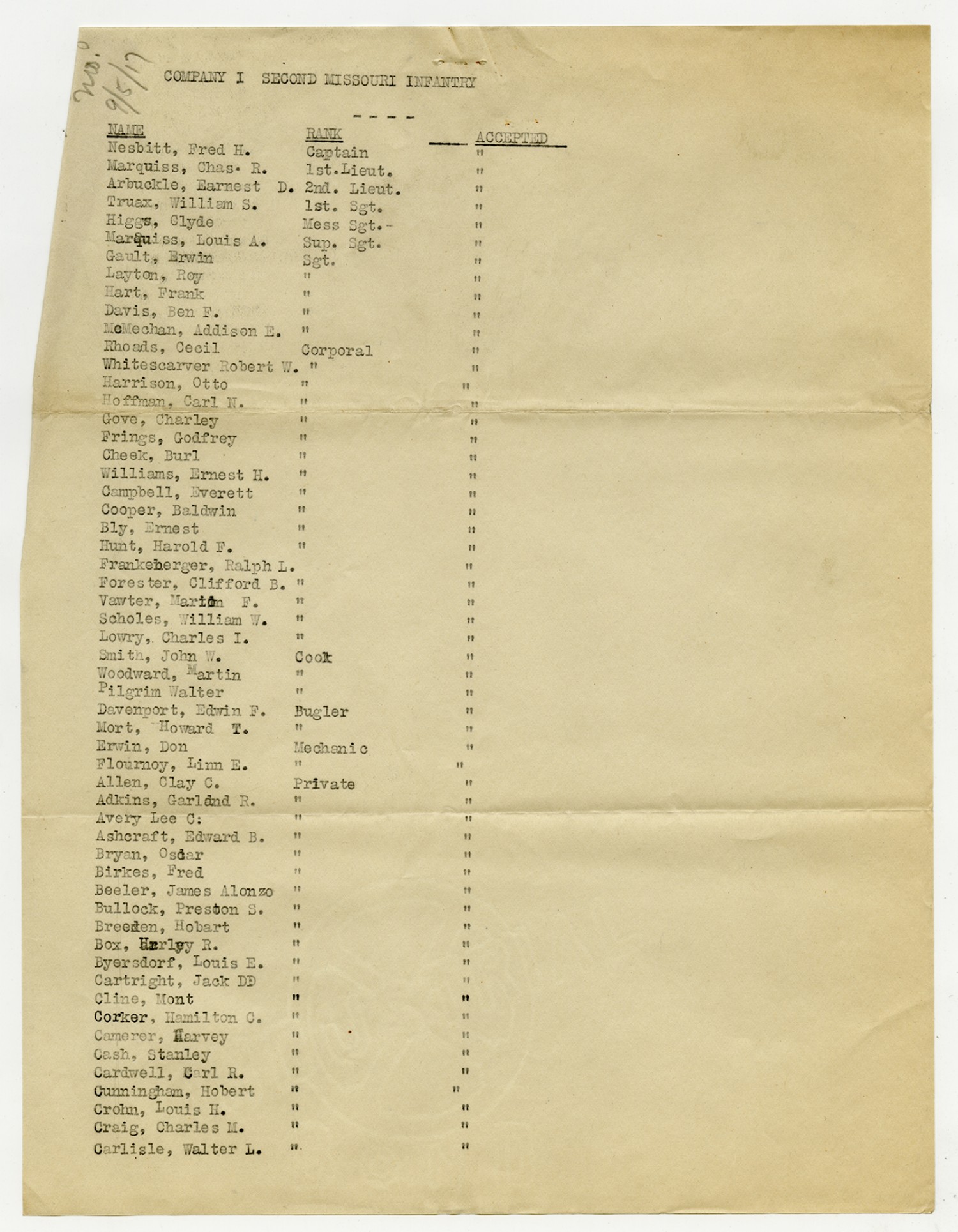 | Source | Missouri National Guard; Military Rosters, Physical Qualifications, List of Officers, List of Acceptances, List of Rejected, Weekly Report, Oath and Contract of Enlistment, Correspondence, List of Deserters, telegrams, and other papers regarding the enlis |