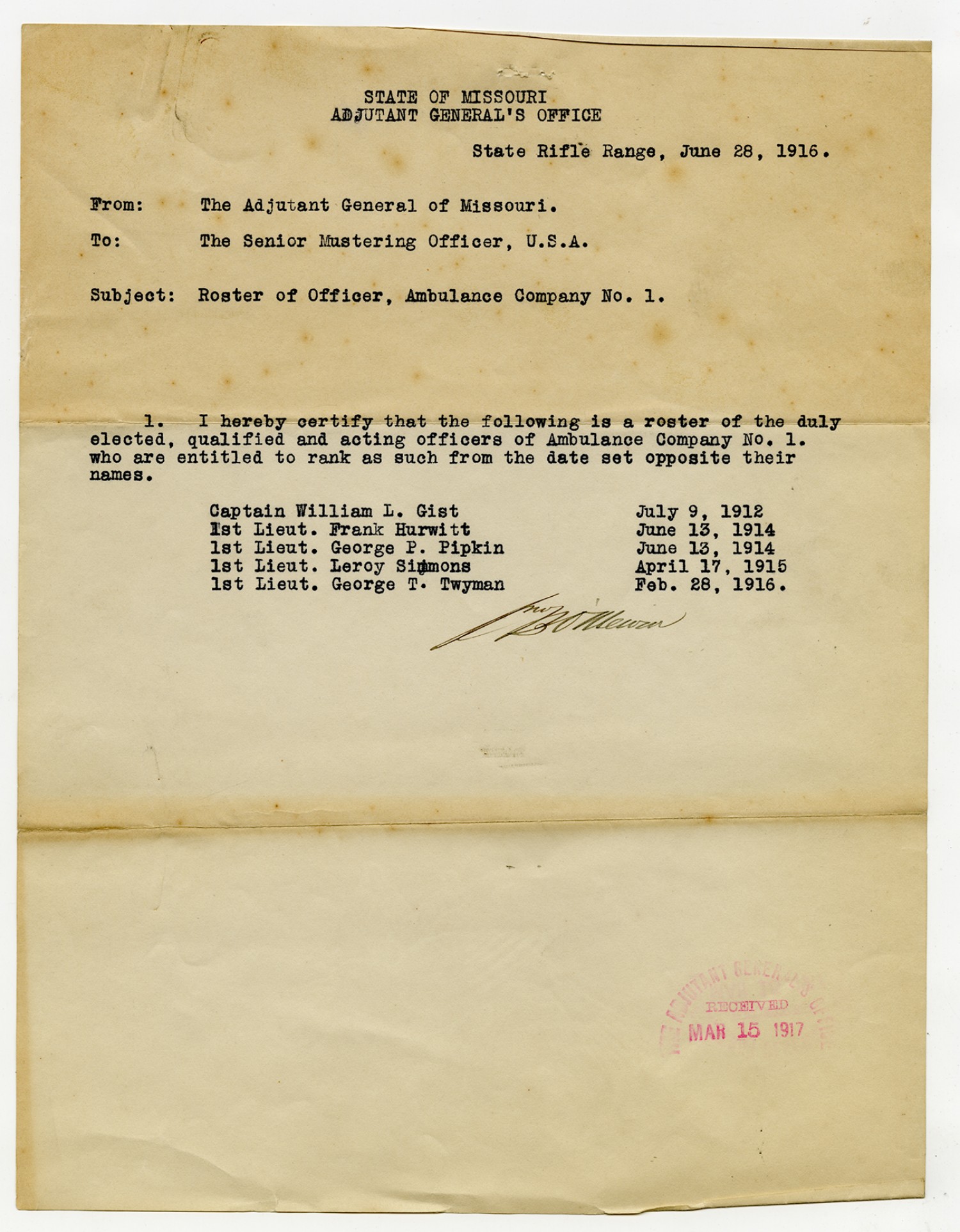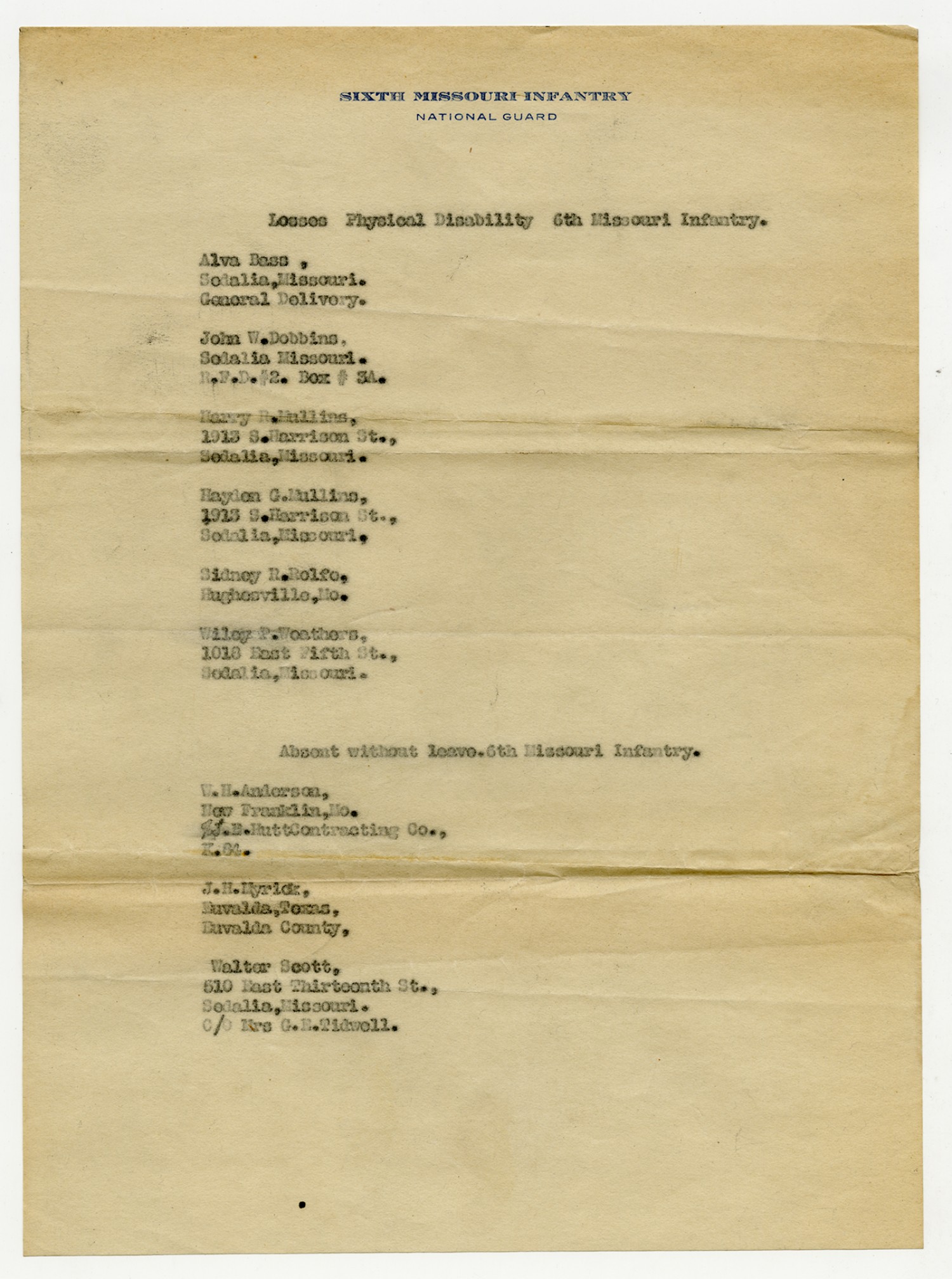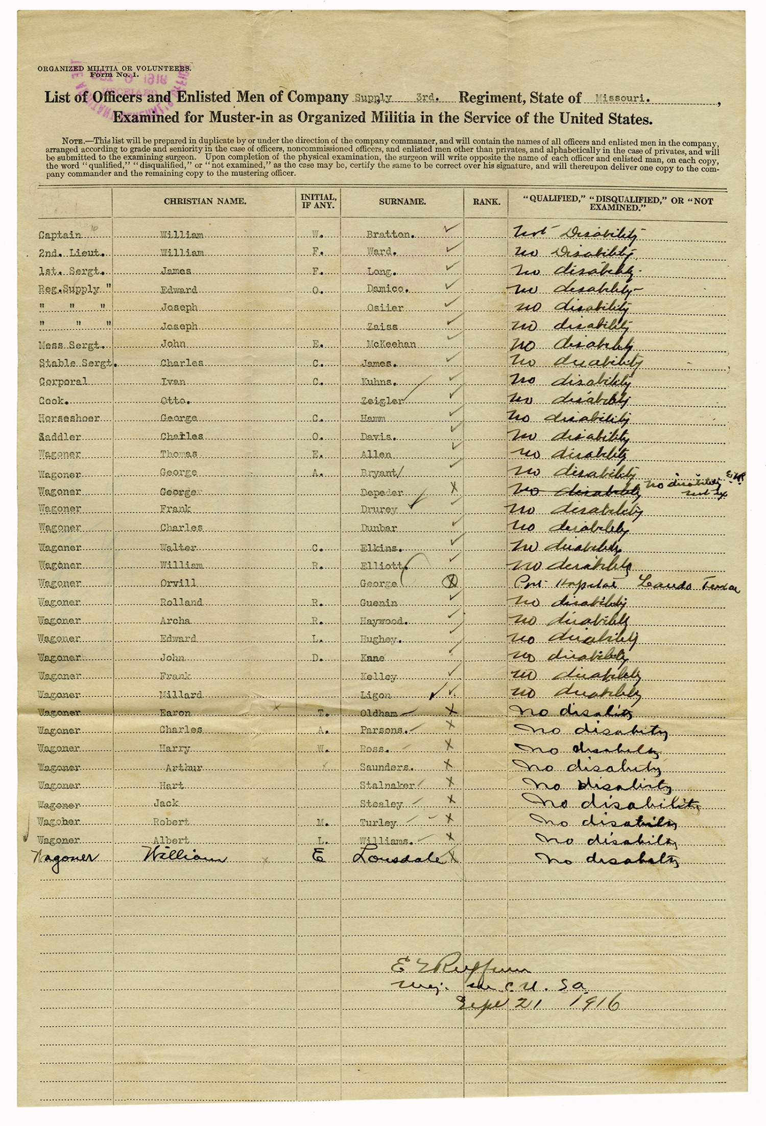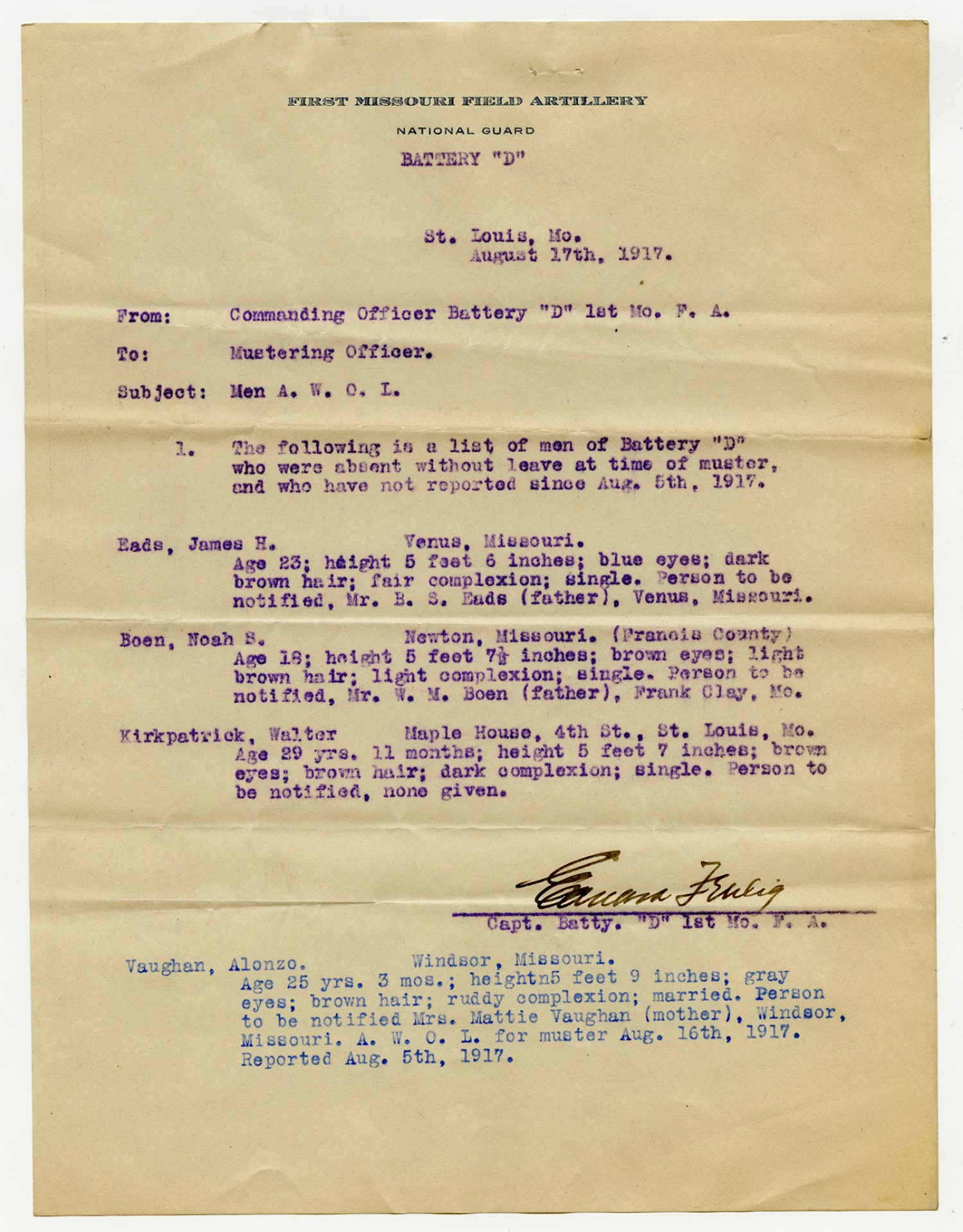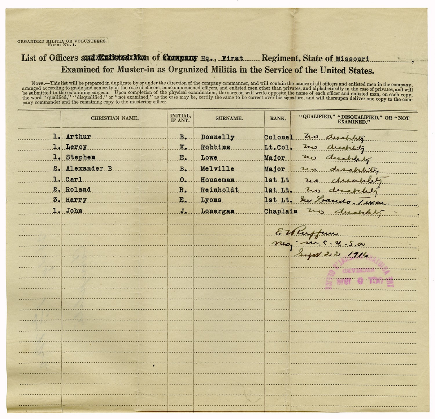 | Source | Missouri National Guard; Military Rosters, Physical Qualifications, List of Officers, List of Acceptances, List of Rejected, Weekly Report, Oath and Contract of Enlistment, Correspondence, List of Deserters, telegrams, and other papers regarding the enlis |