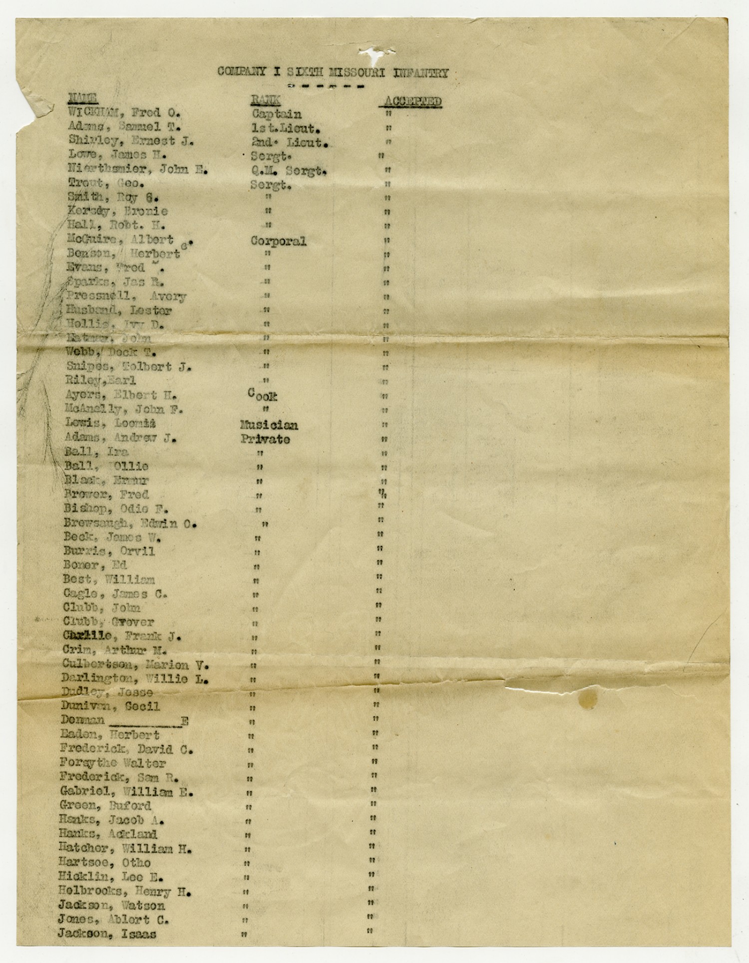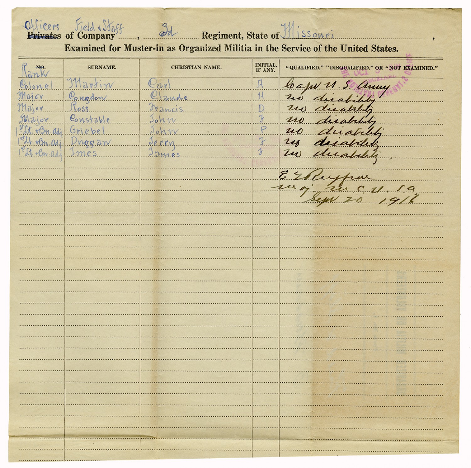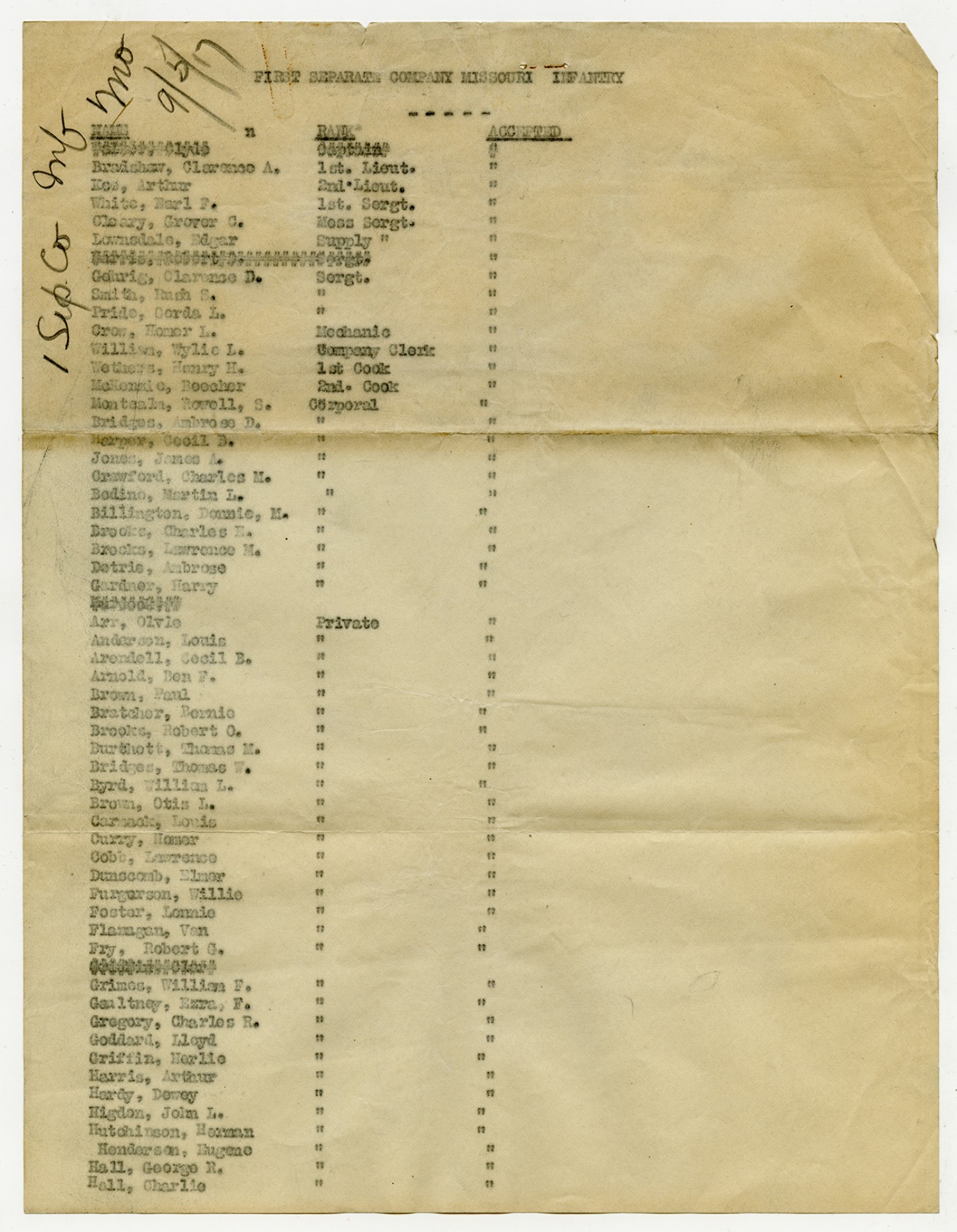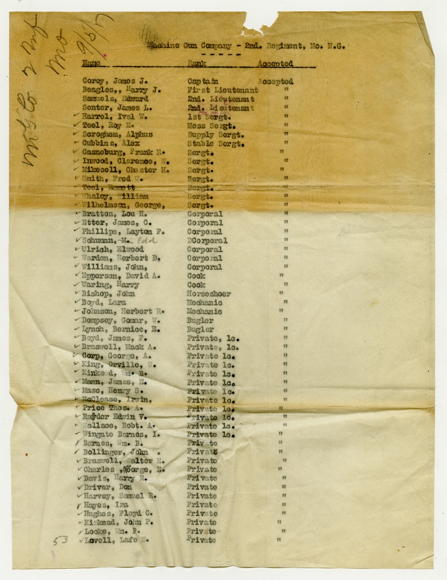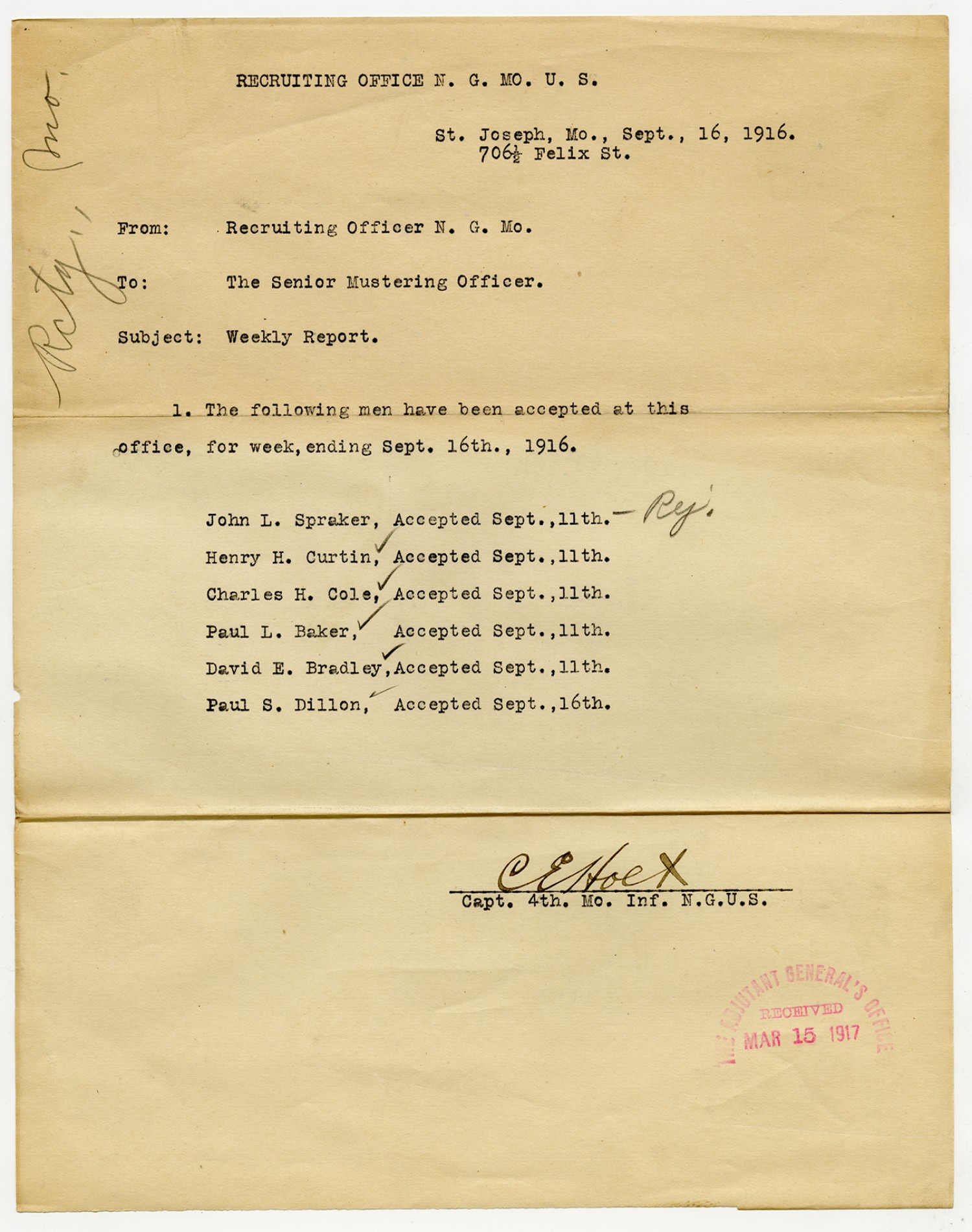 | Source | Missouri National Guard; Military Rosters, Physical Qualifications, List of Officers, List of Acceptances, List of Rejected, Weekly Report, Oath and Contract of Enlistment, Correspondence, List of Deserters, telegrams, and other papers regarding the enlis |