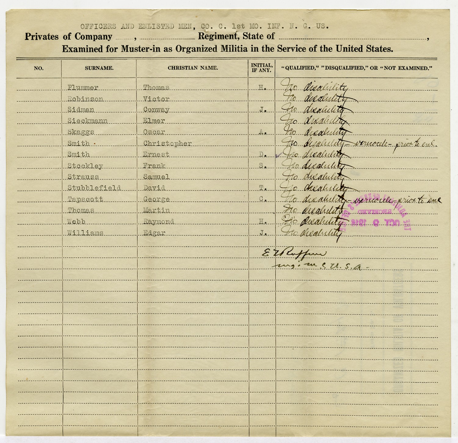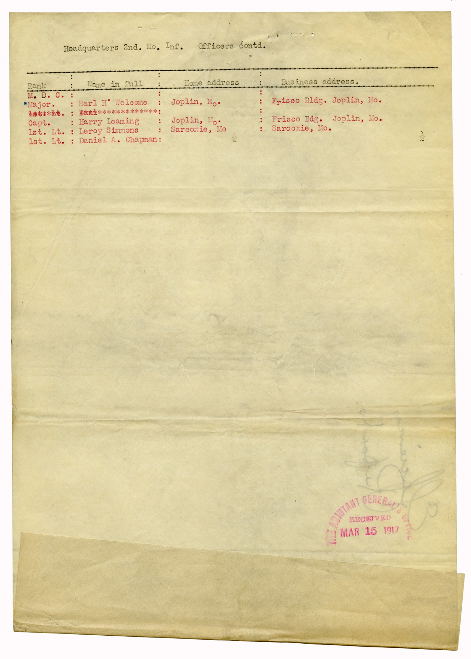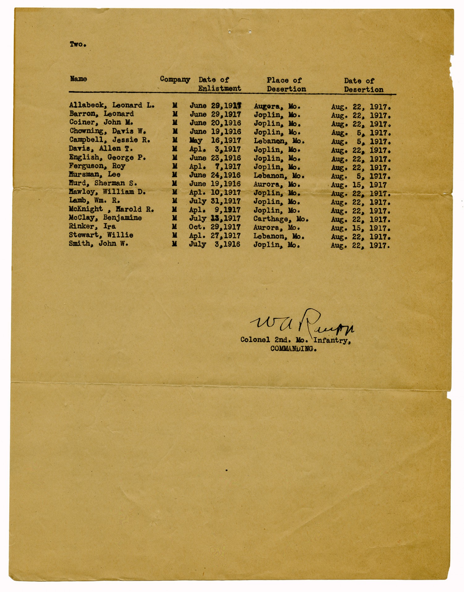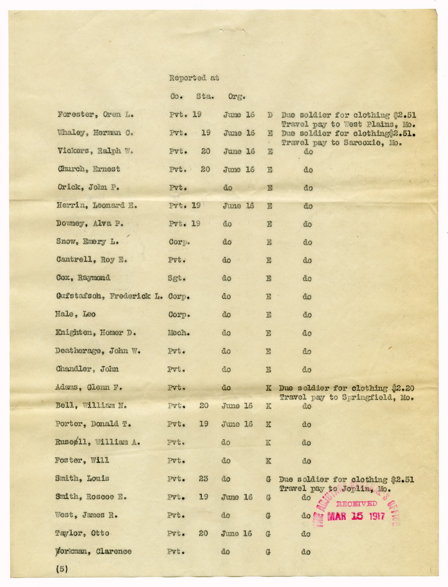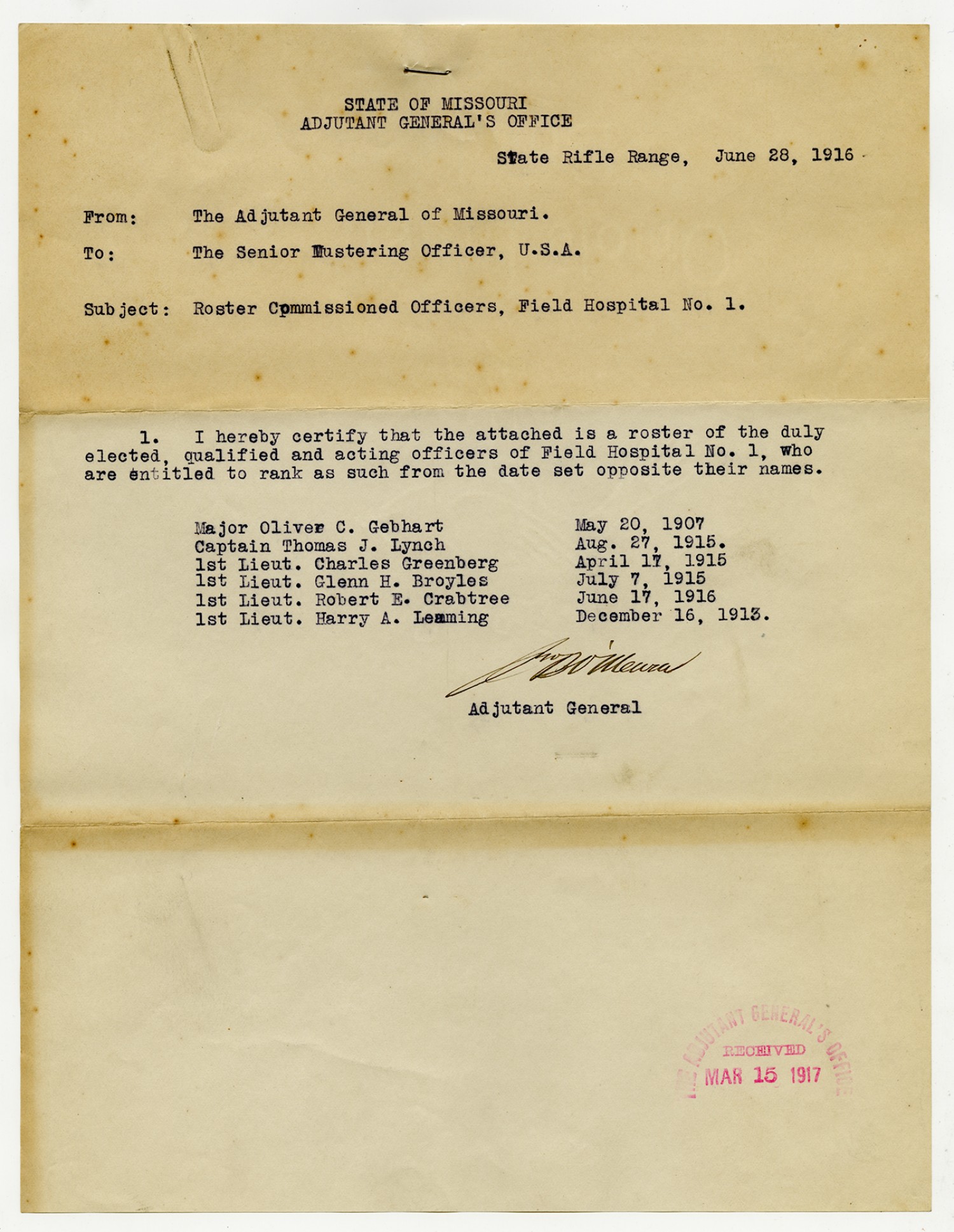 | Source | Missouri National Guard; Military Rosters, Physical Qualifications, List of Officers, List of Acceptances, List of Rejected, Weekly Report, Oath and Contract of Enlistment, Correspondence, List of Deserters, telegrams, and other papers regarding the enlis |
