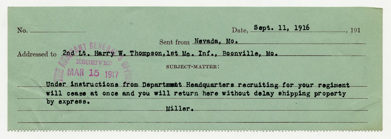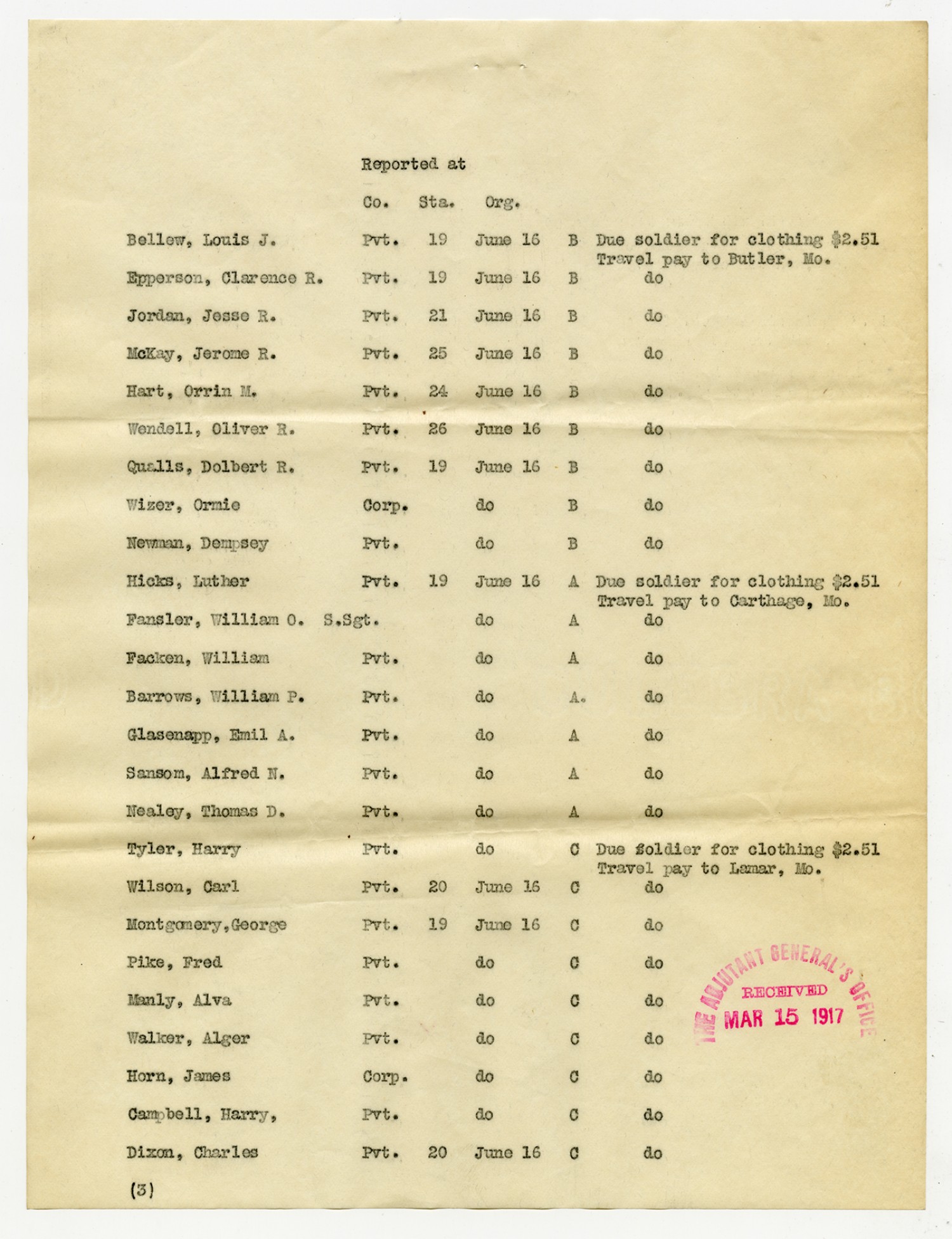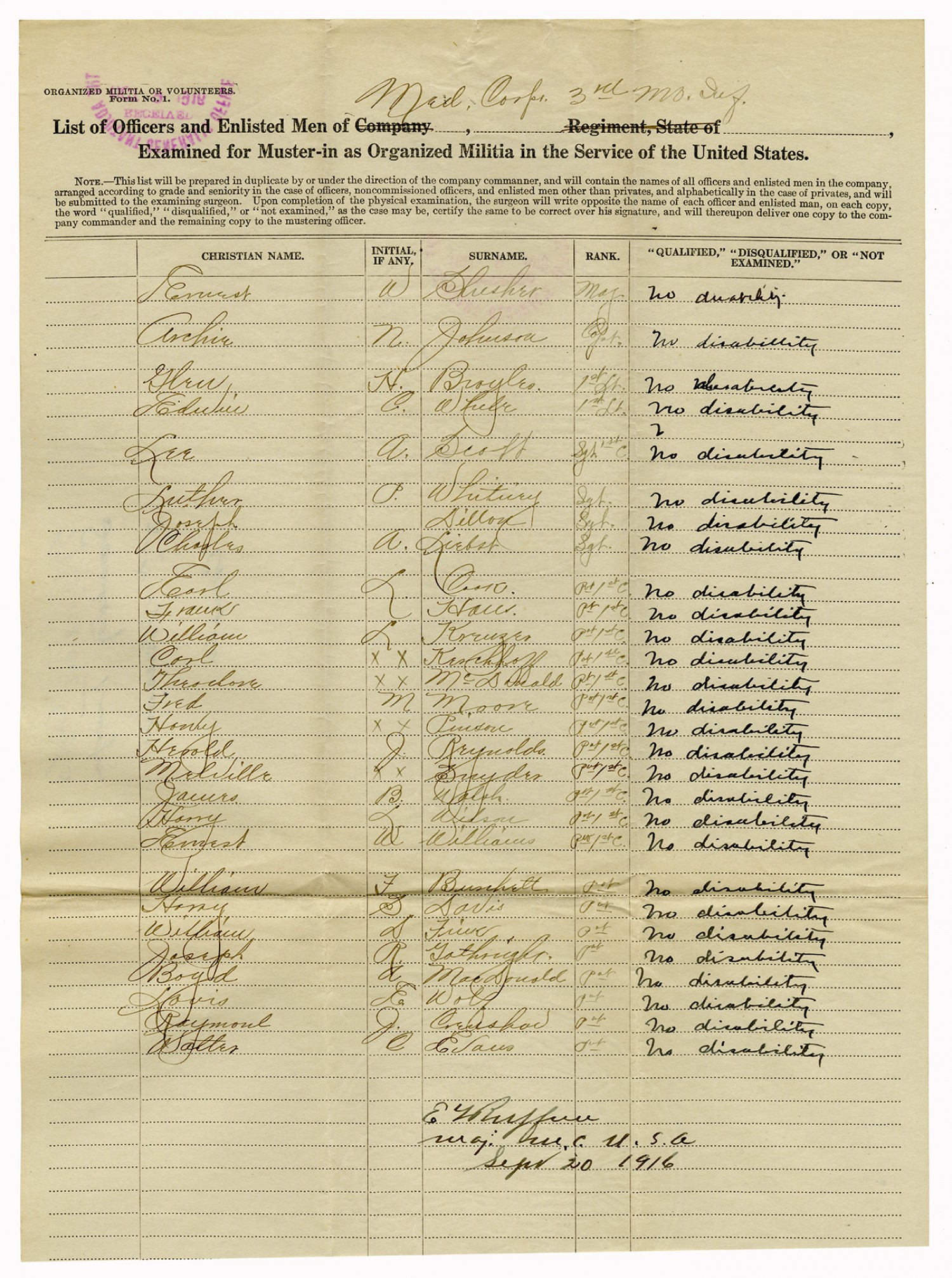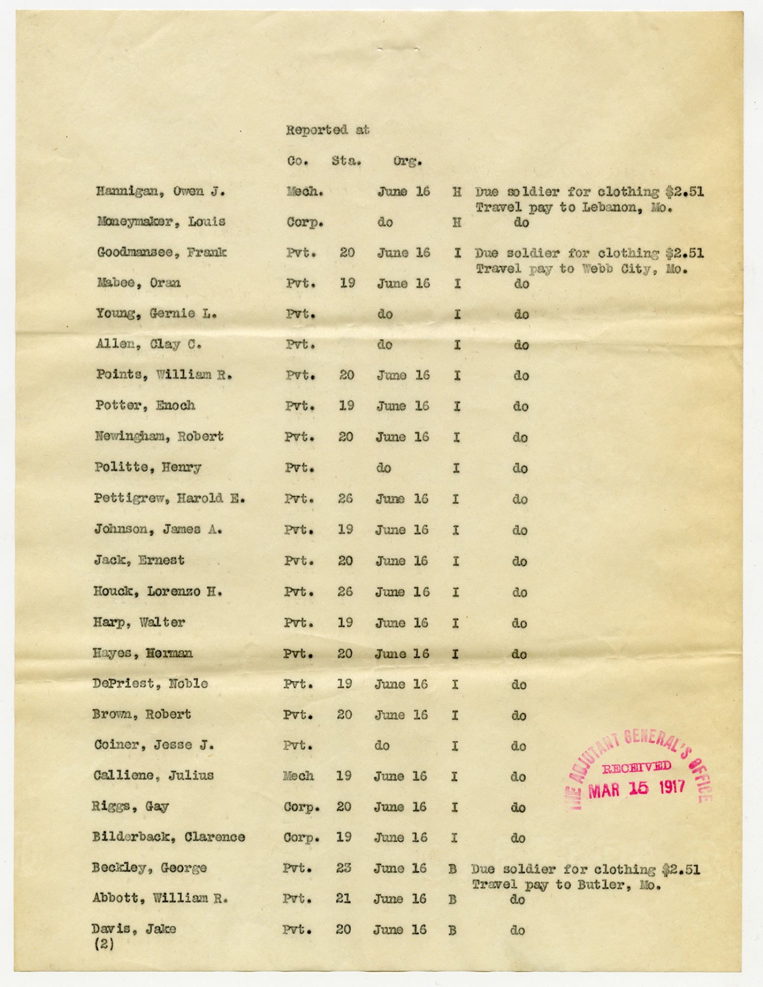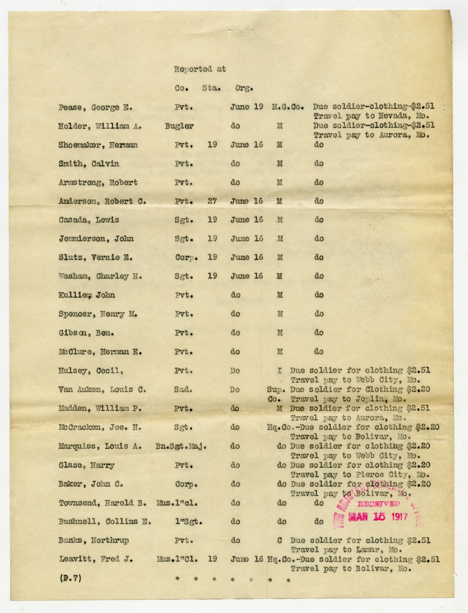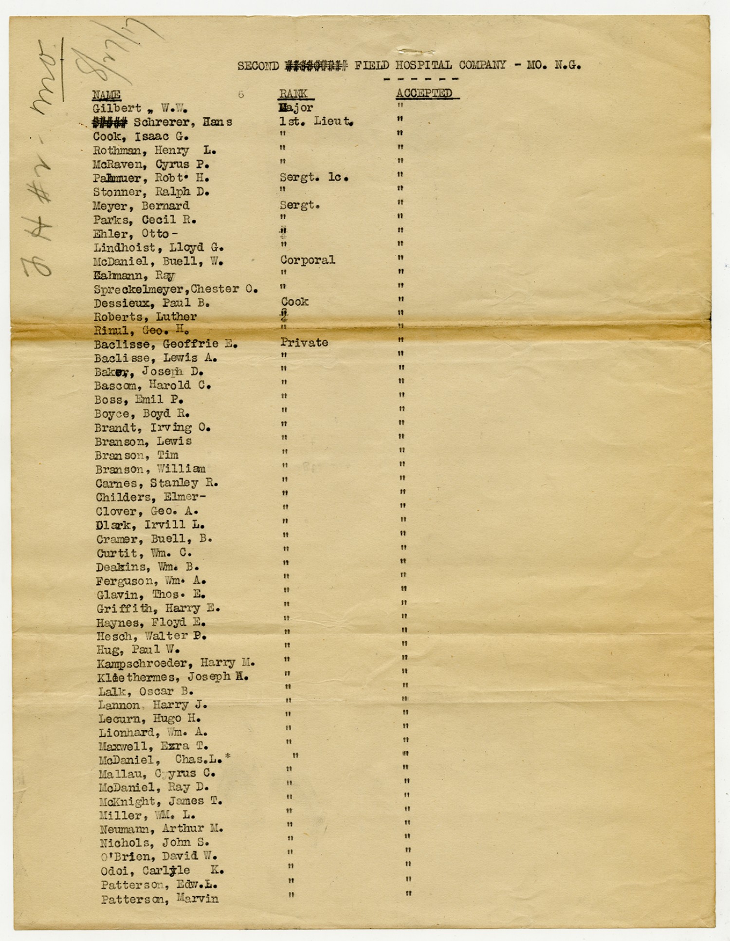 | Source | Missouri National Guard; Military Rosters, Physical Qualifications, List of Officers, List of Acceptances, List of Rejected, Weekly Report, Oath and Contract of Enlistment, Correspondence, List of Deserters, telegrams, and other papers regarding the enlis |