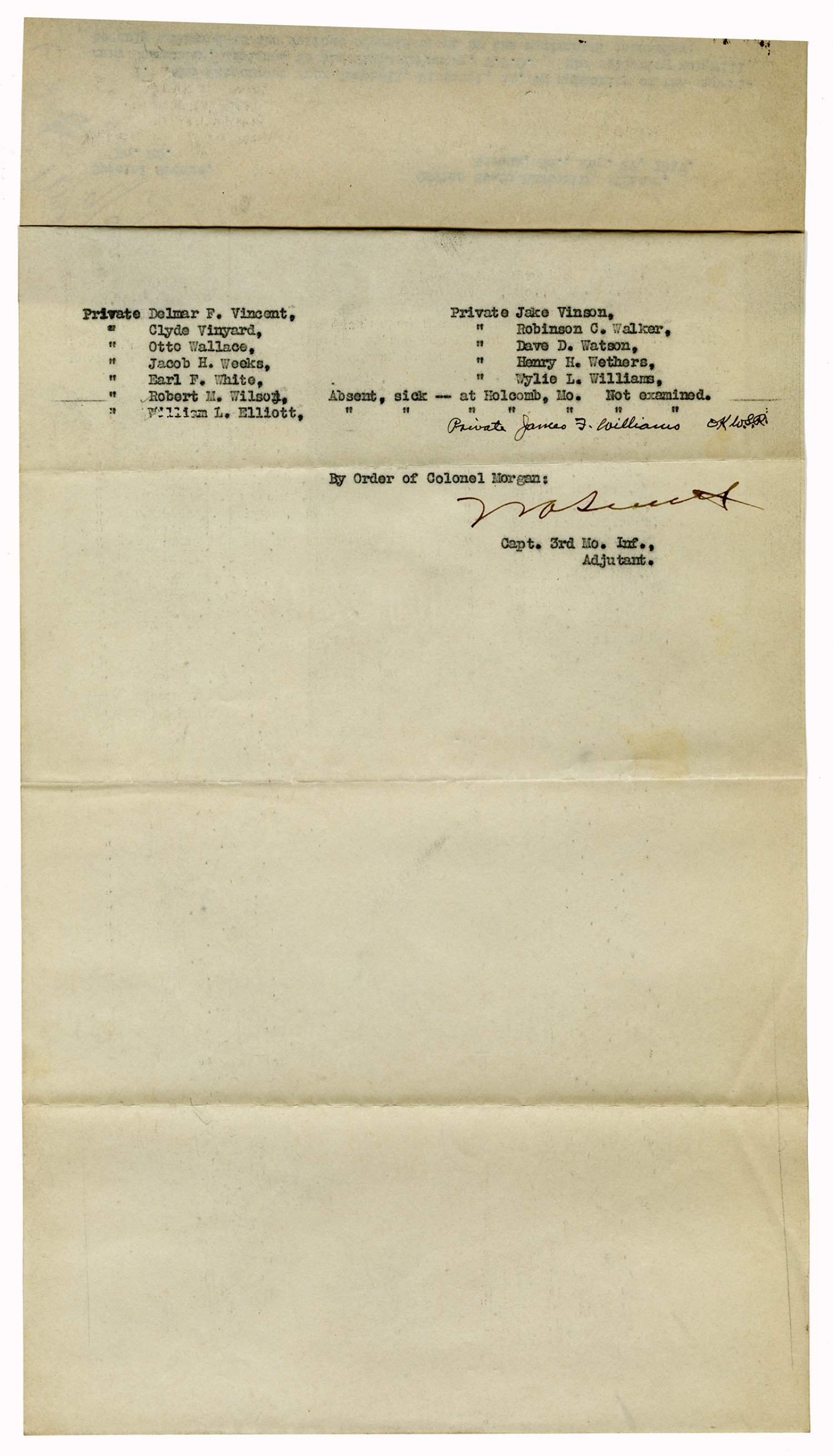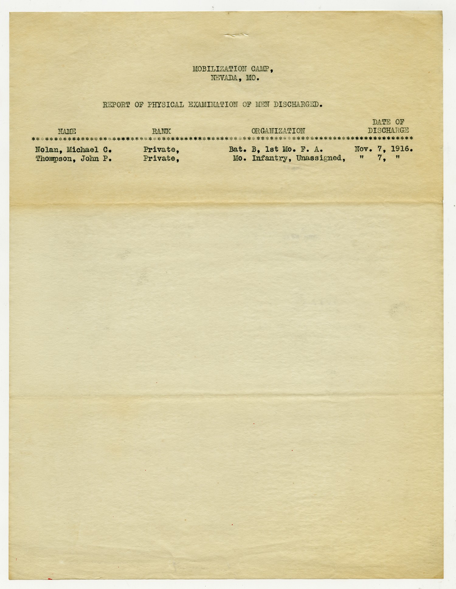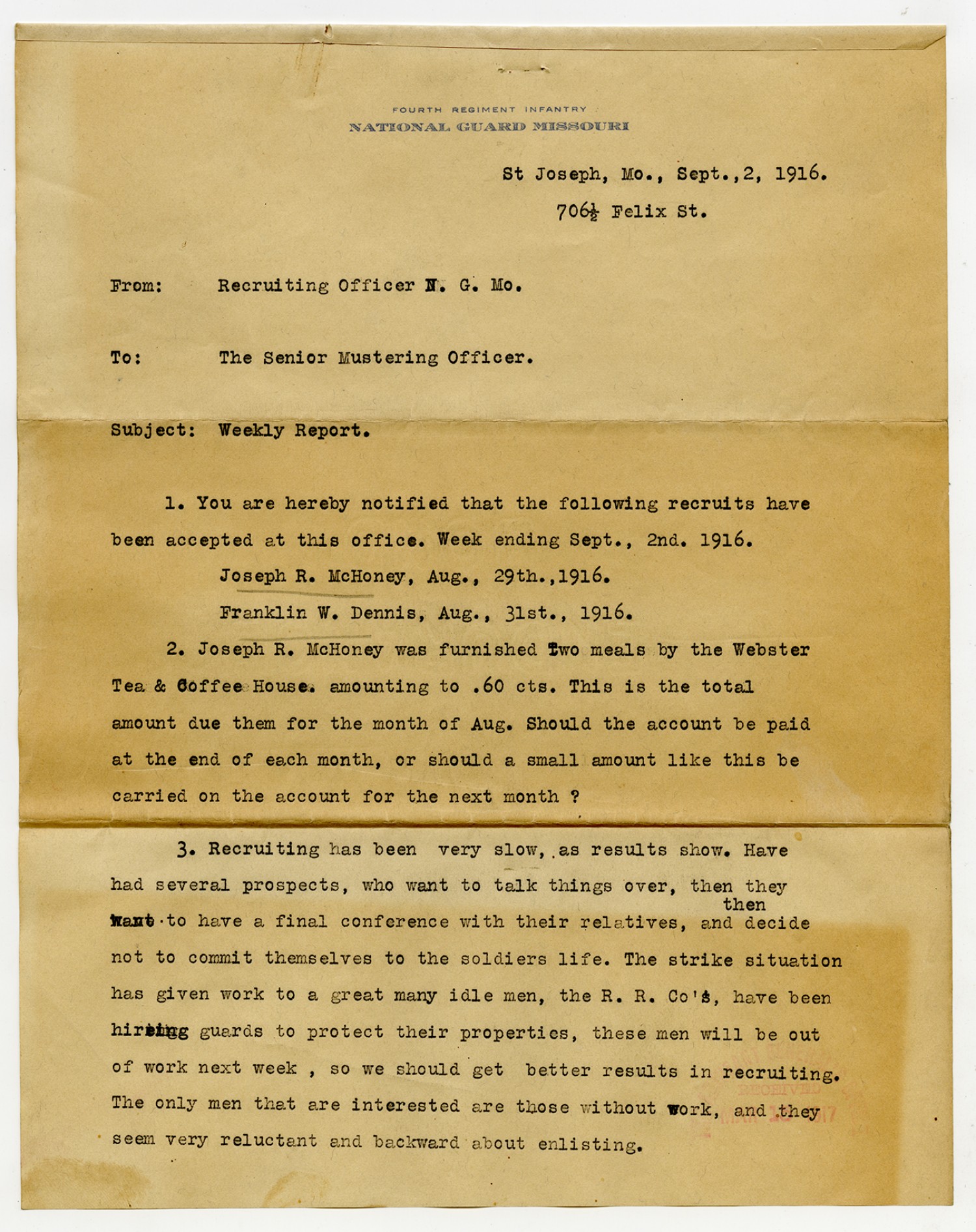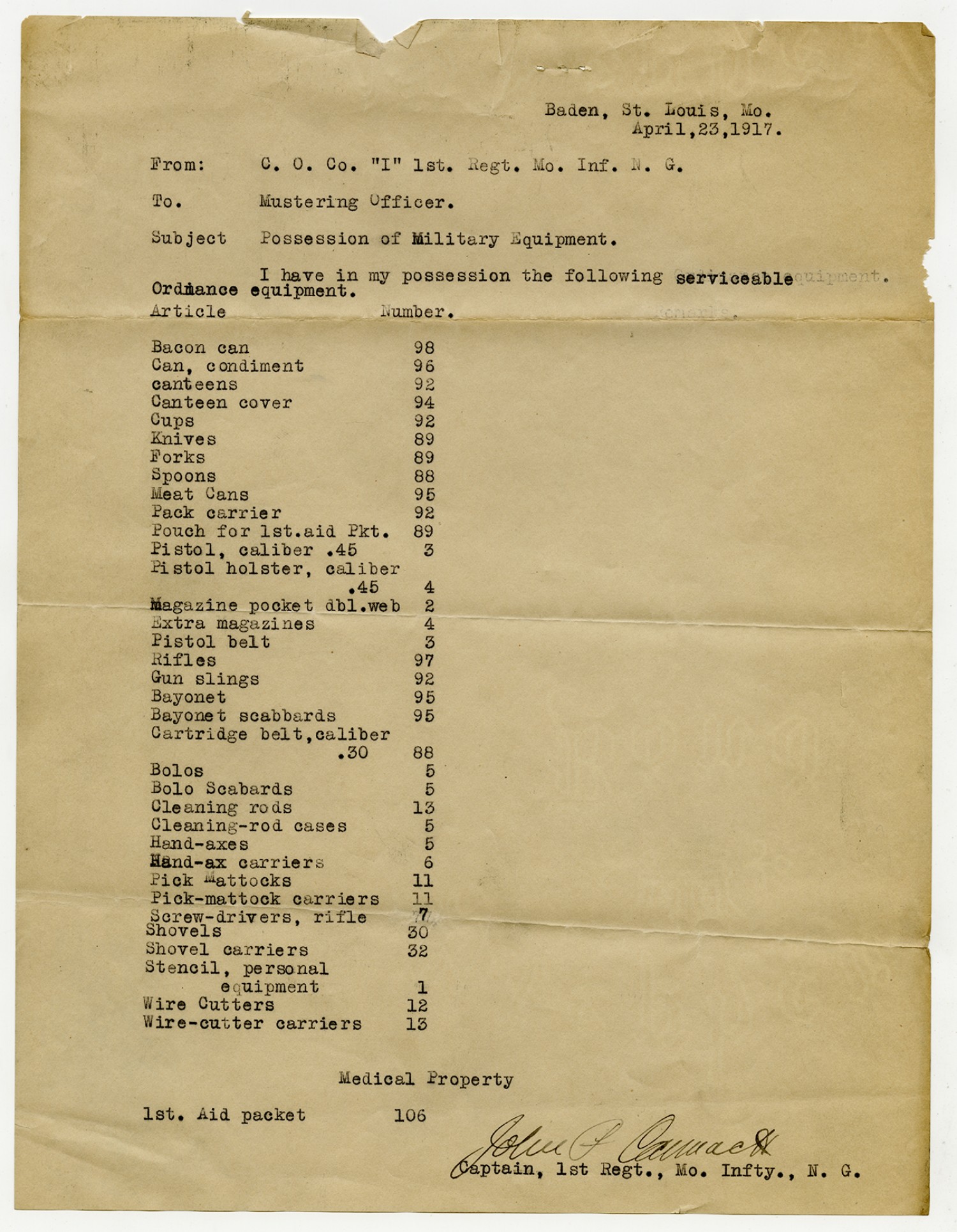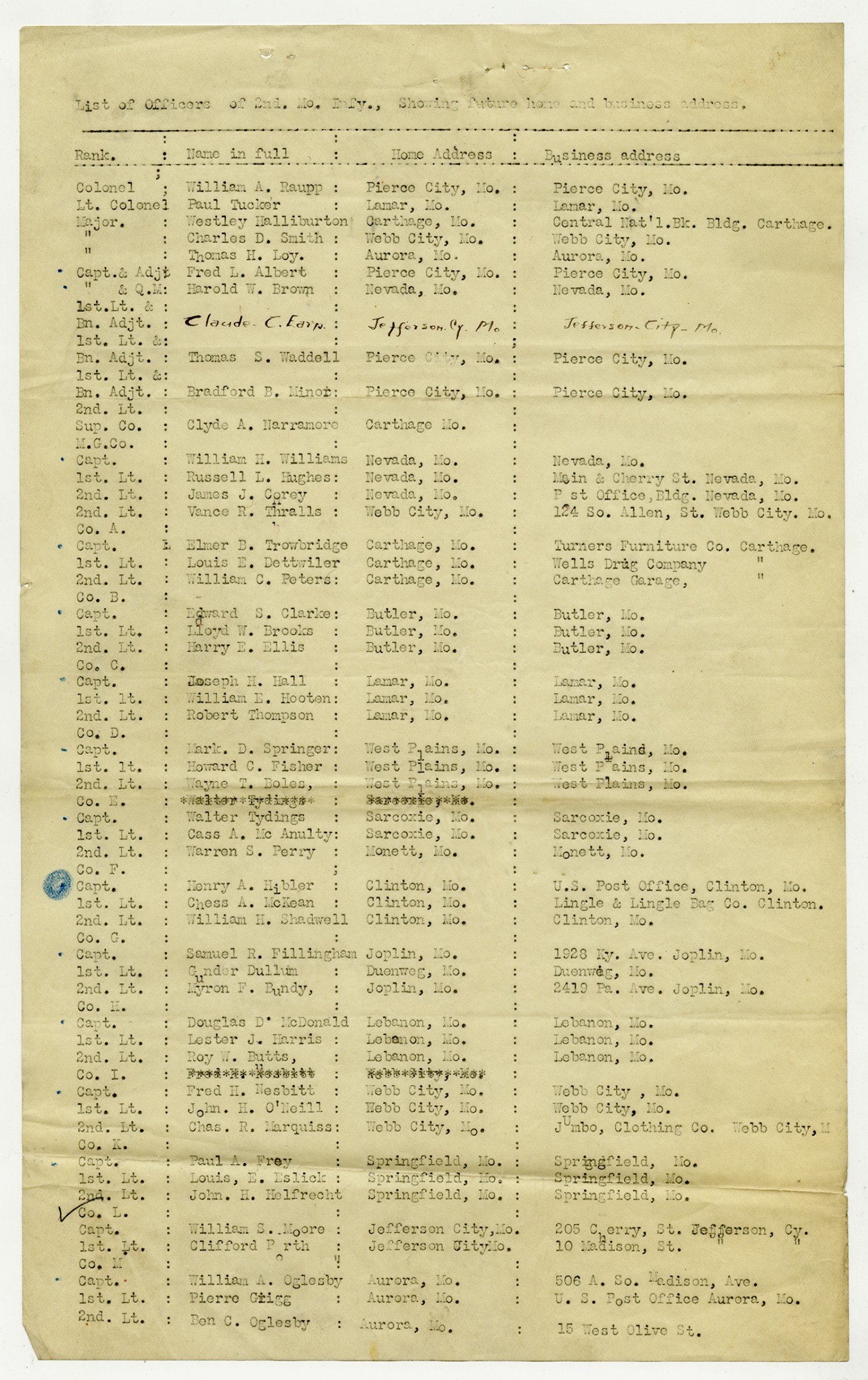 | Source | Missouri National Guard; Military Rosters, Physical Qualifications, List of Officers, List of Acceptances, List of Rejected, Weekly Report, Oath and Contract of Enlistment, Correspondence, List of Deserters, telegrams, and other papers regarding the enlis |