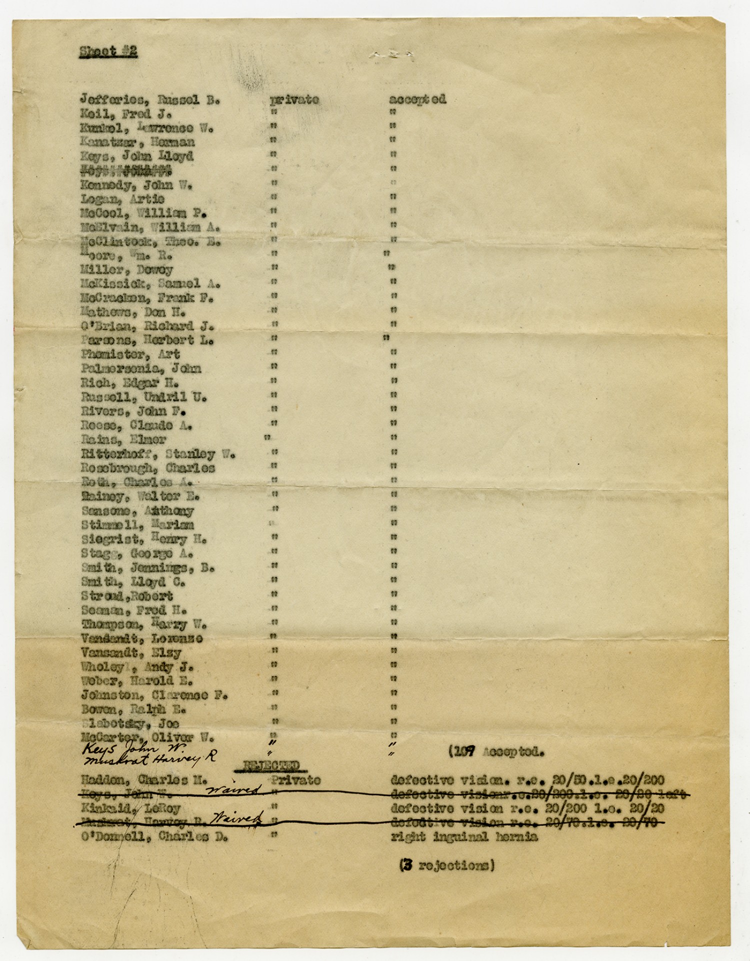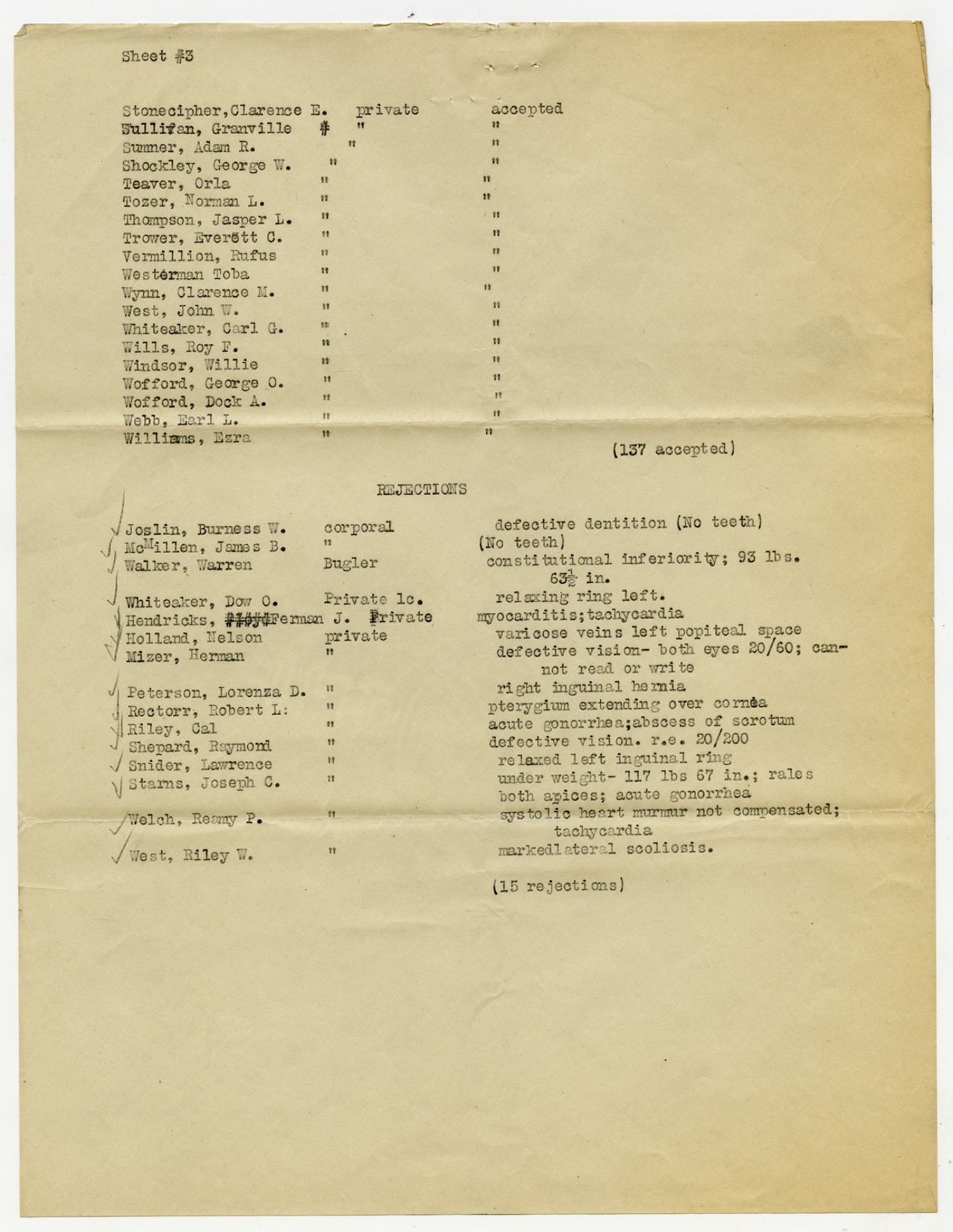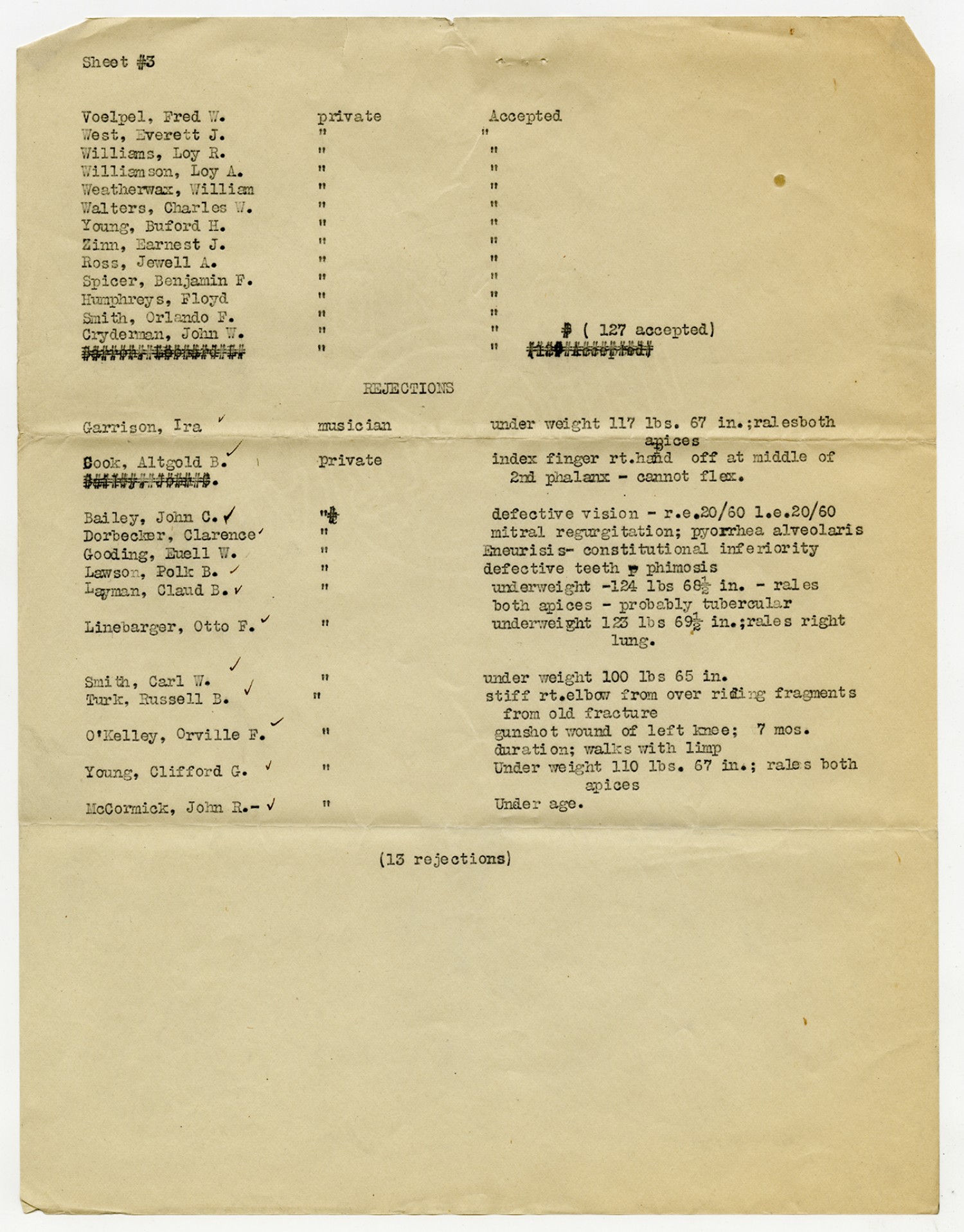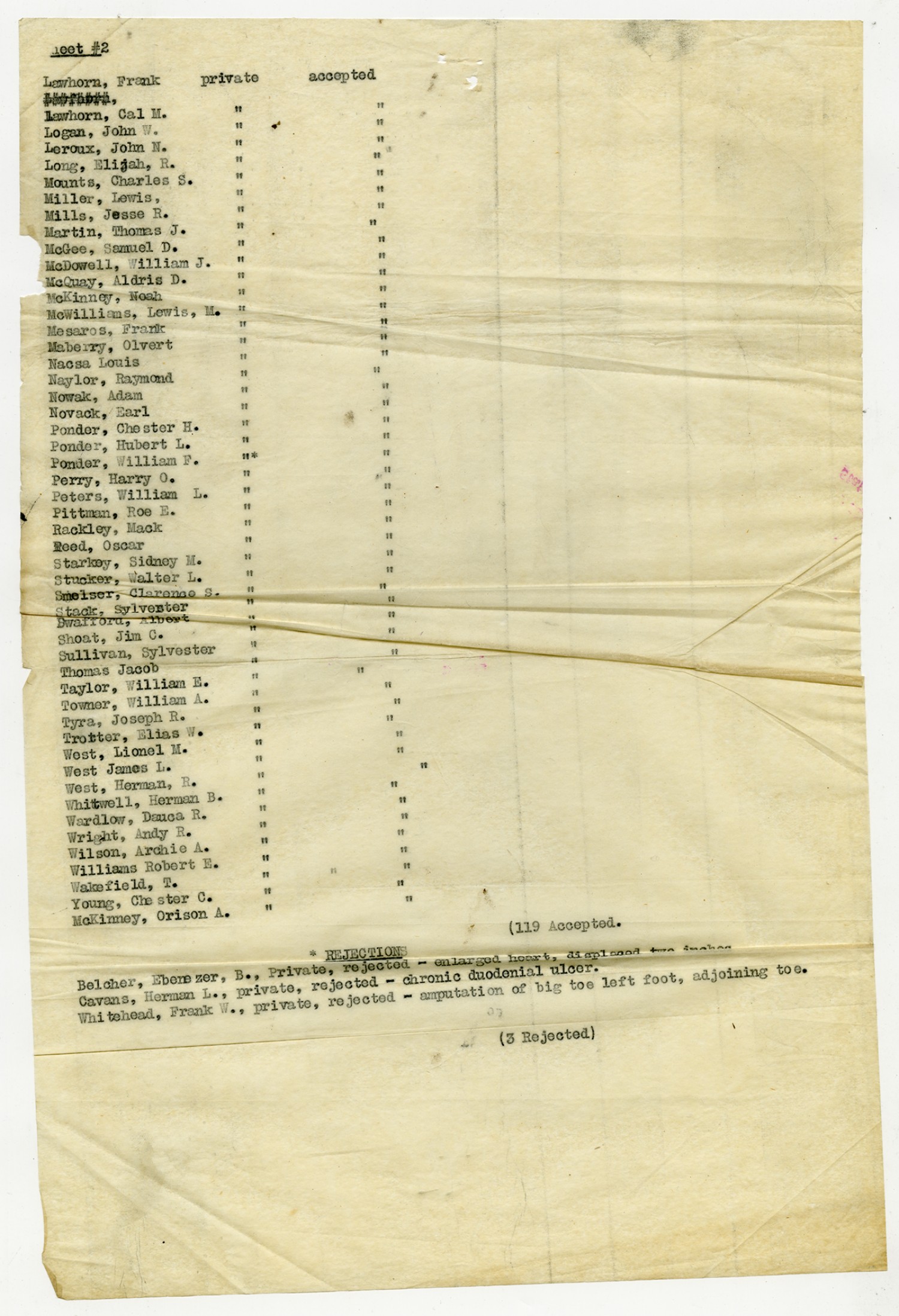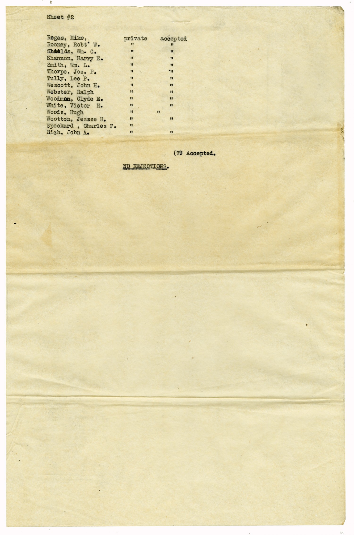 Men Accepted and Rejected to the Machine Gun Company, Second Regiment - September 5, 1917