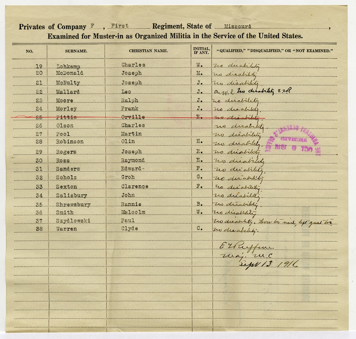 Men Accepted and Rejected in Company F, 2nd Missouri Infantry - September 5, 1917