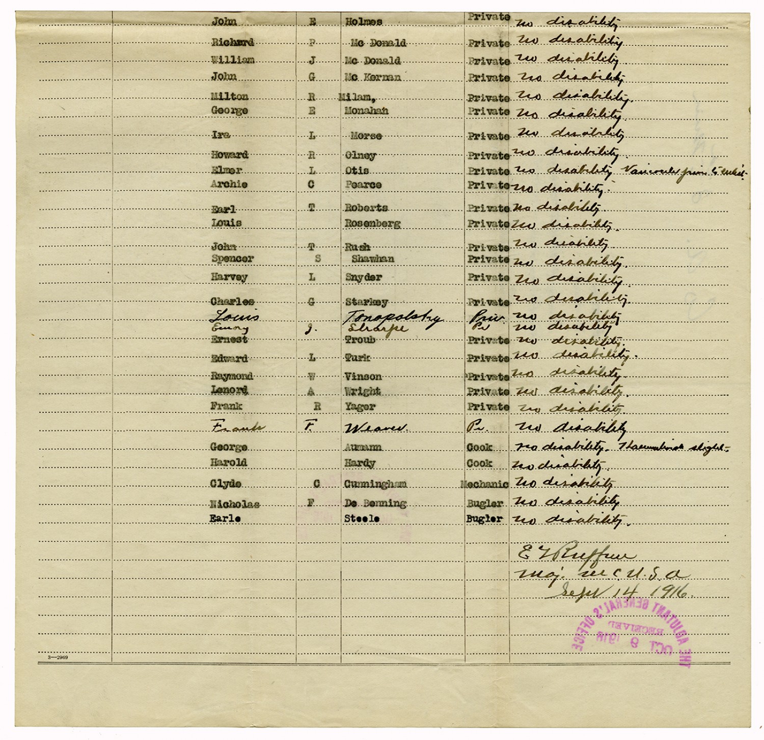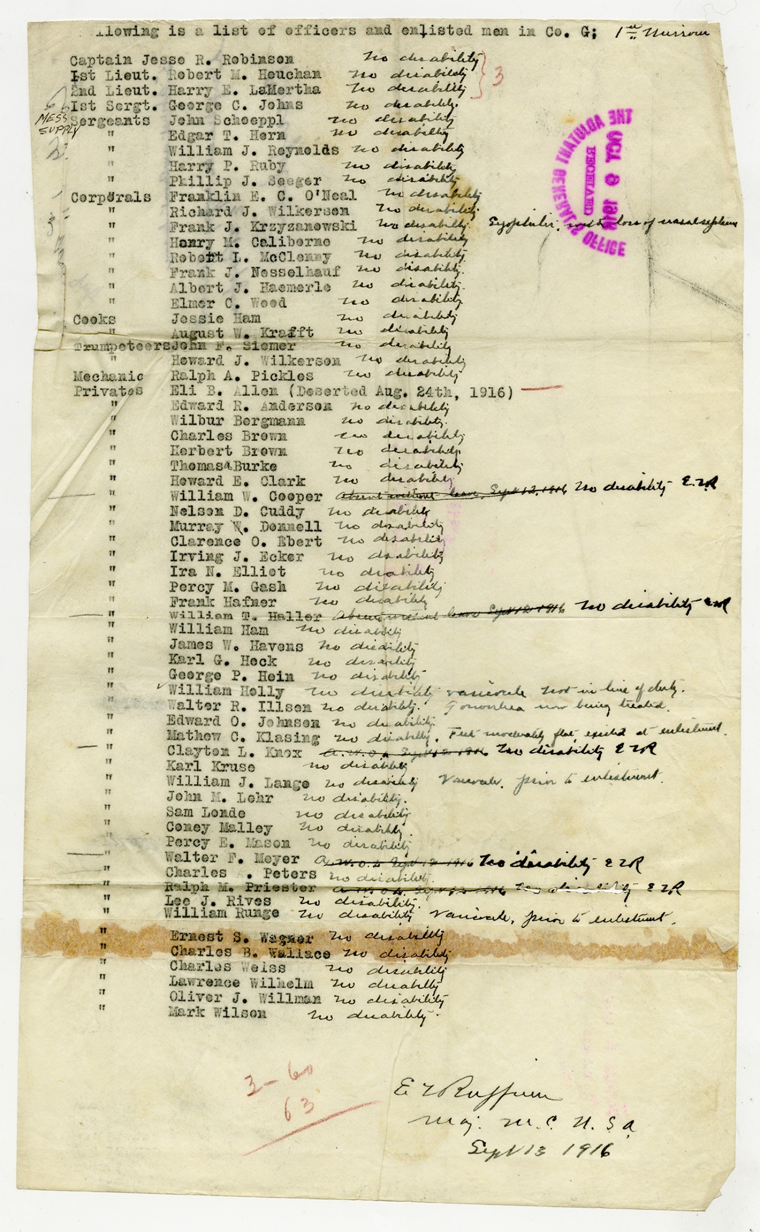 Correspondence concerning Muster-out Rolls - September 30, 1916