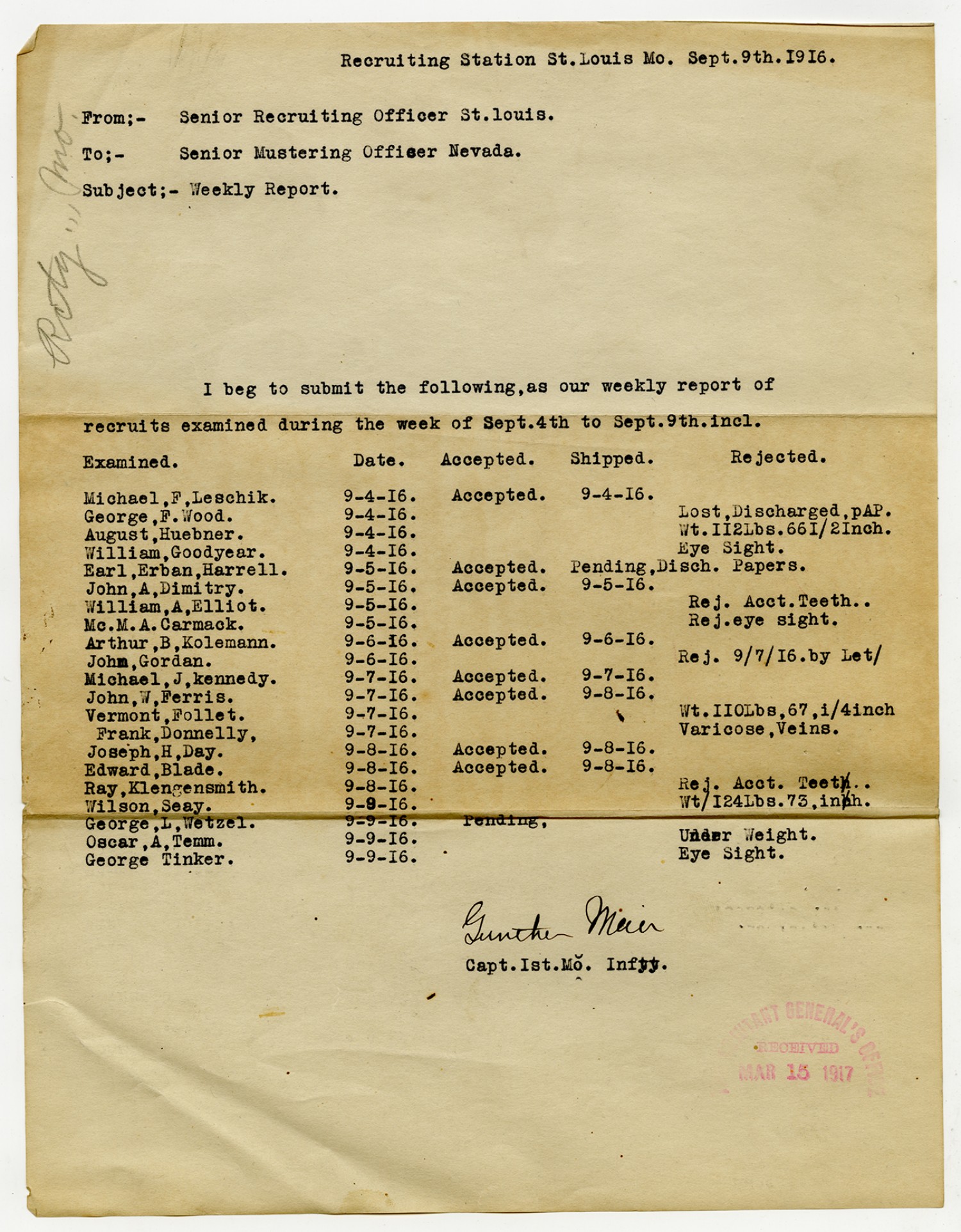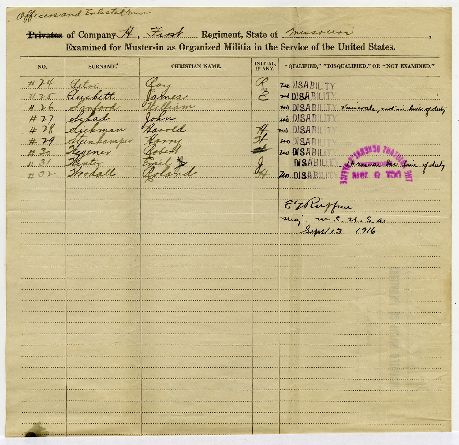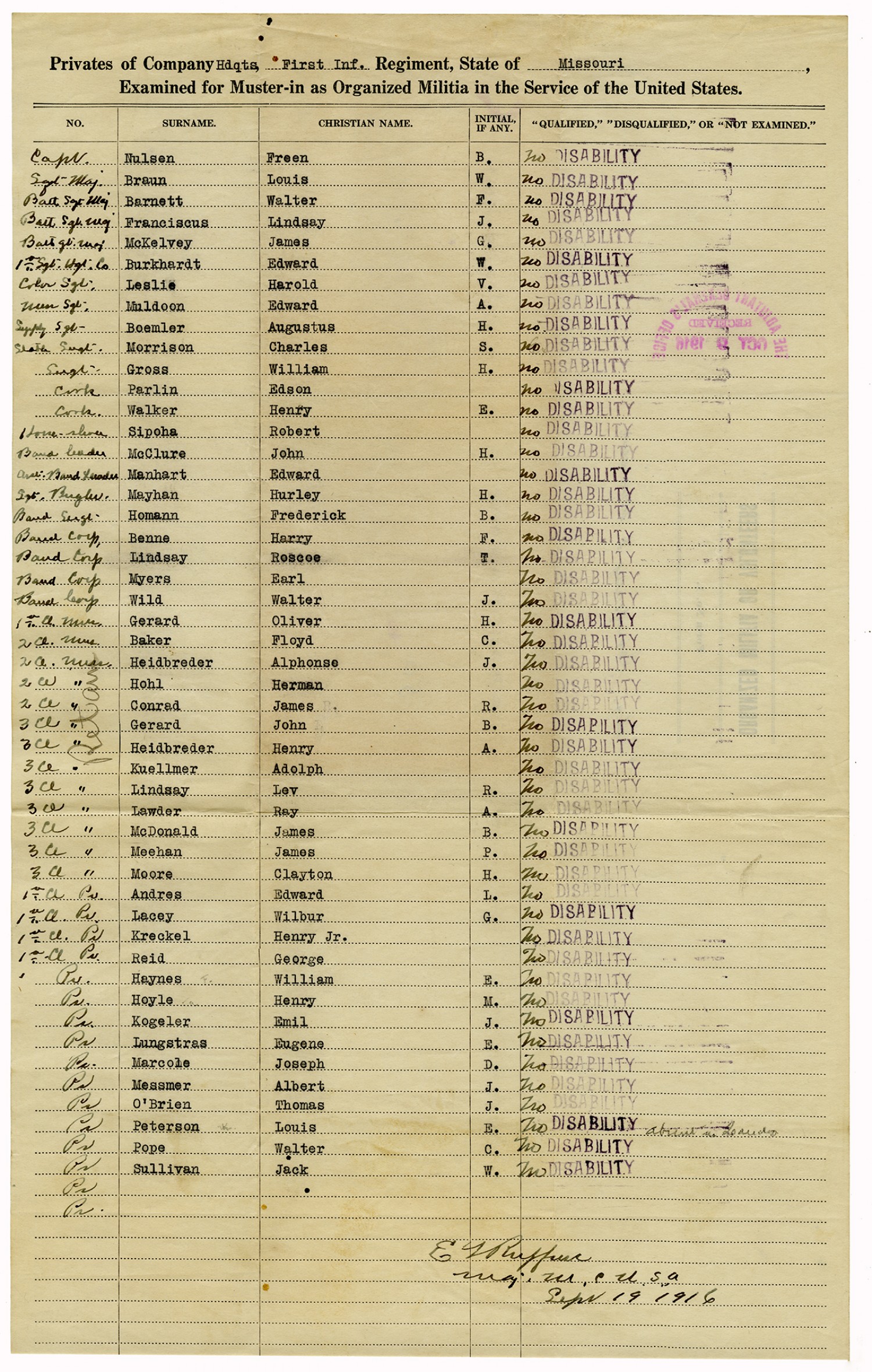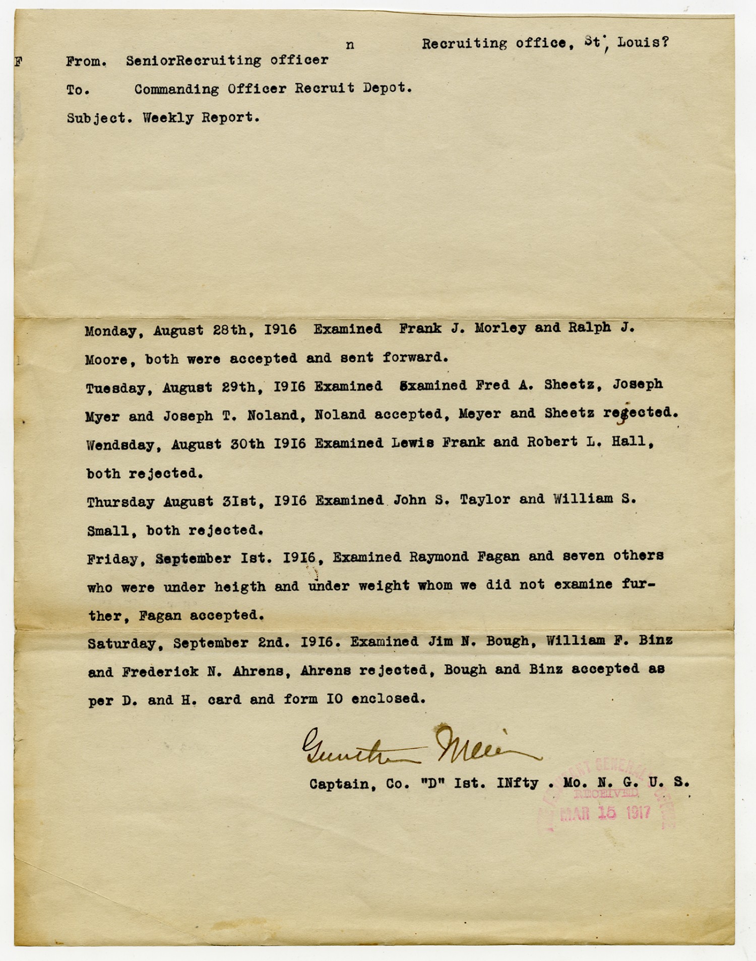 Men Accepted and Rejected in Company G, 2nd Missouri Infantry - September 5, 1917