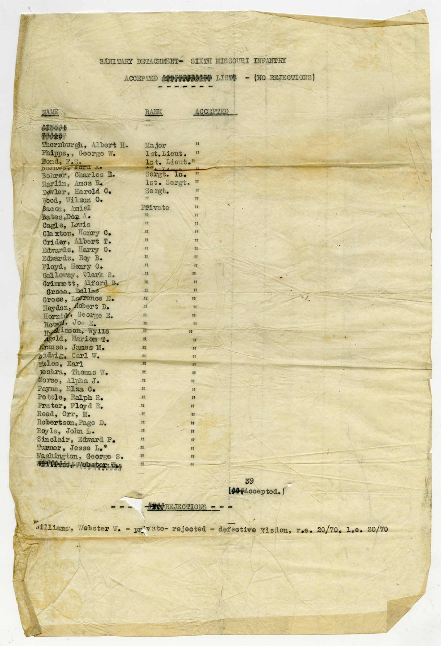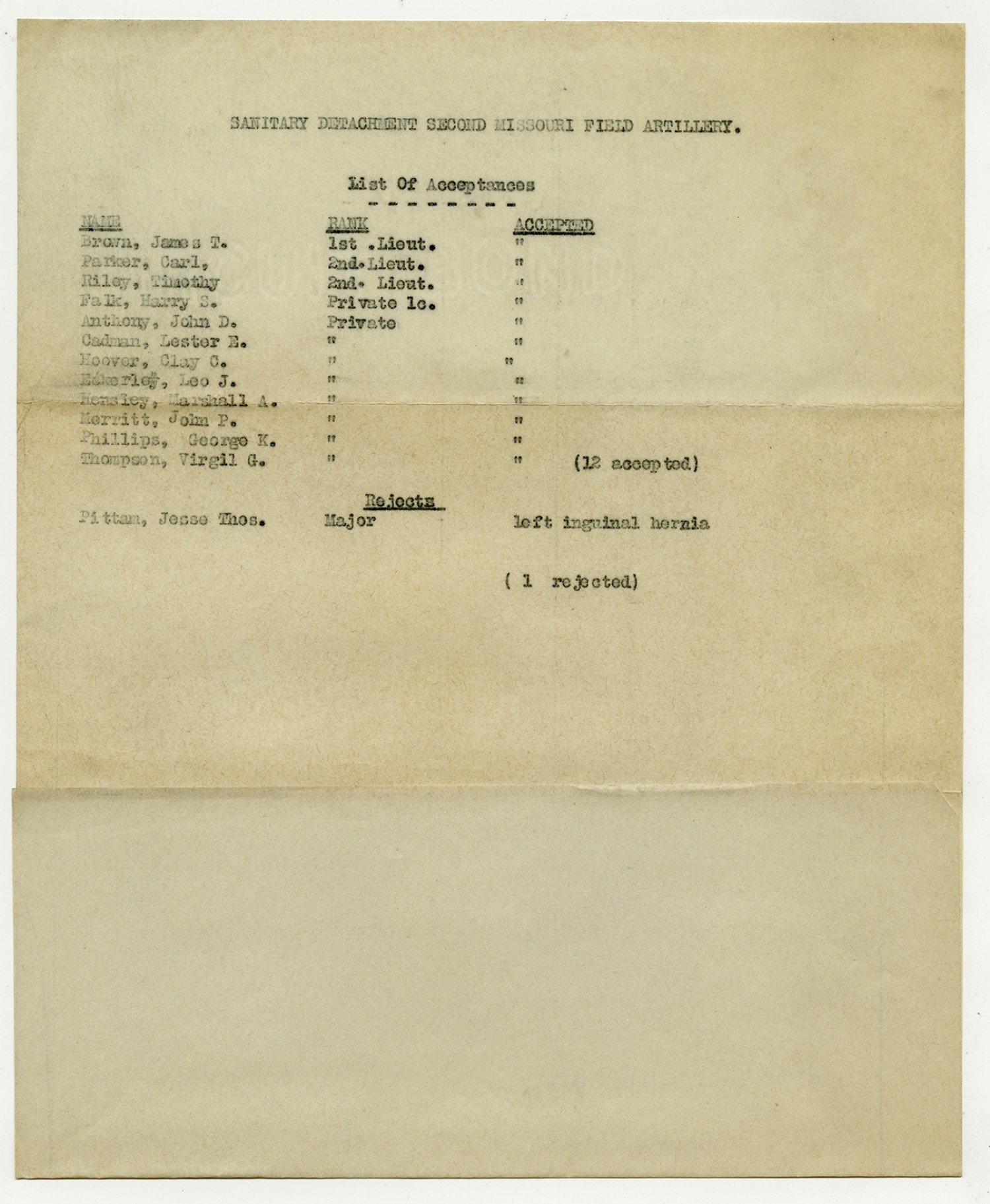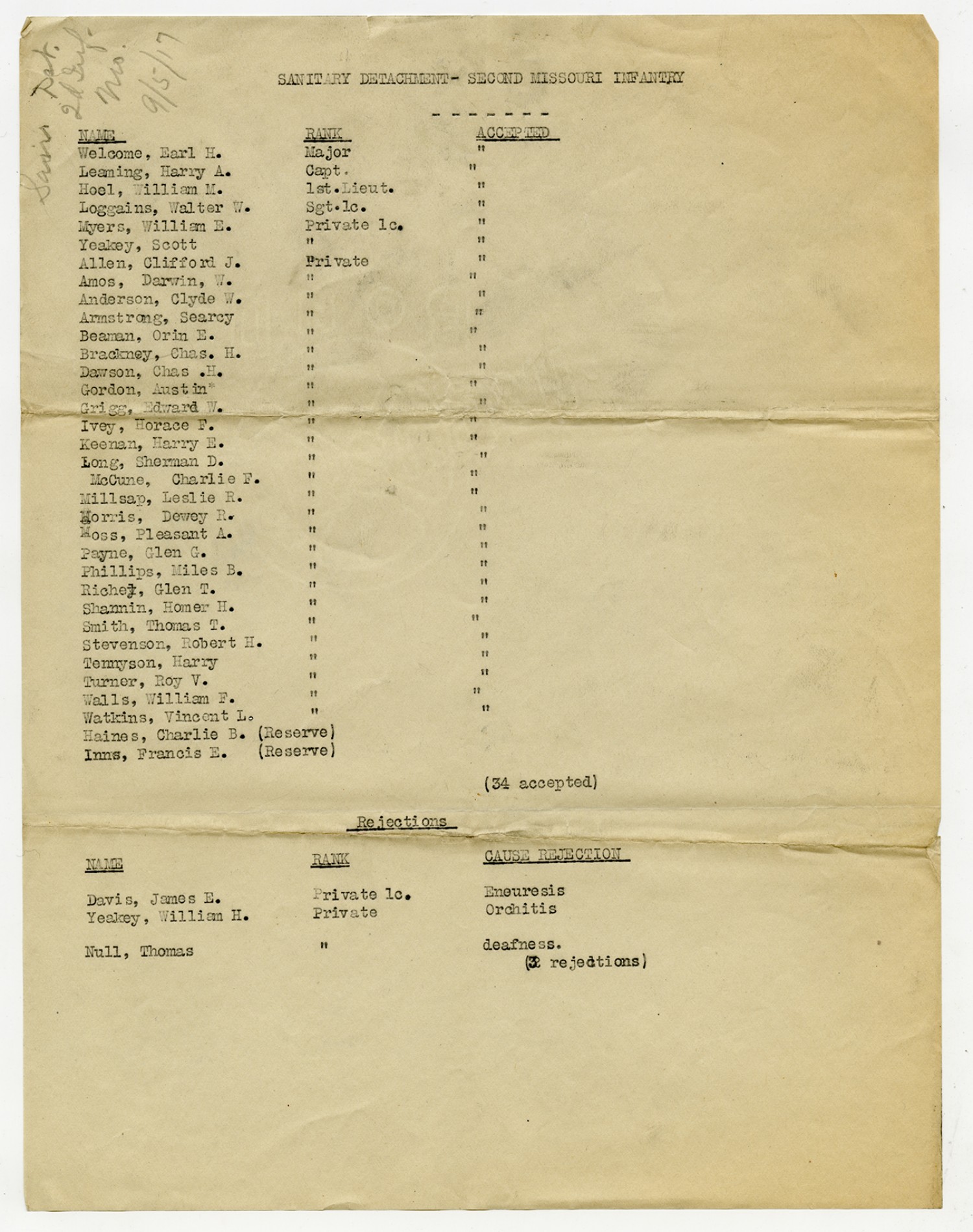 Men Accepted and Rejected in the Sanitary Detachment, 2nd Missouri Infantry - September 5, 1917