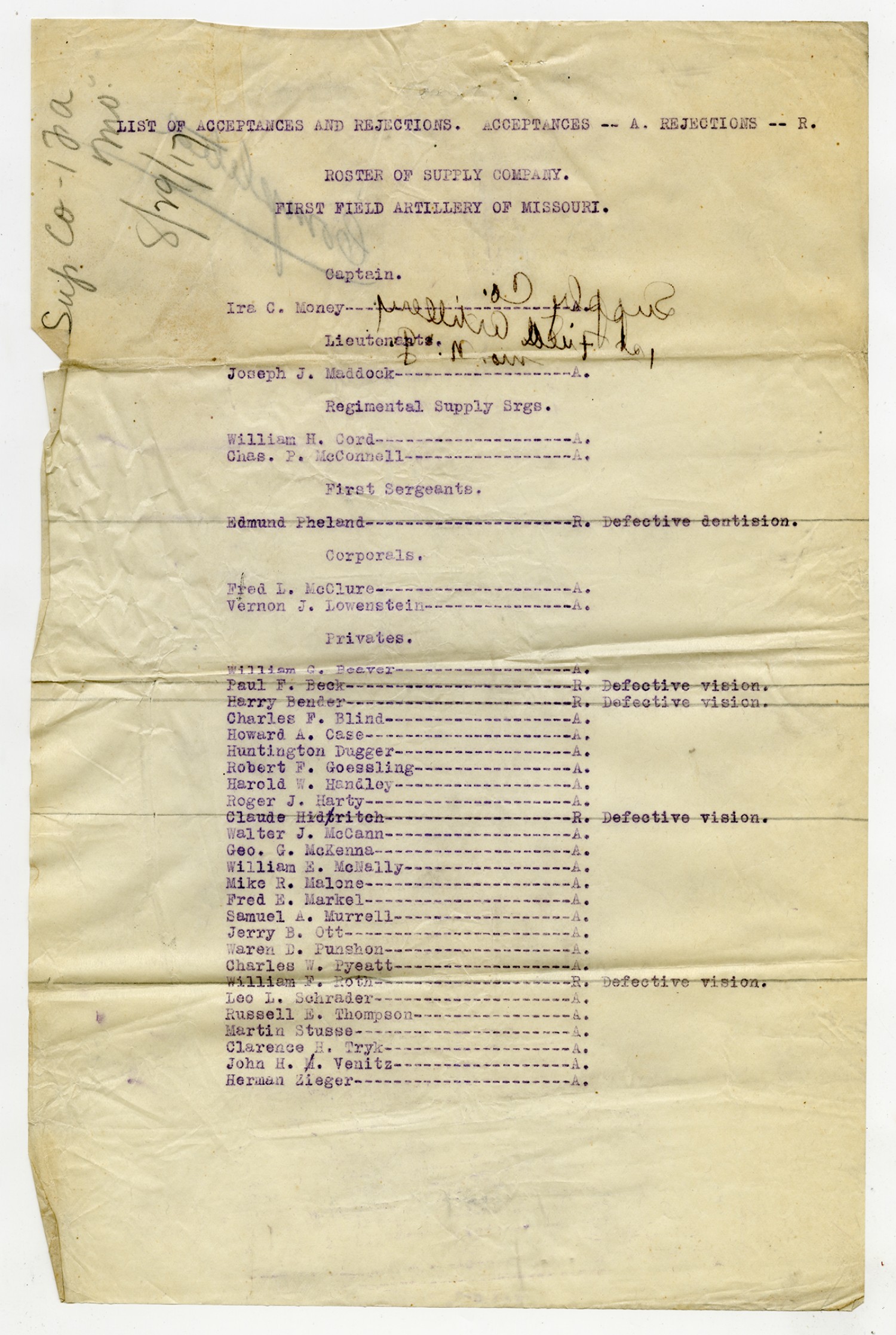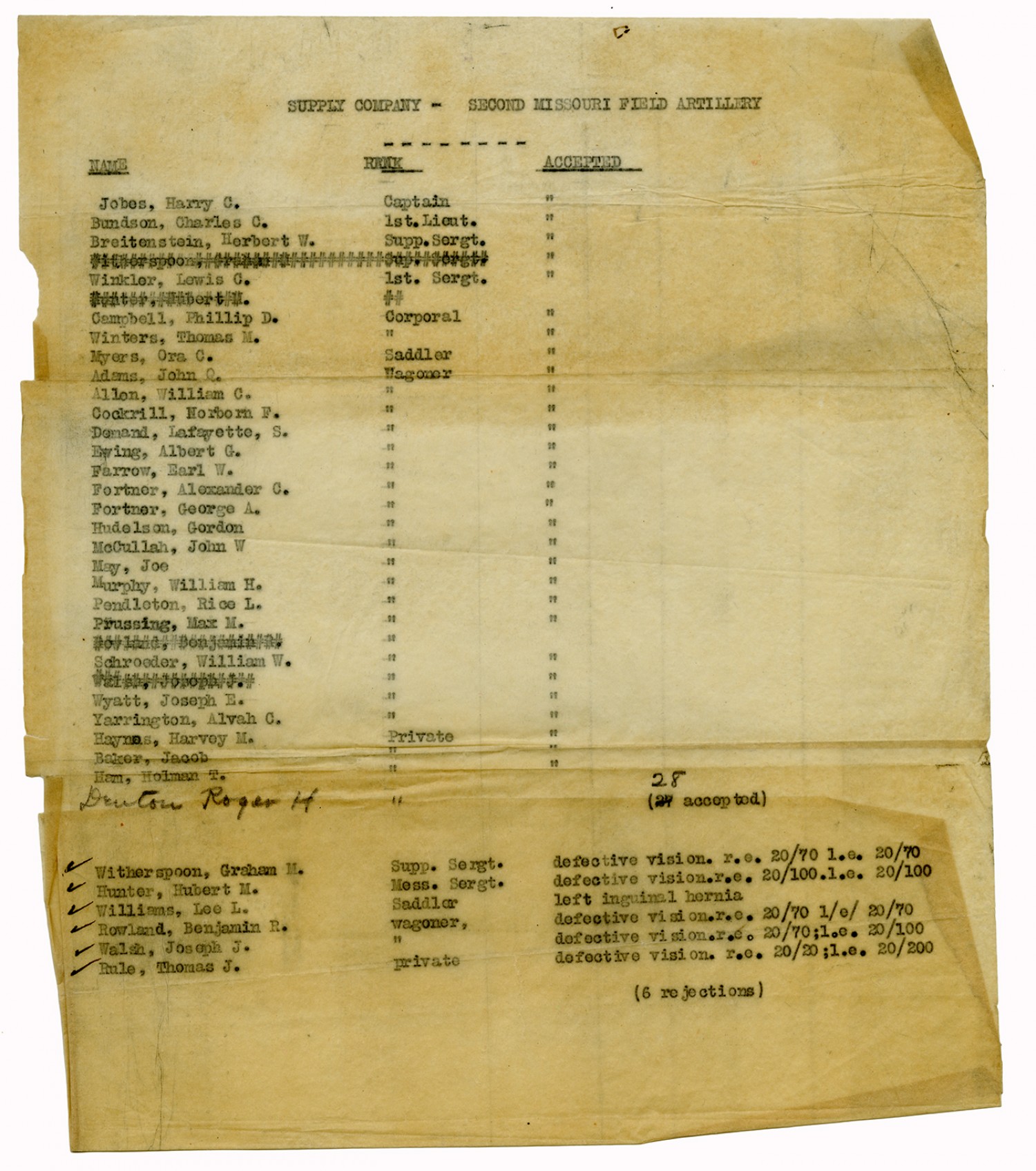 Men Accepted and Rejected in Supply Company, 2nd Missouri Field Artillery - n.d.