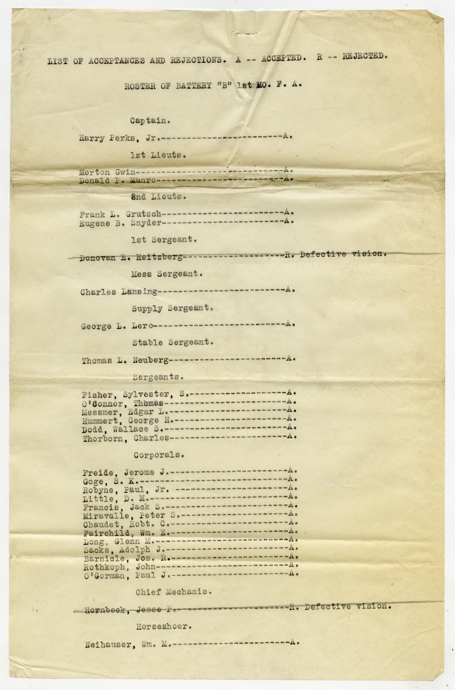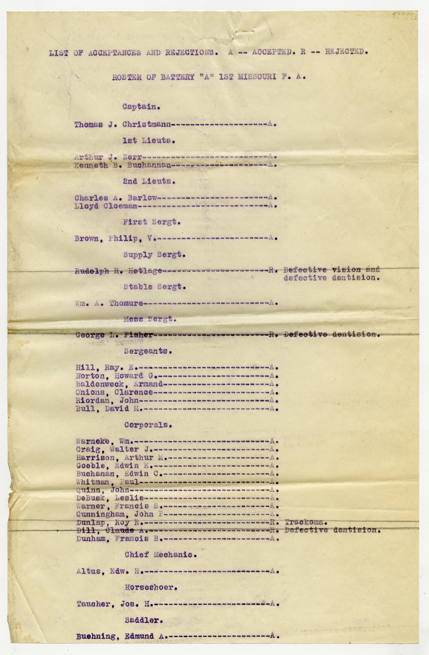 Men Accepted and Rejected in Battery A, 1st Missouri Field Artillery - n.d.