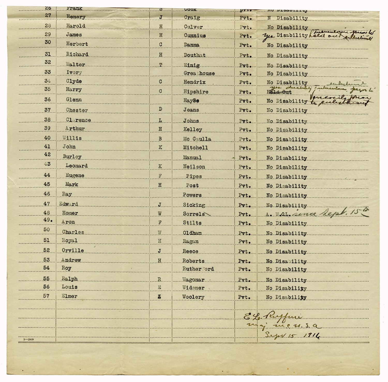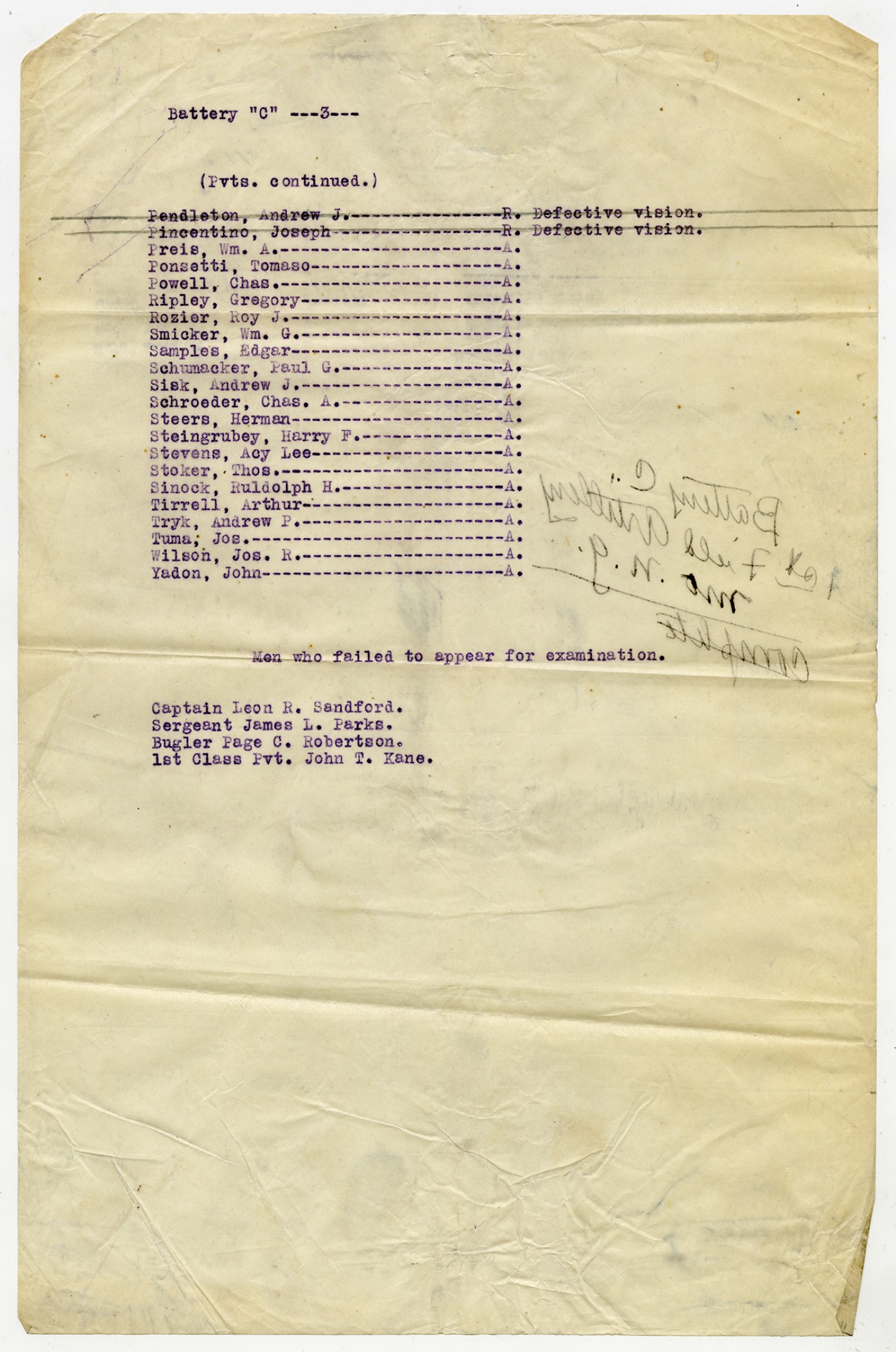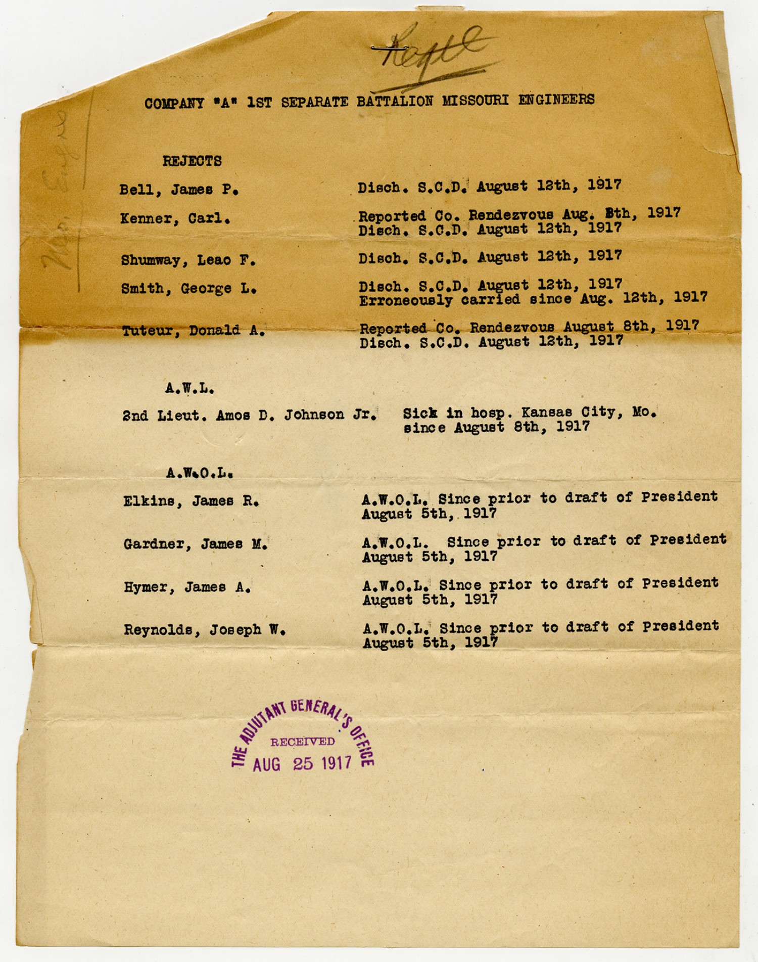 Rejected and AWOL Men from Company A - August 25, 1917