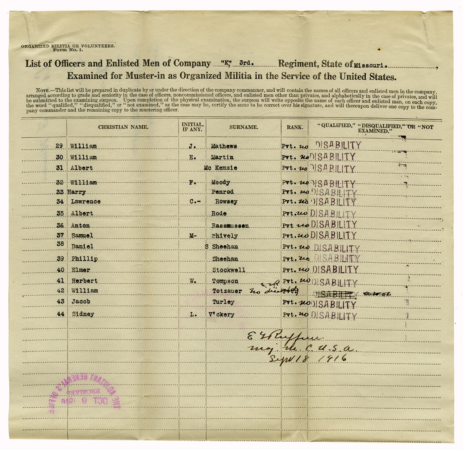 Men Accepted and Rejected in Company M, 2nd Missouri Infantry - September 5, 1917