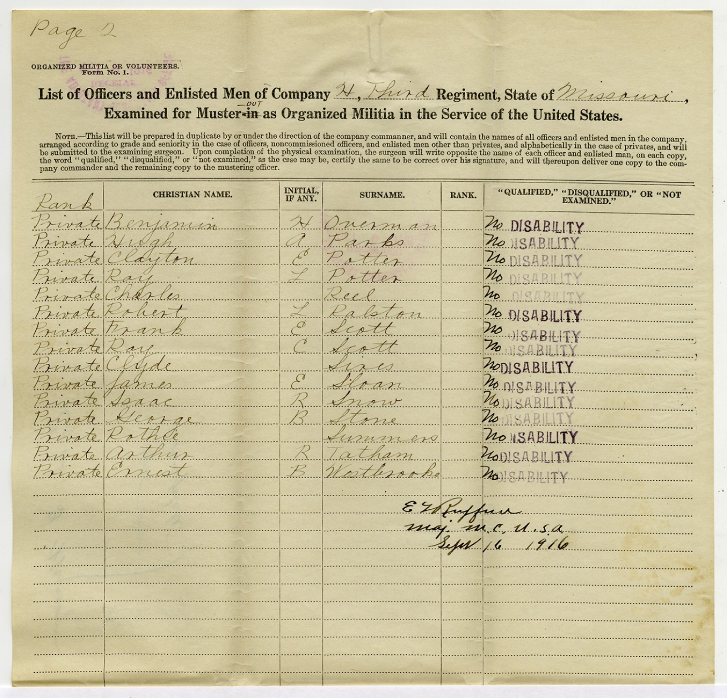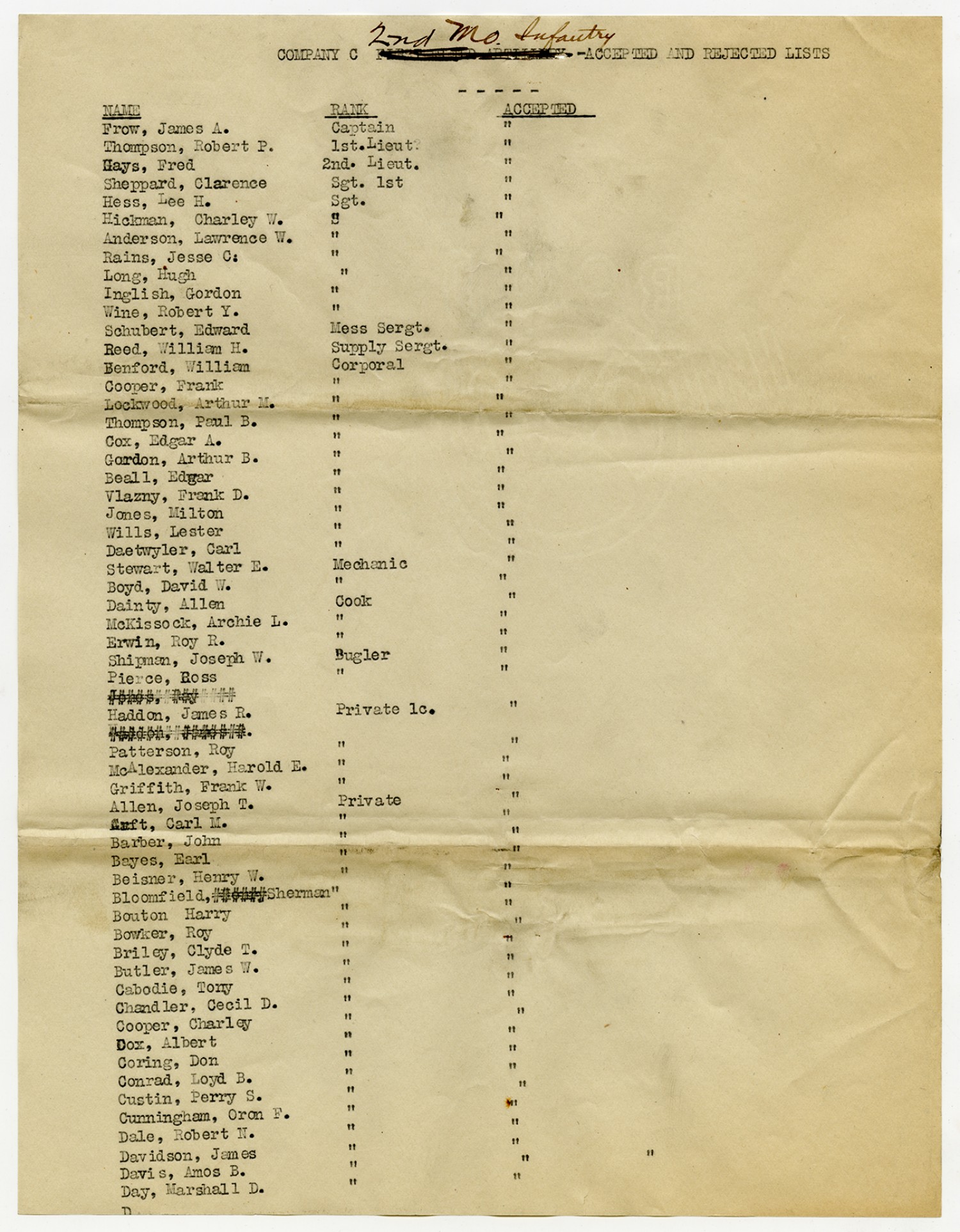 Men Accepted and Rejected in Company C, 2nd Missouri Infantry - September 5, 1917