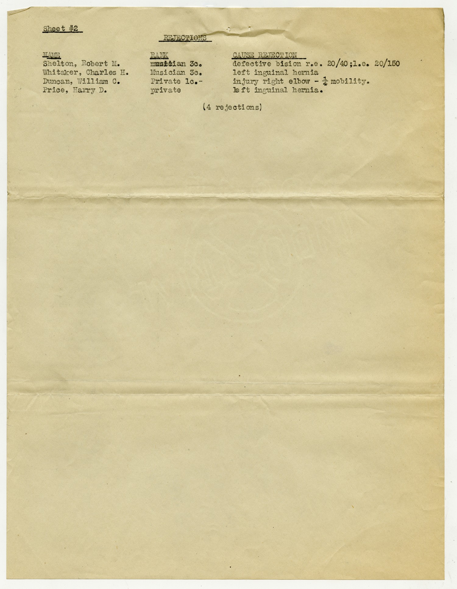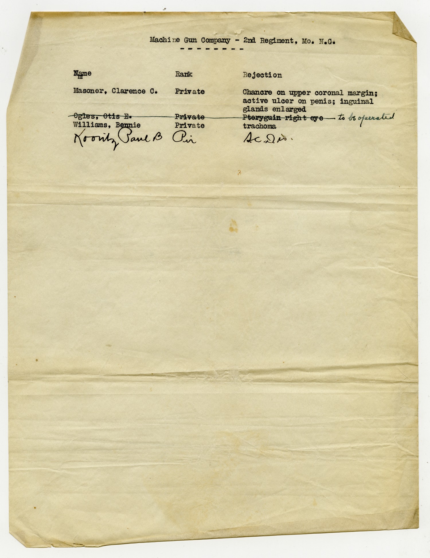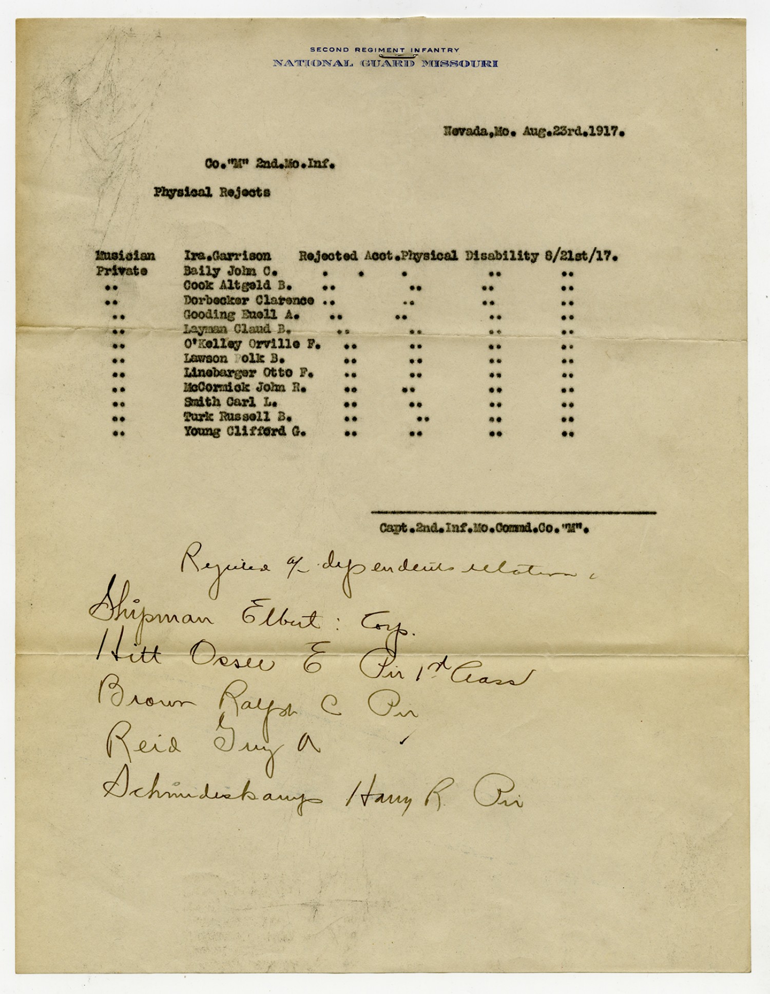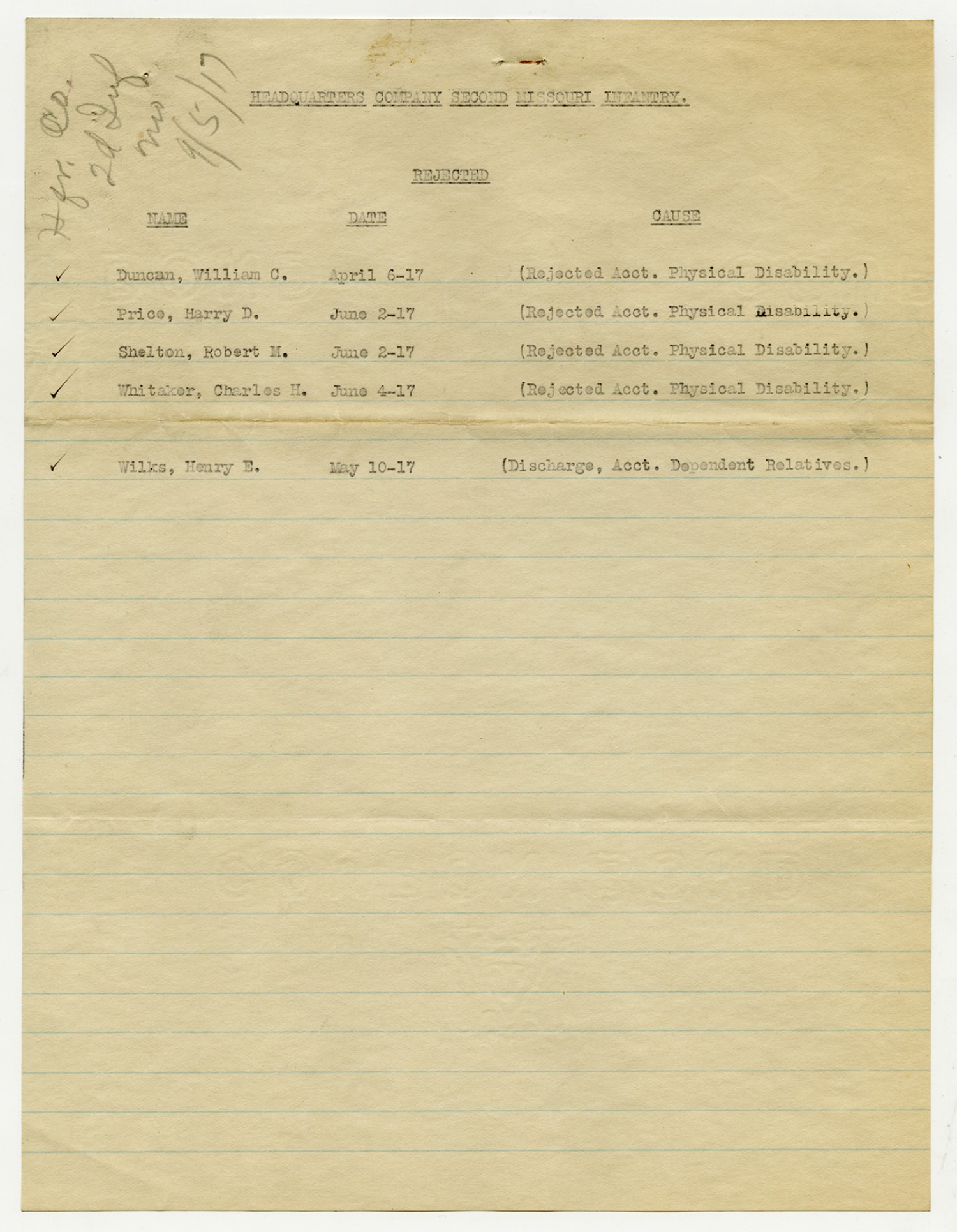 Men Rejected in Headquarters Company, 2nd Missouri Infantry - September 5, 1917