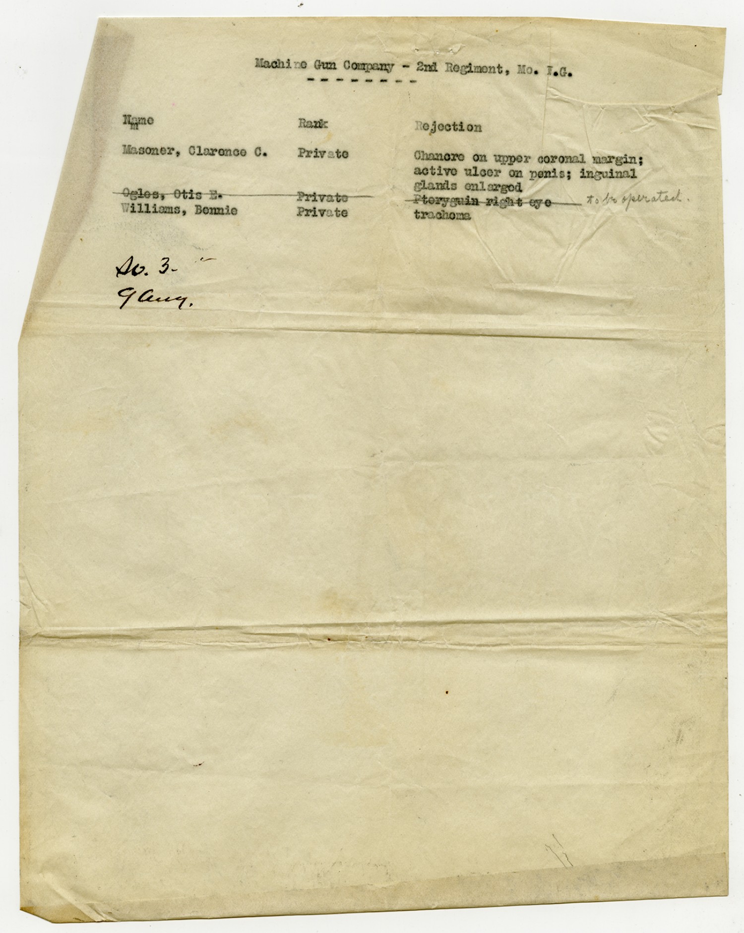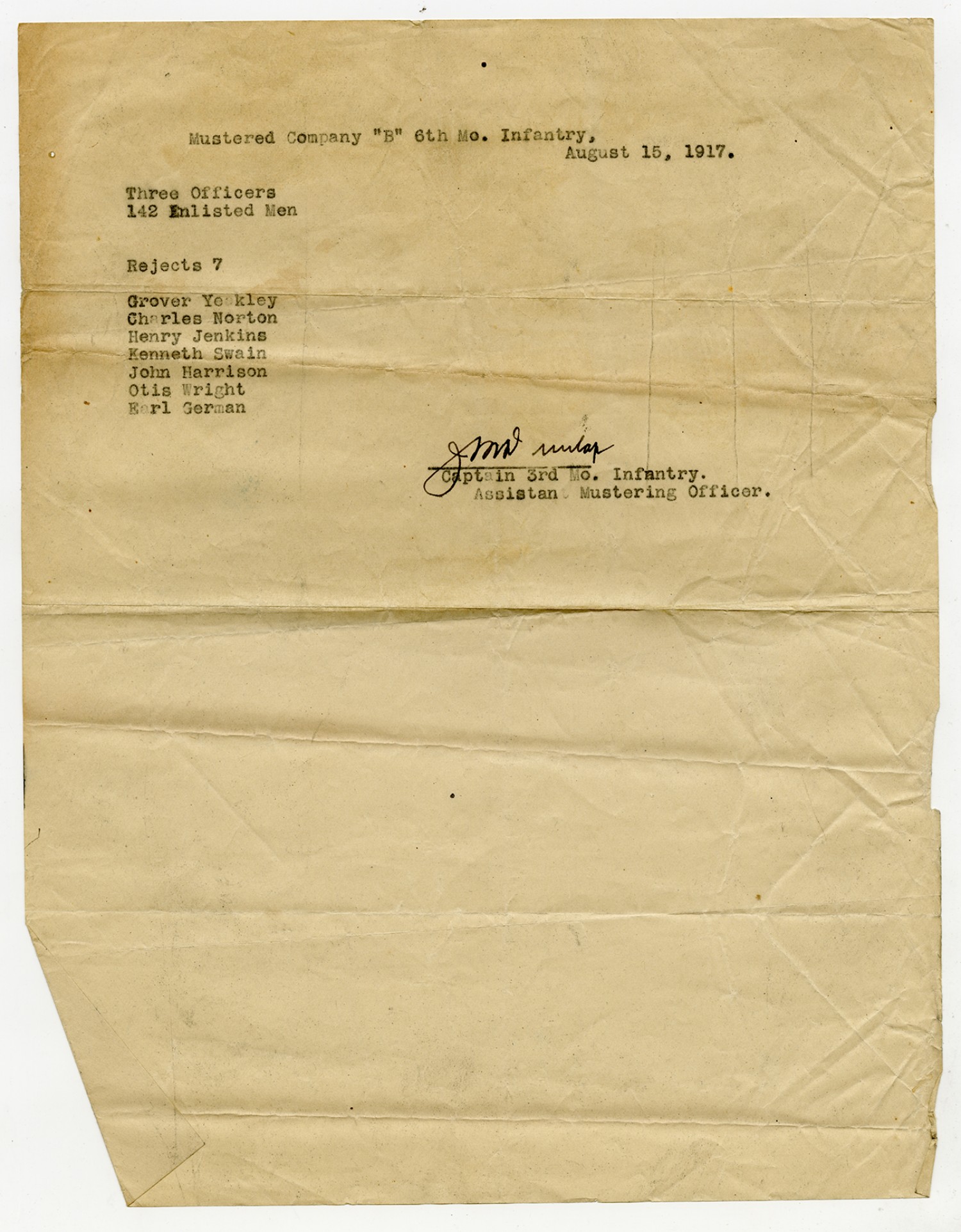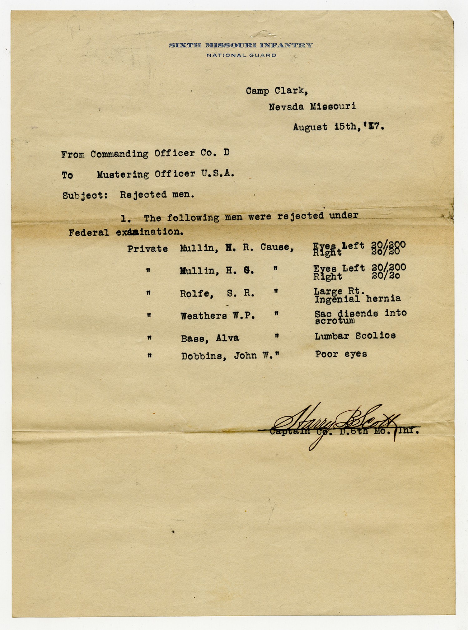 Men Rejected in Company B, 6th Missouri Infantry - August 15, 1917
