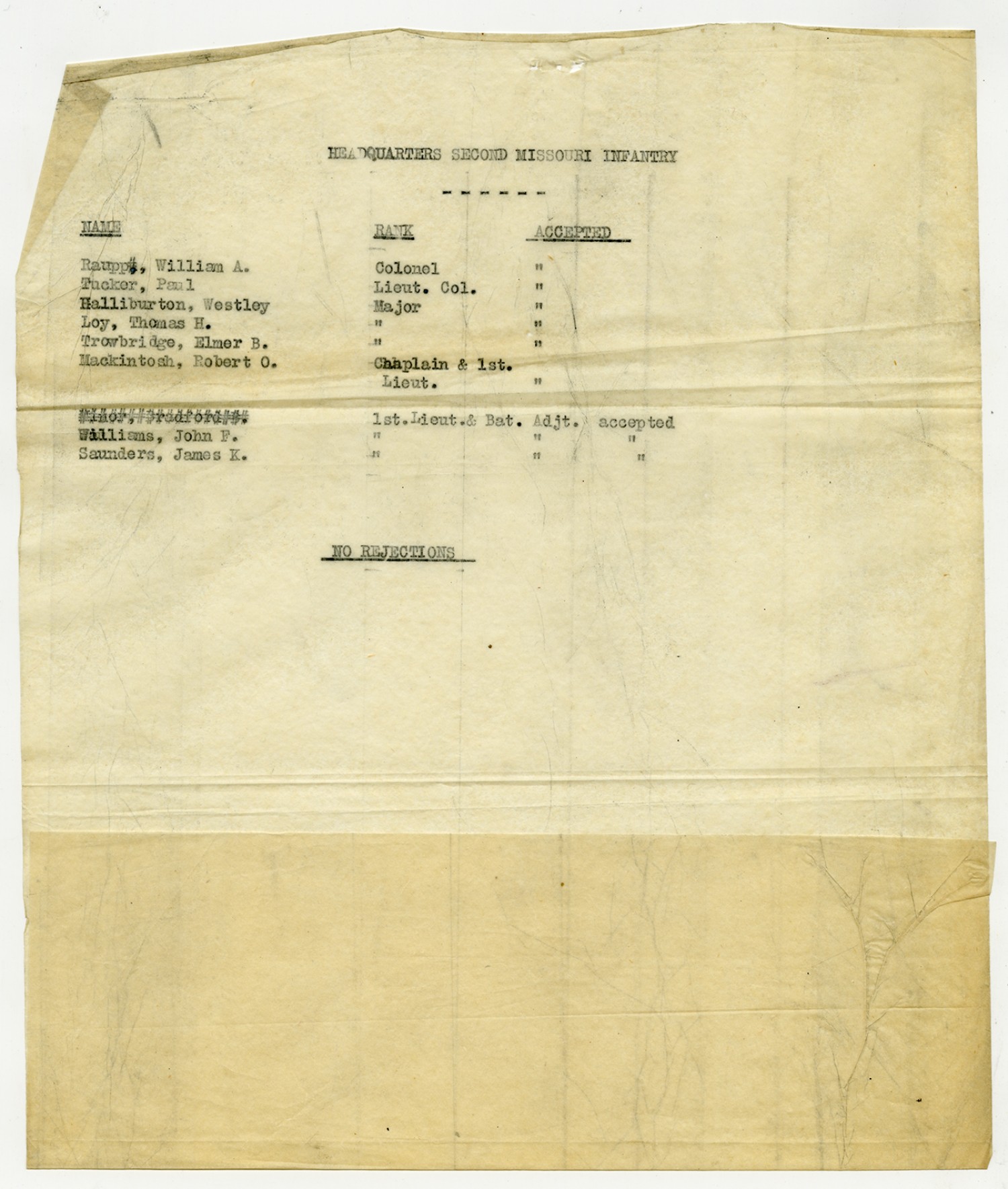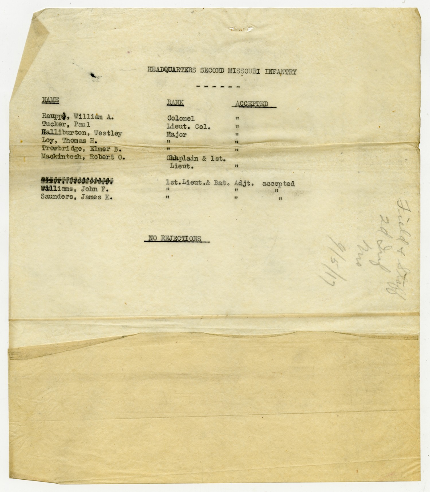 Men Accepted and Rejected in Headquarters Company, 2nd Missouri Infantry - n.d.