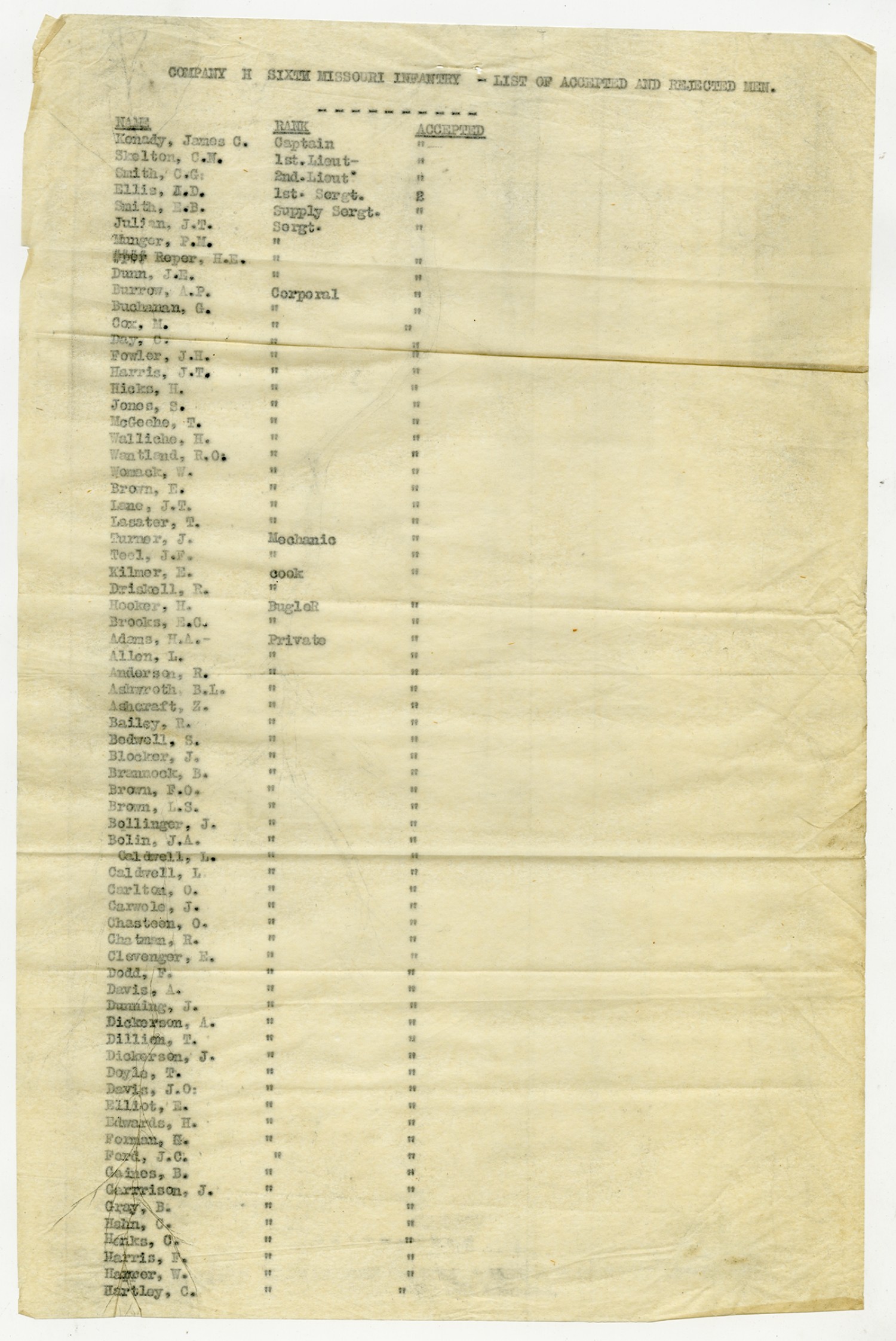 Men Accepted and Rejected in Company H, 6th Missouri Infantry - n.d.