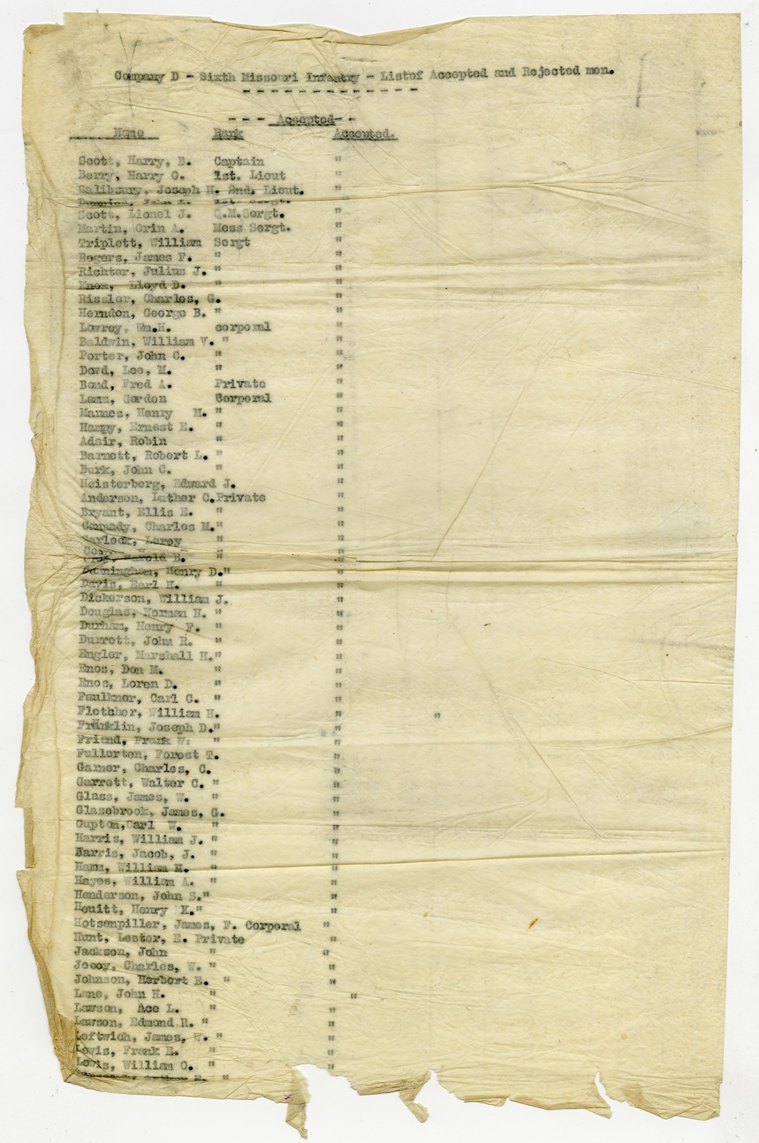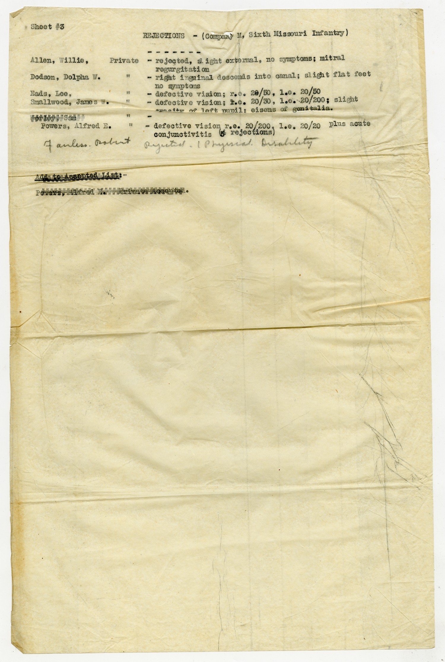 Men Accepted and Rejected in Company D, 6th Missouri Infantry - n.d.