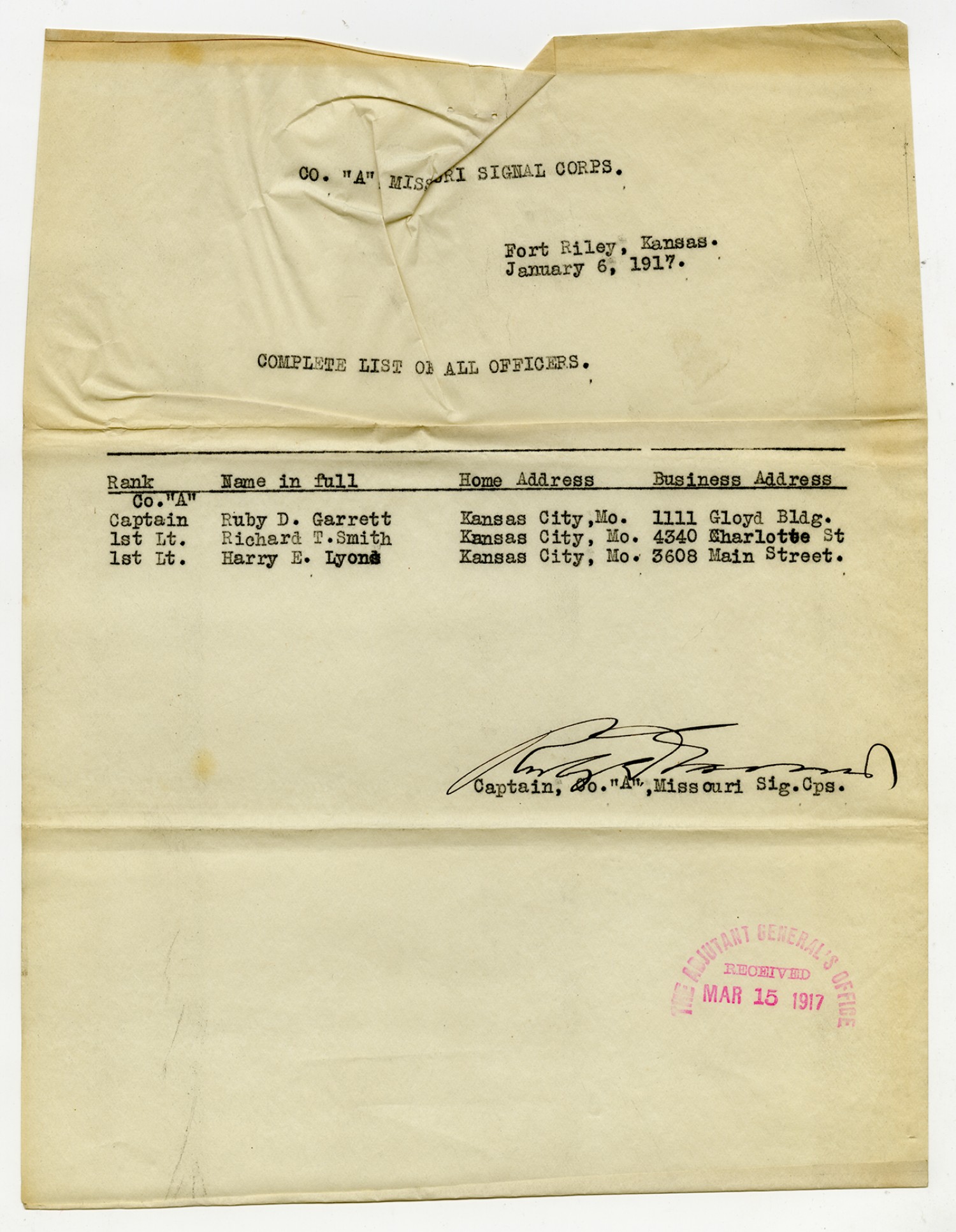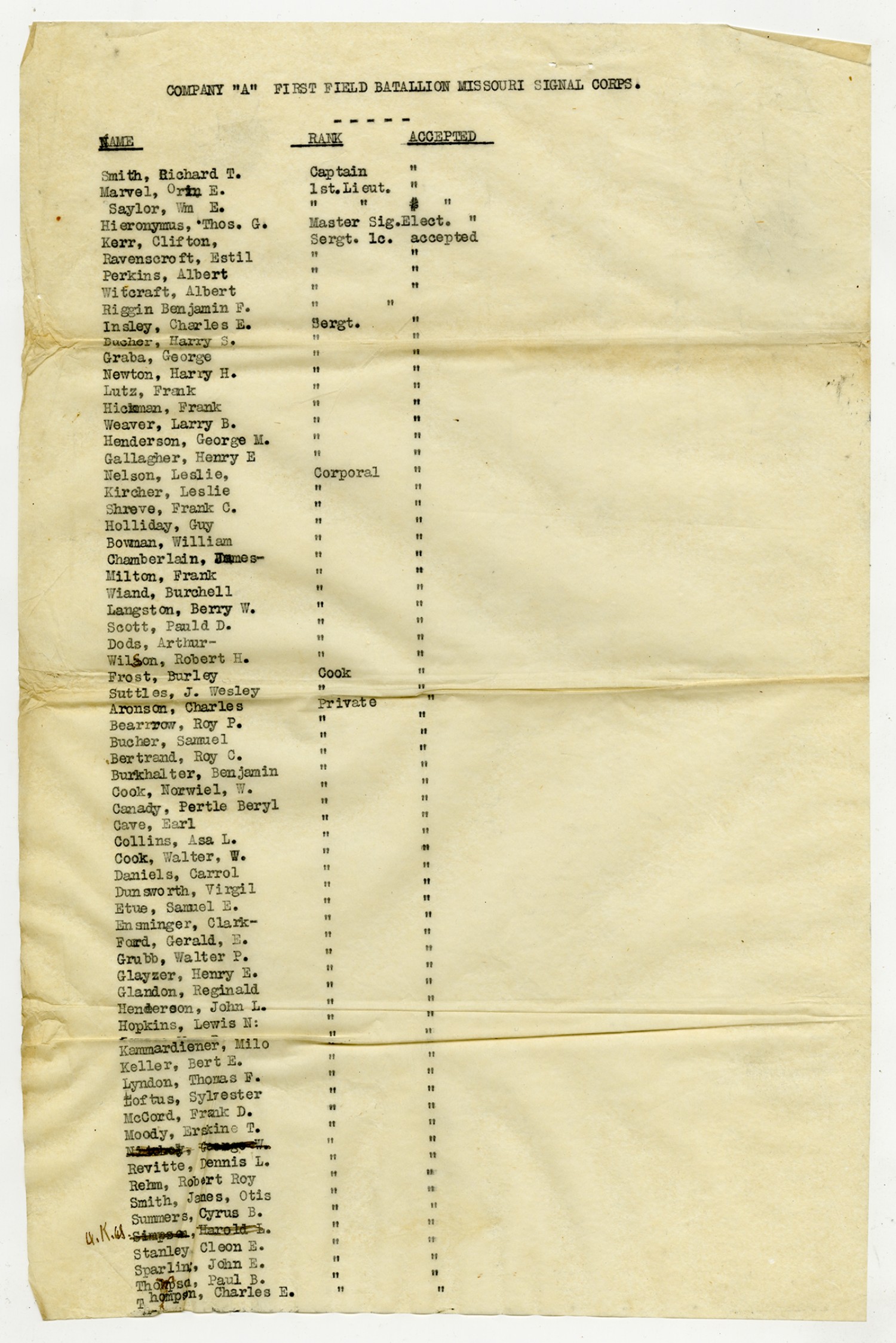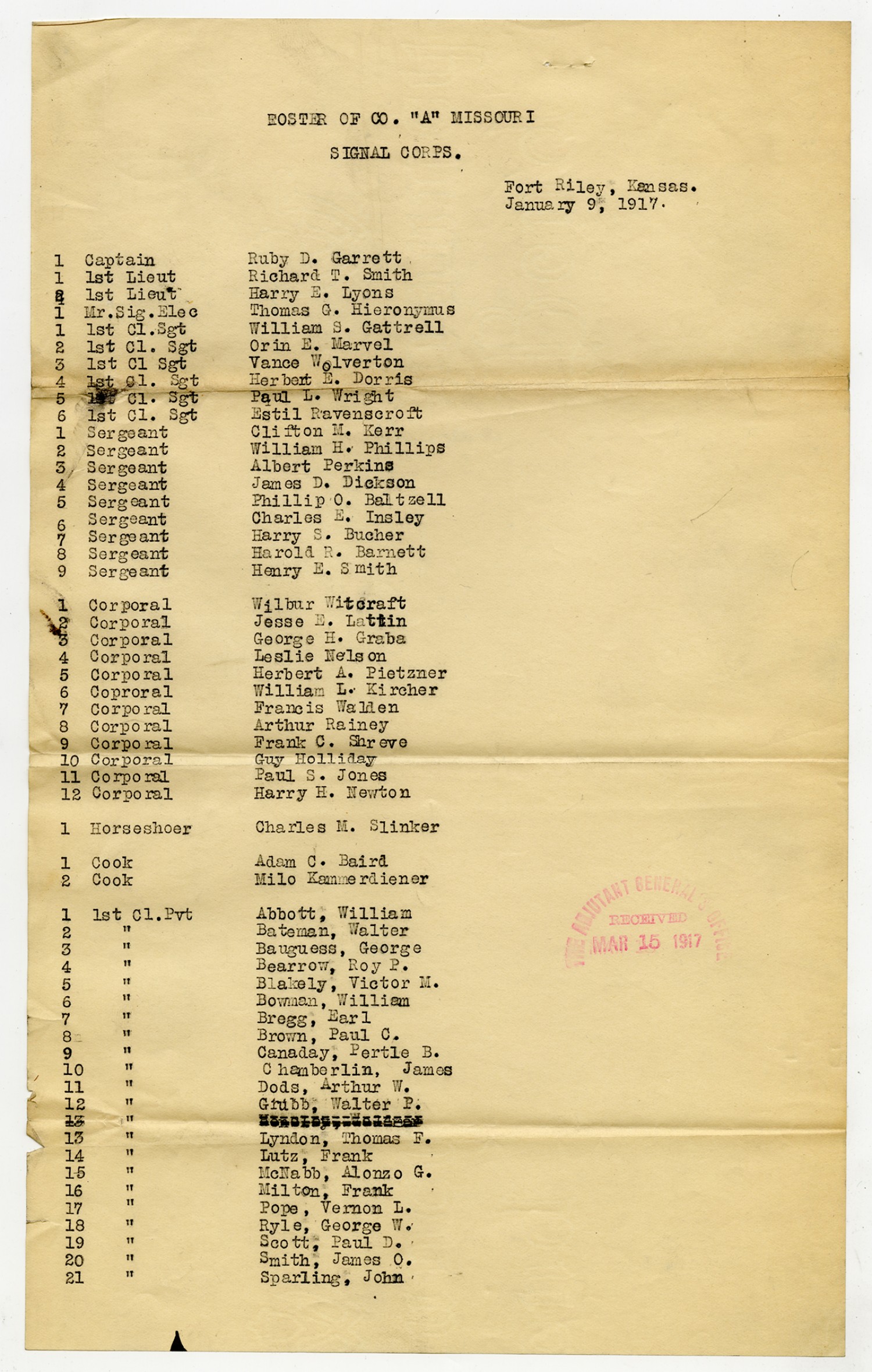 Roster of Company A Missouri Signal Corps - January 9, 1917