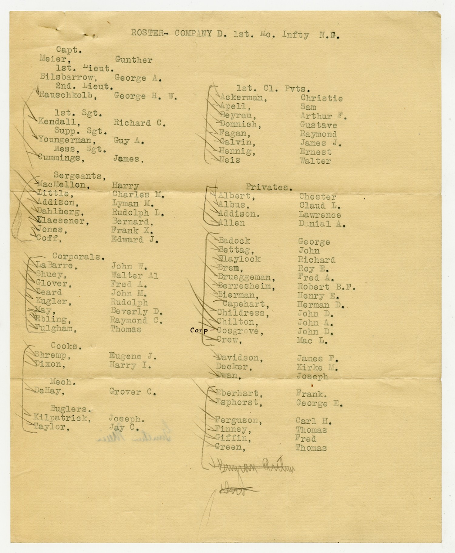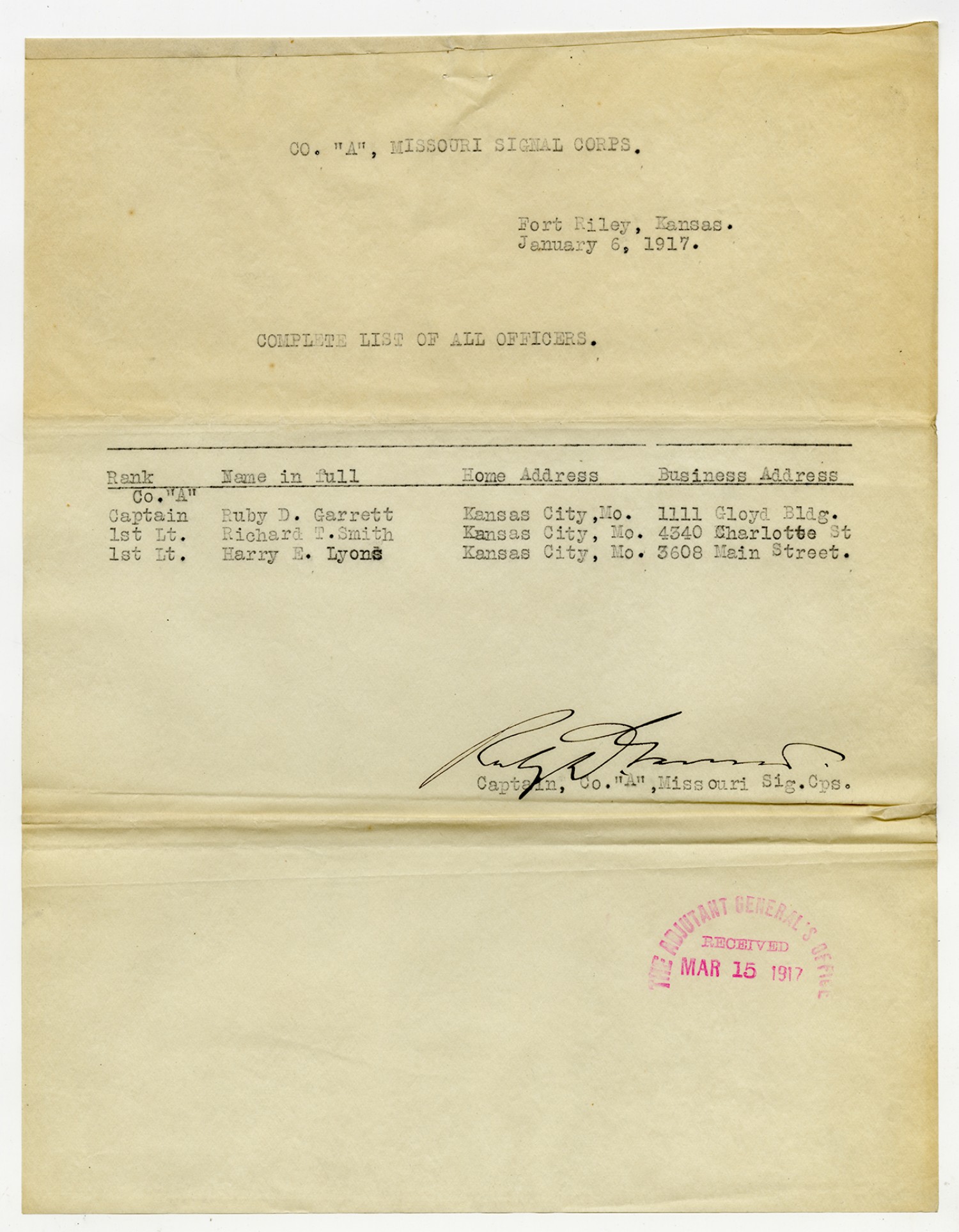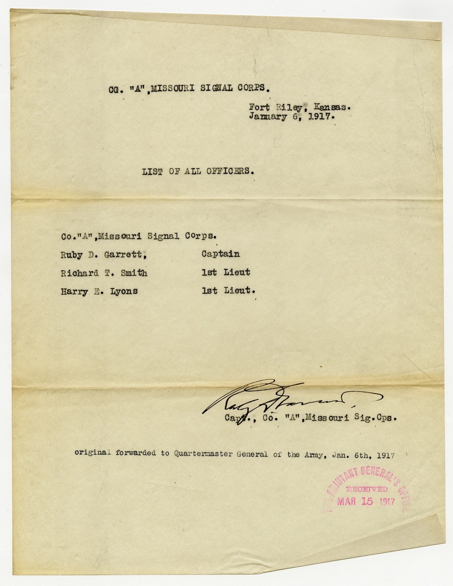 Roster of Company A Missouri Signal Corps - January 9, 1917