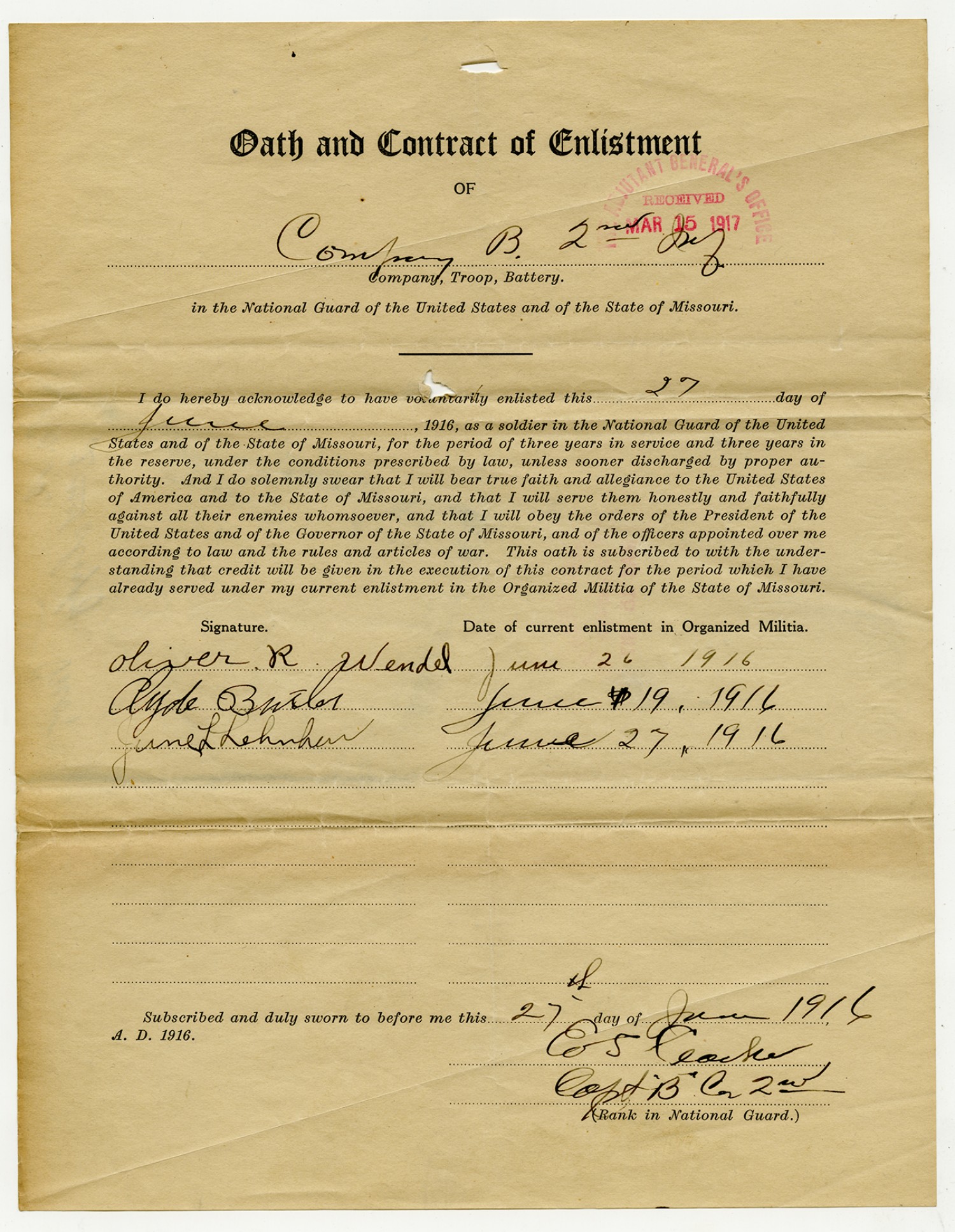 Oath and Contract of Enlistment of Company B, 2nd Missouri Infantry - June 26, 1916