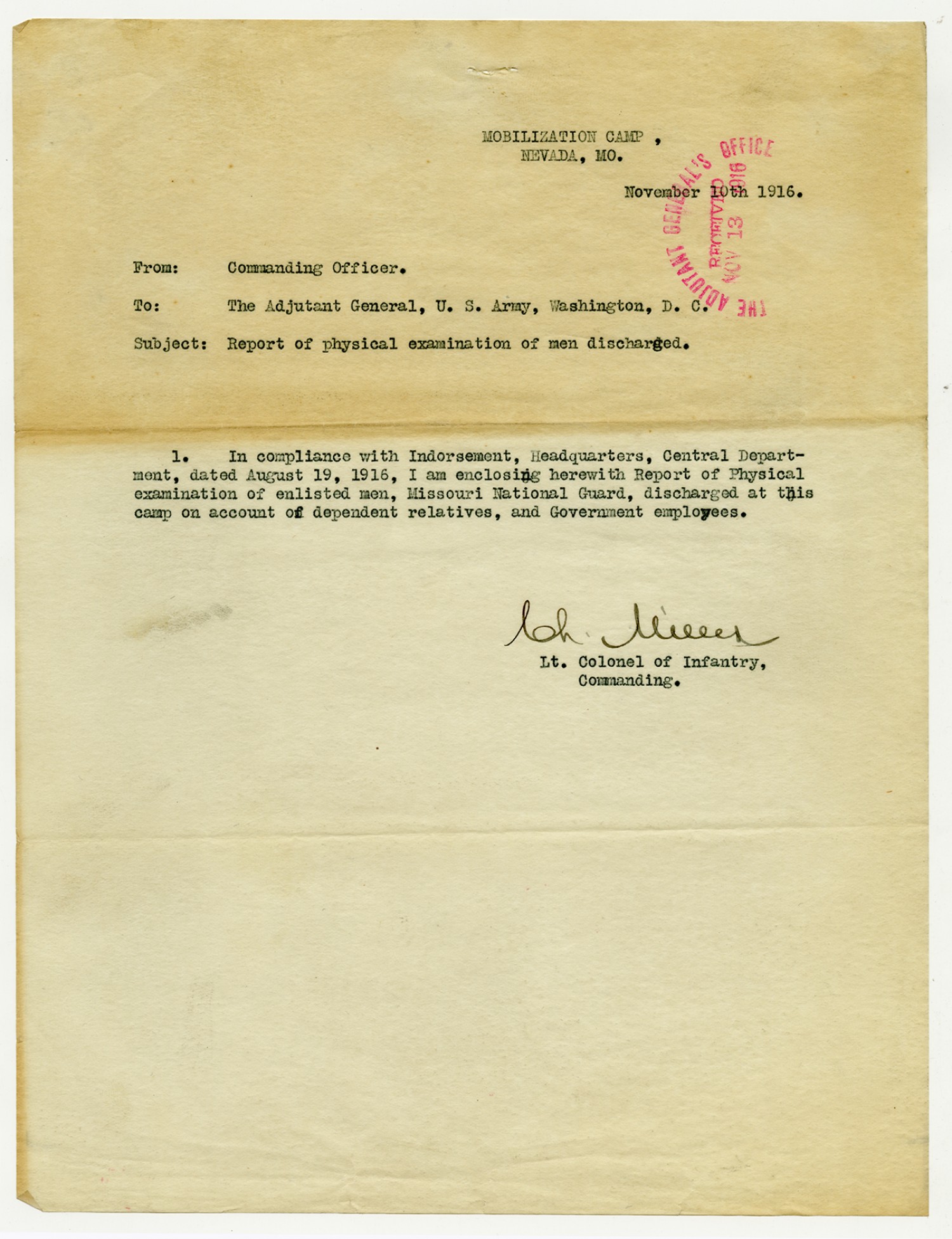 Lt. Colonel Miller letter to the Adjutant General - November 10, 1916