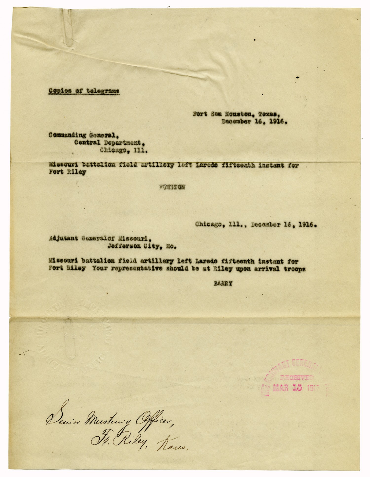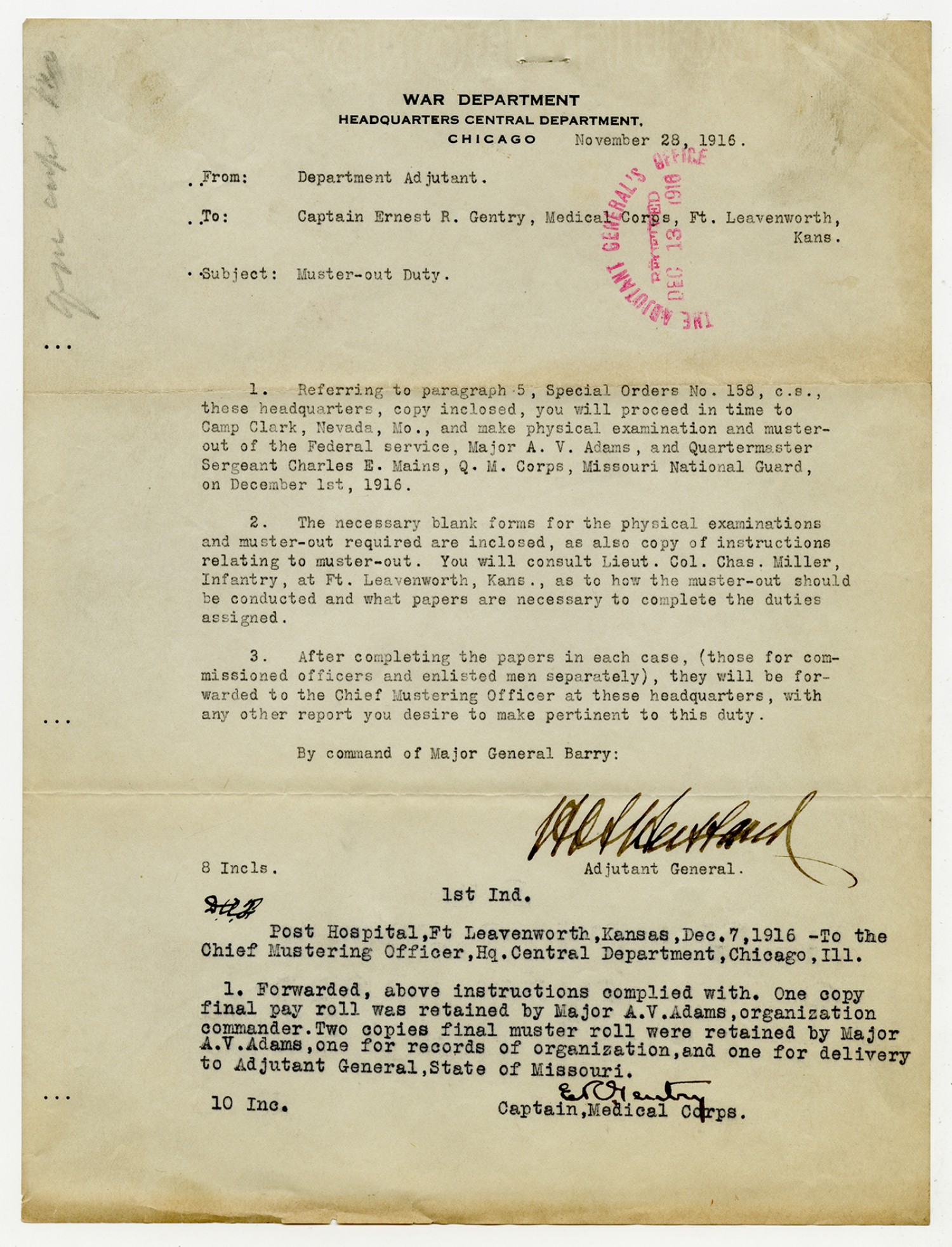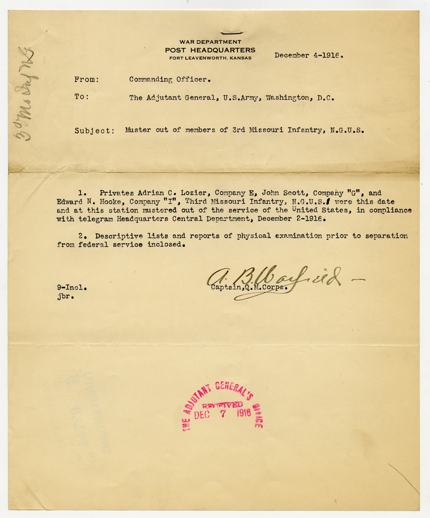 Adjutant General letter to the Senior Mustering Officer - December 27, 1916
