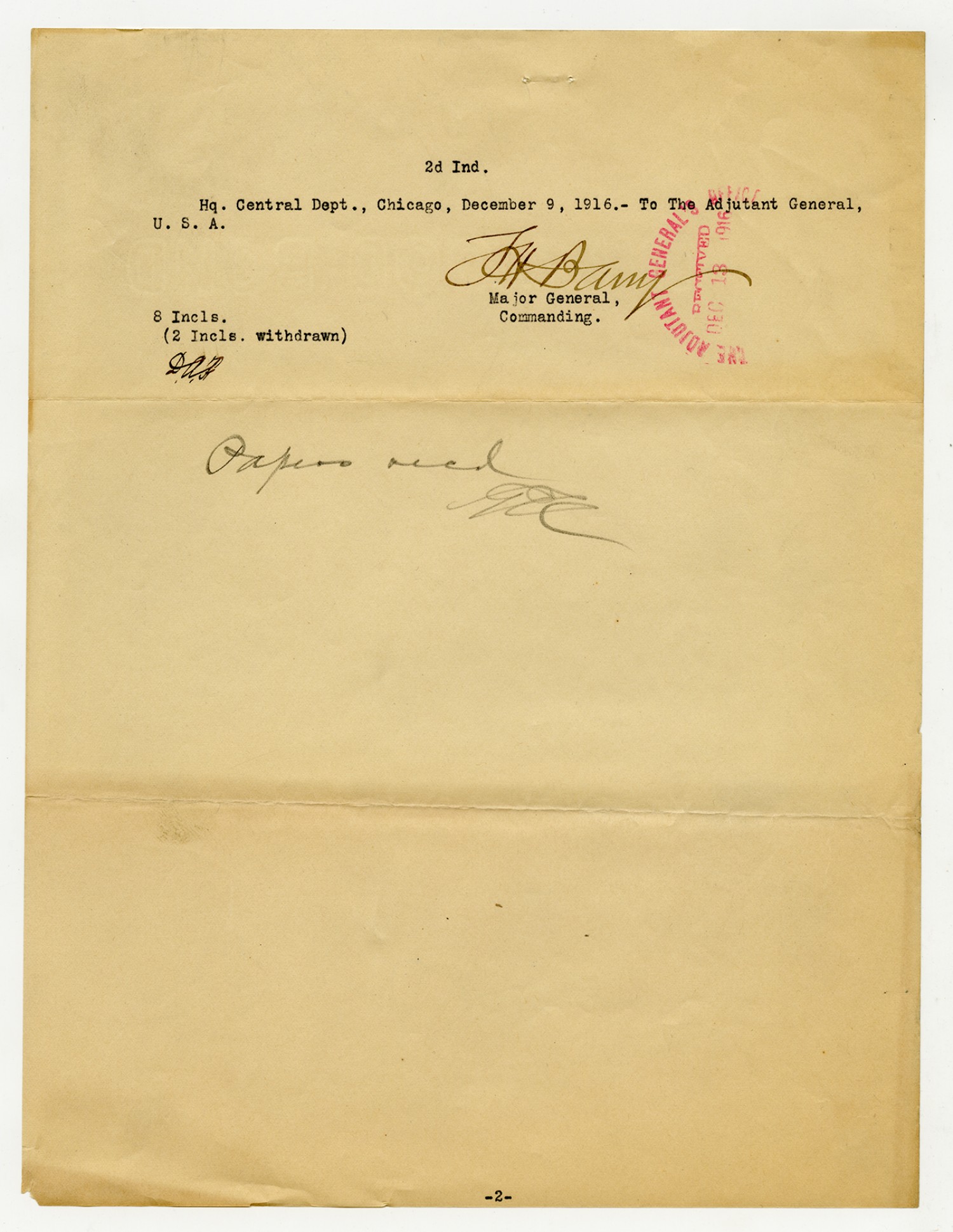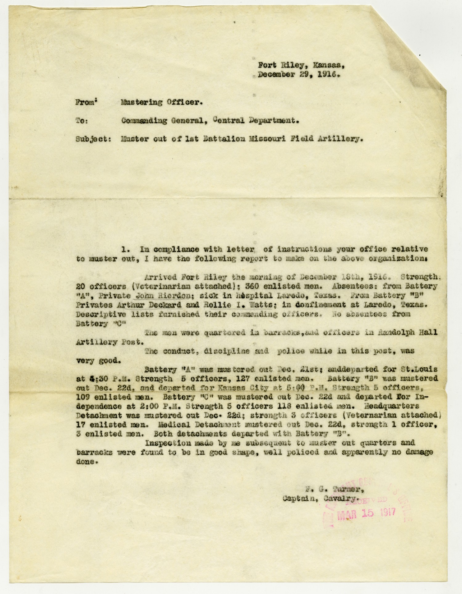 F.G. Turner letter to the Commanding General, Central Department - December 29, 1916