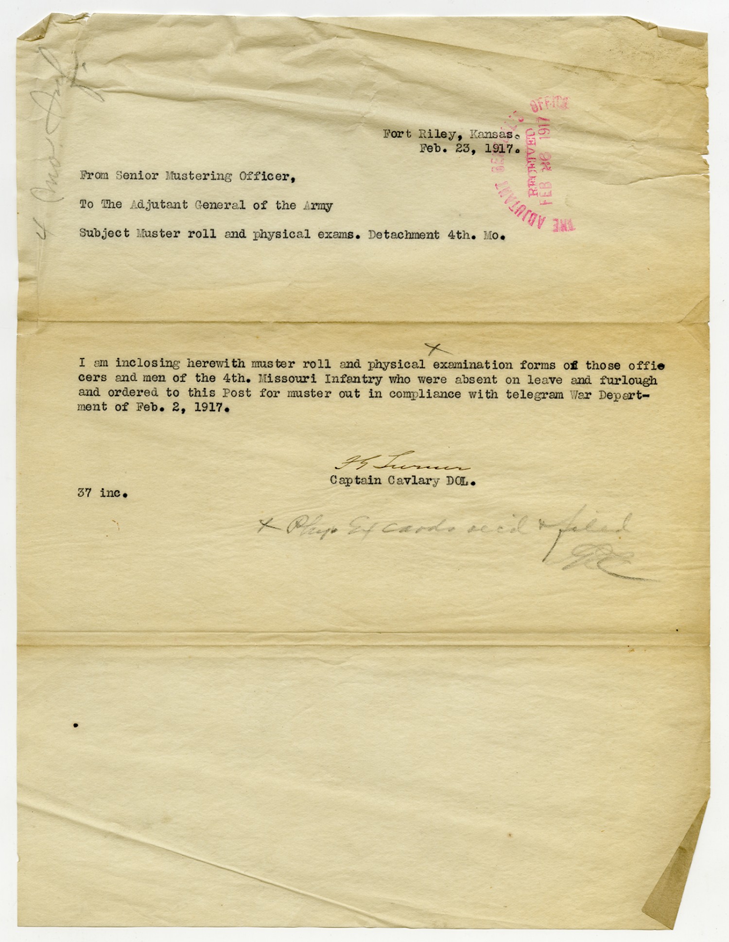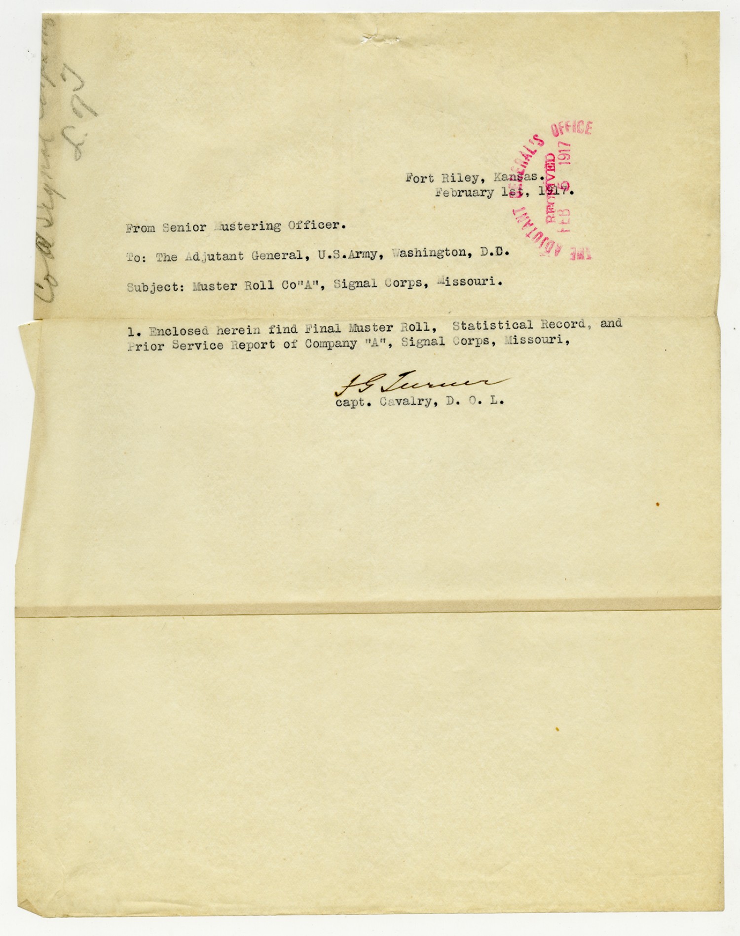 Captain Turner letter to the Adjutant General - February 1, 1917