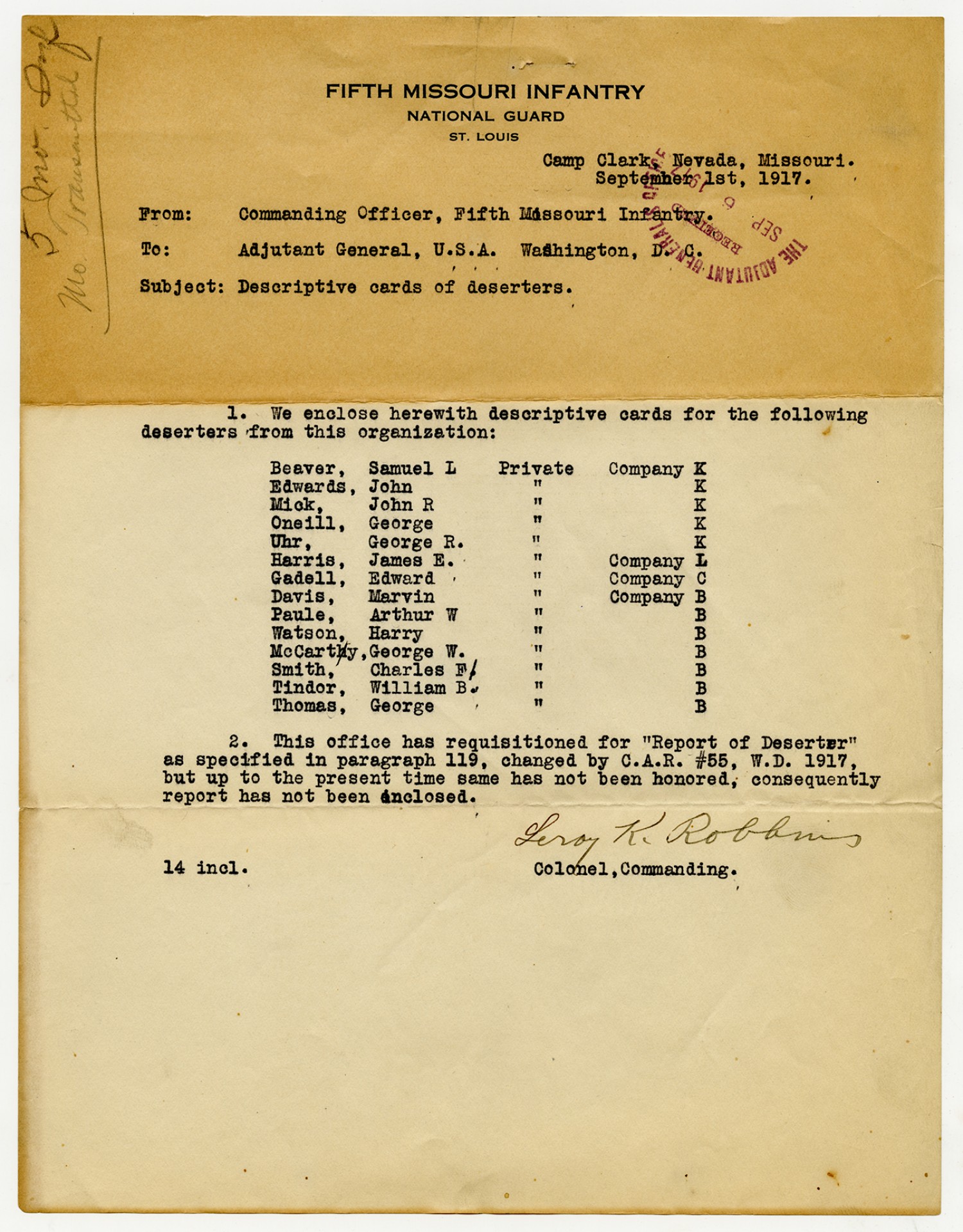 Leroy K. Robbins letter to Adjutant General - September 1, 1917