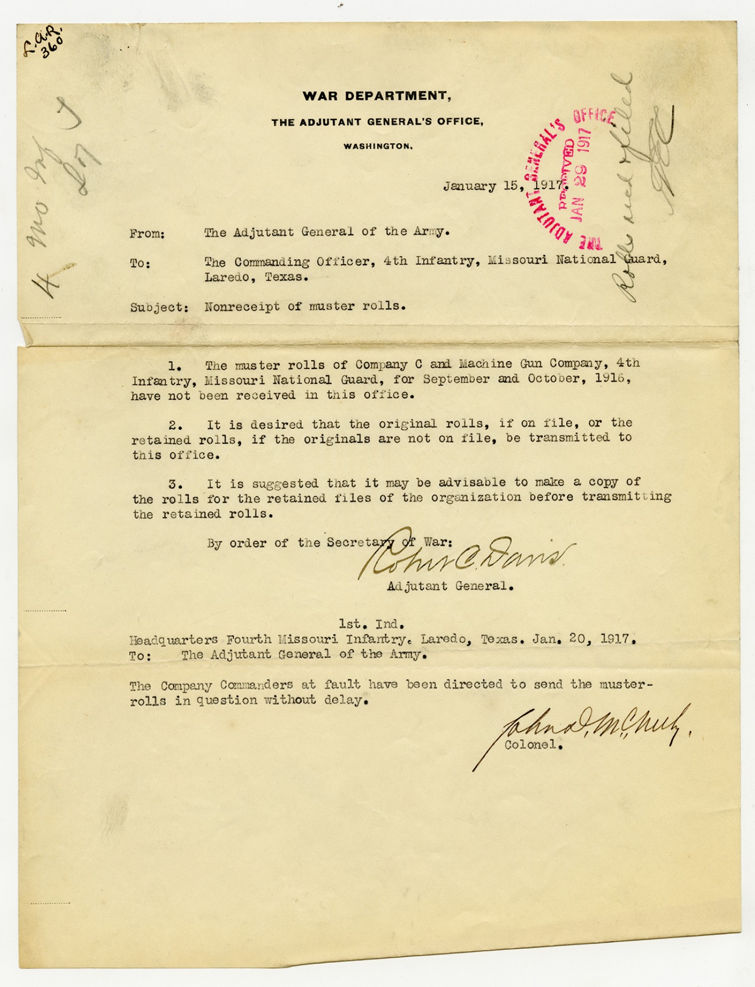 Robert C. Davis letter to the Commanding Officer, 4th Infantry - January 15, 1917