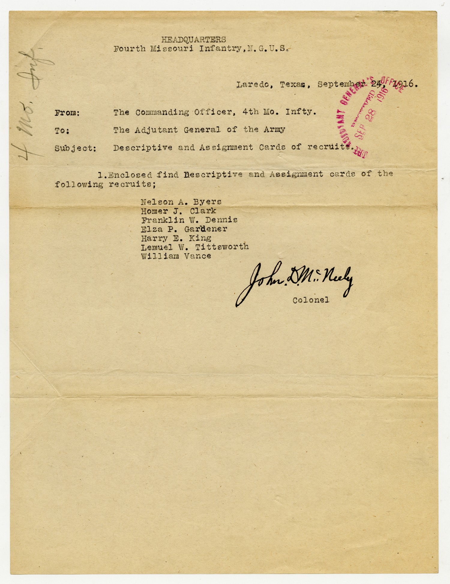 John D. McNeely letter to the Adjutant General - September 24, 1916