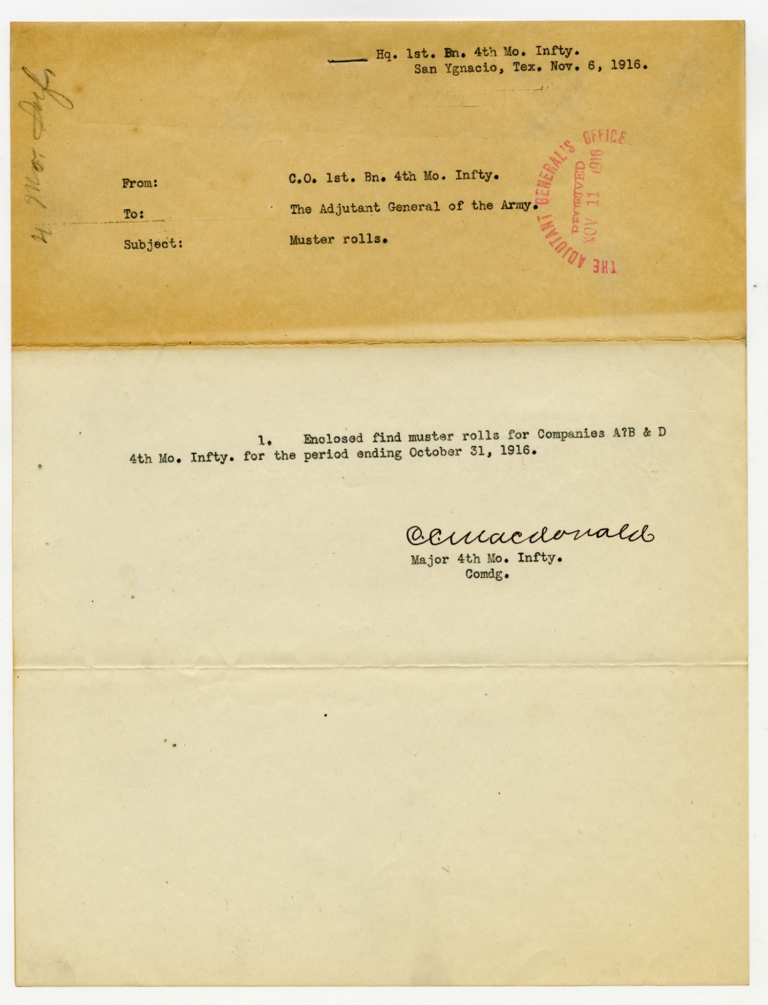 Major MacDonald letter to the Adjutant General - November 6, 1916