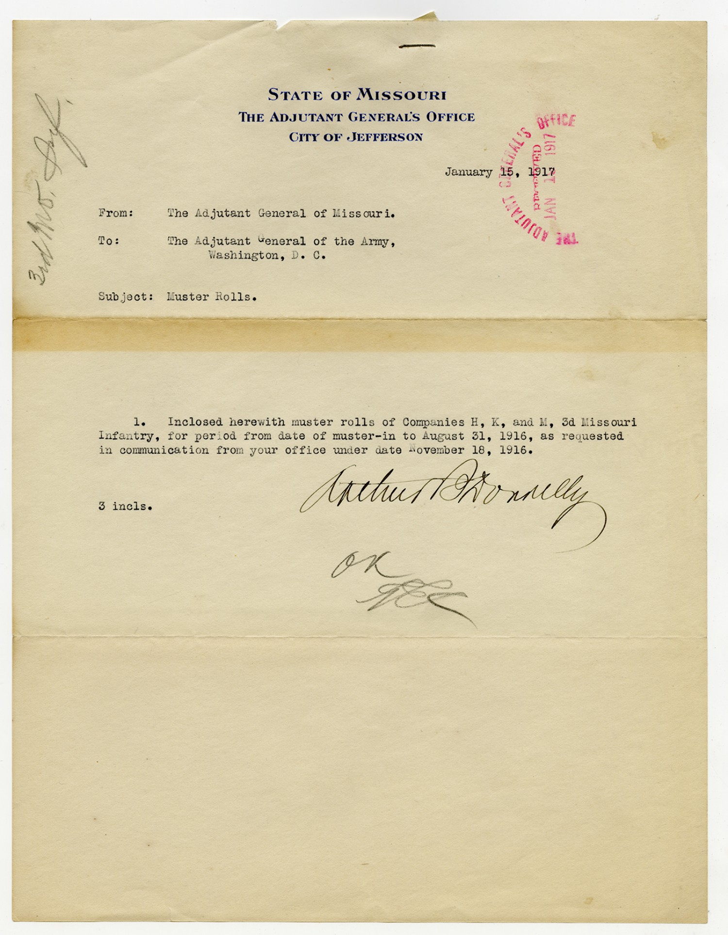 Arthur Donnelly letter to the Adjutant General - January 15, 1917