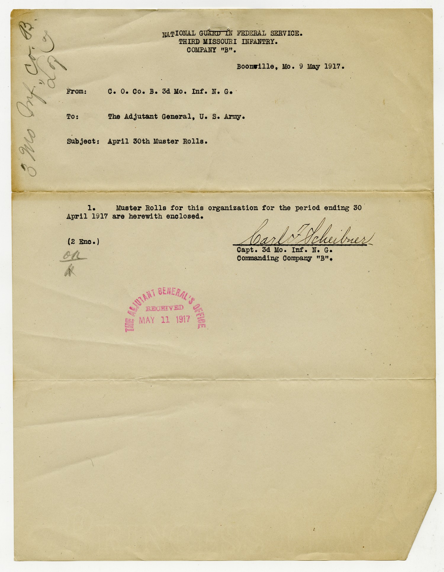 Carl Scheibner letter to the Adjutant General - May 9, 1917