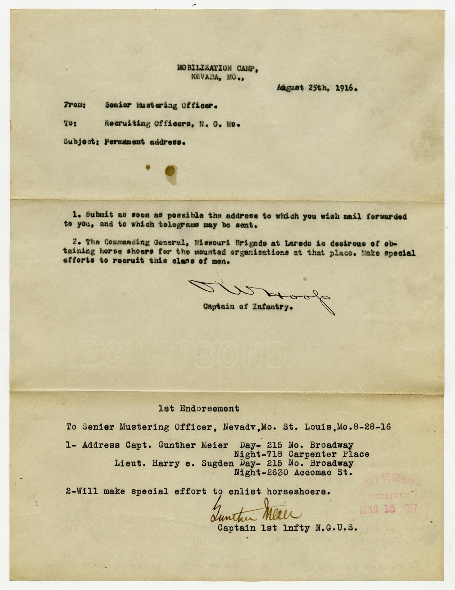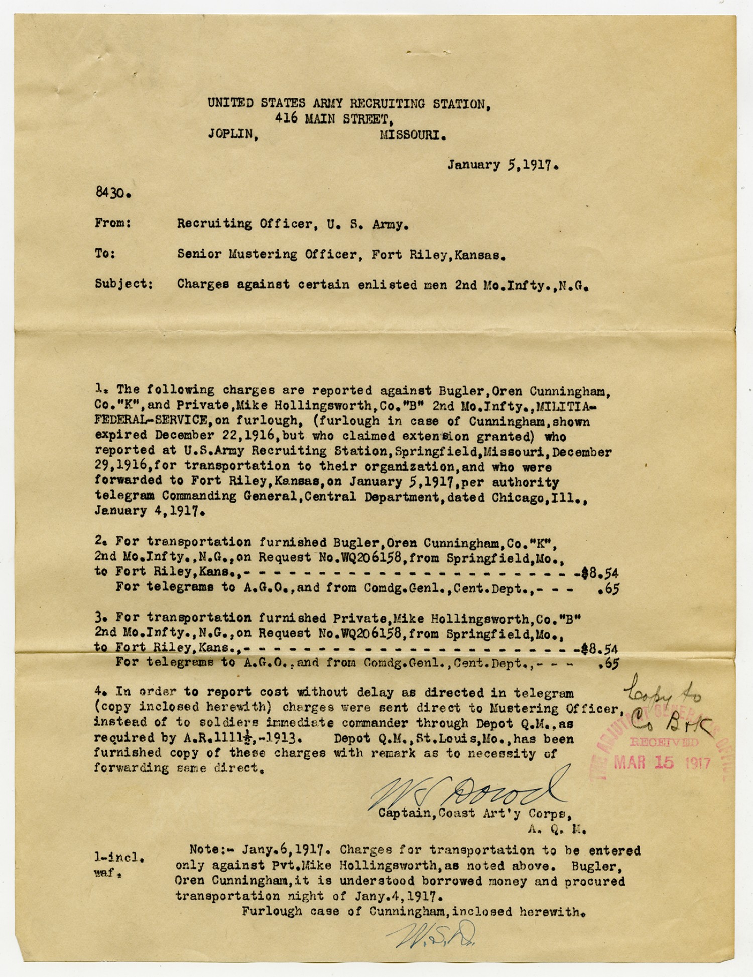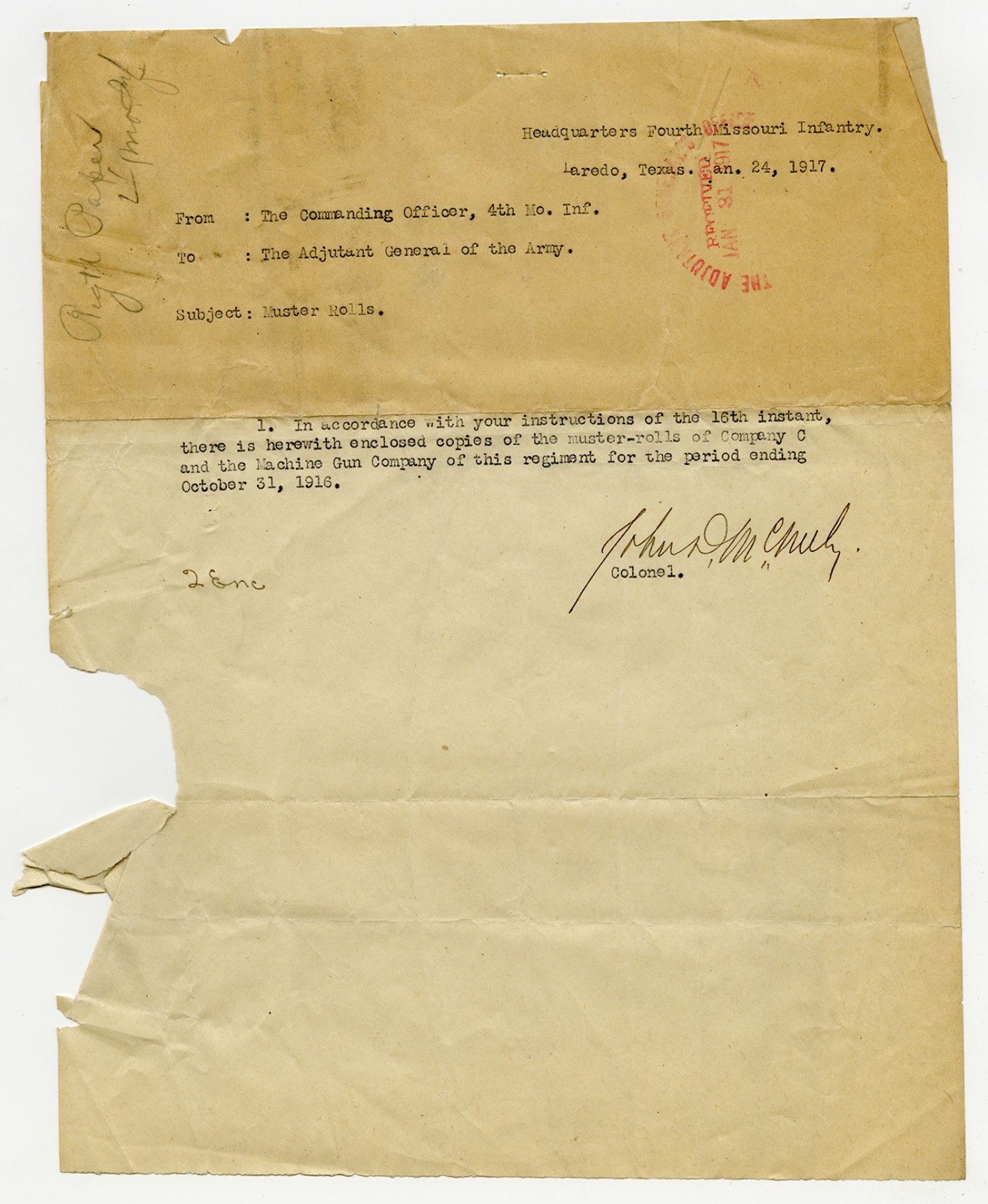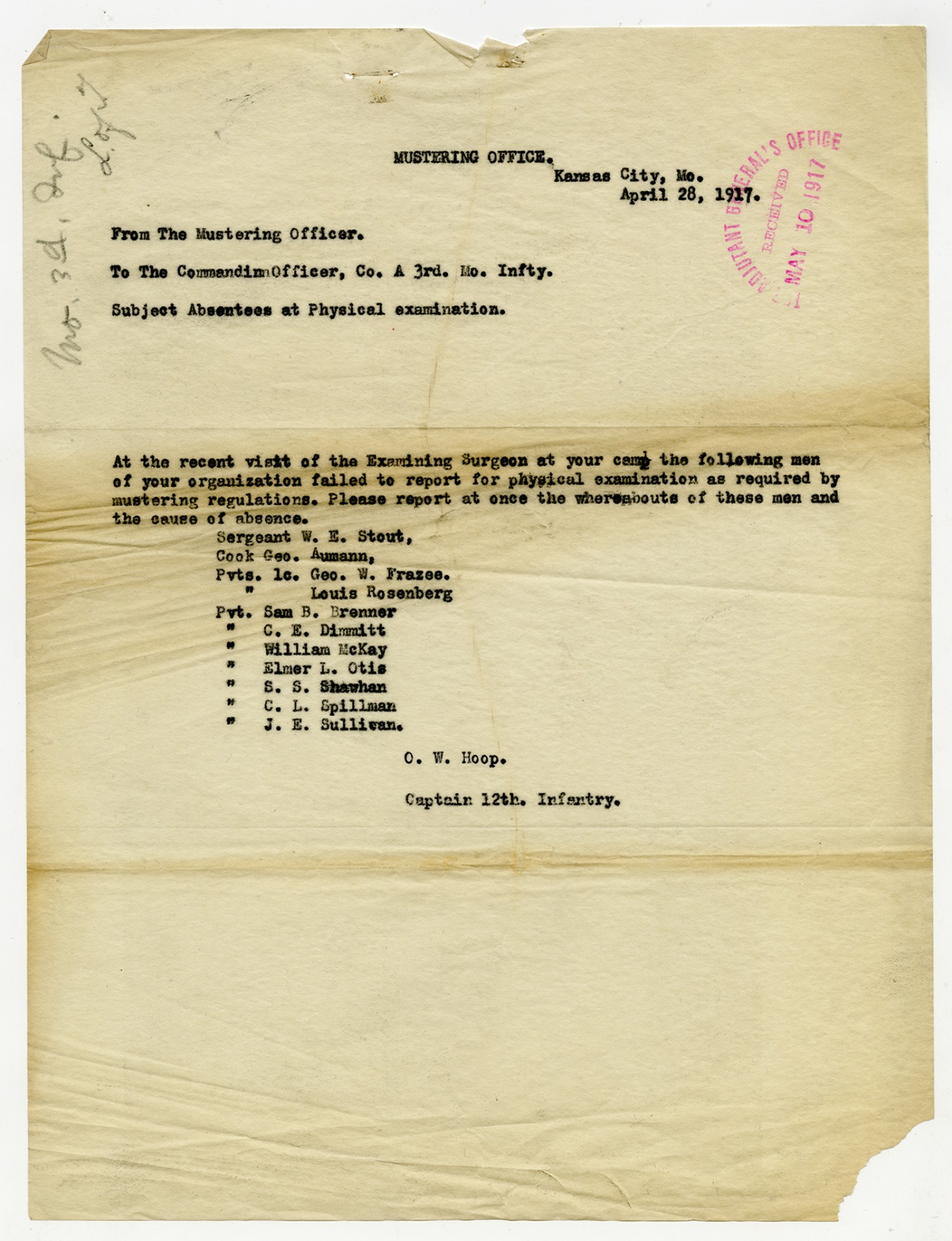 C.W. Hoop letter to the Commanding Officer, 3rd Missouri Infantry - April 28, 1917