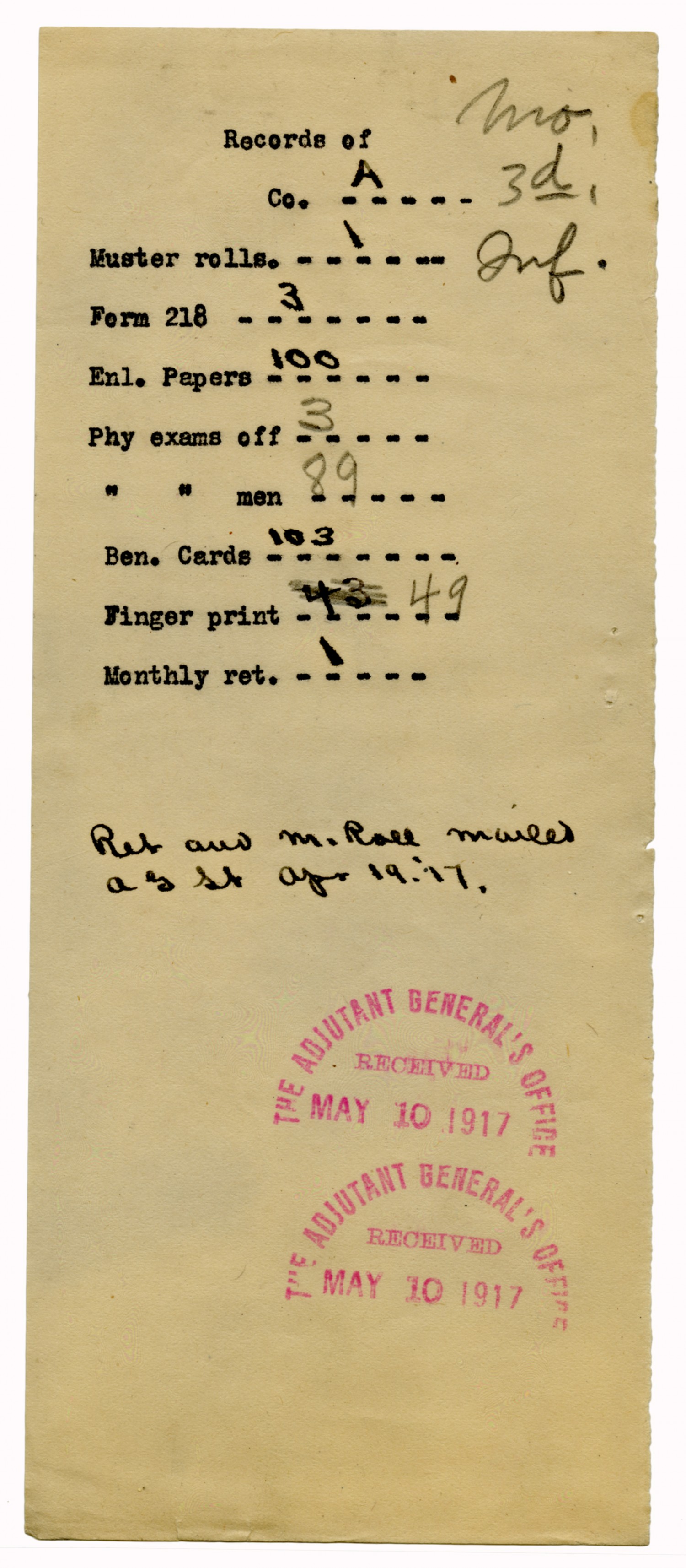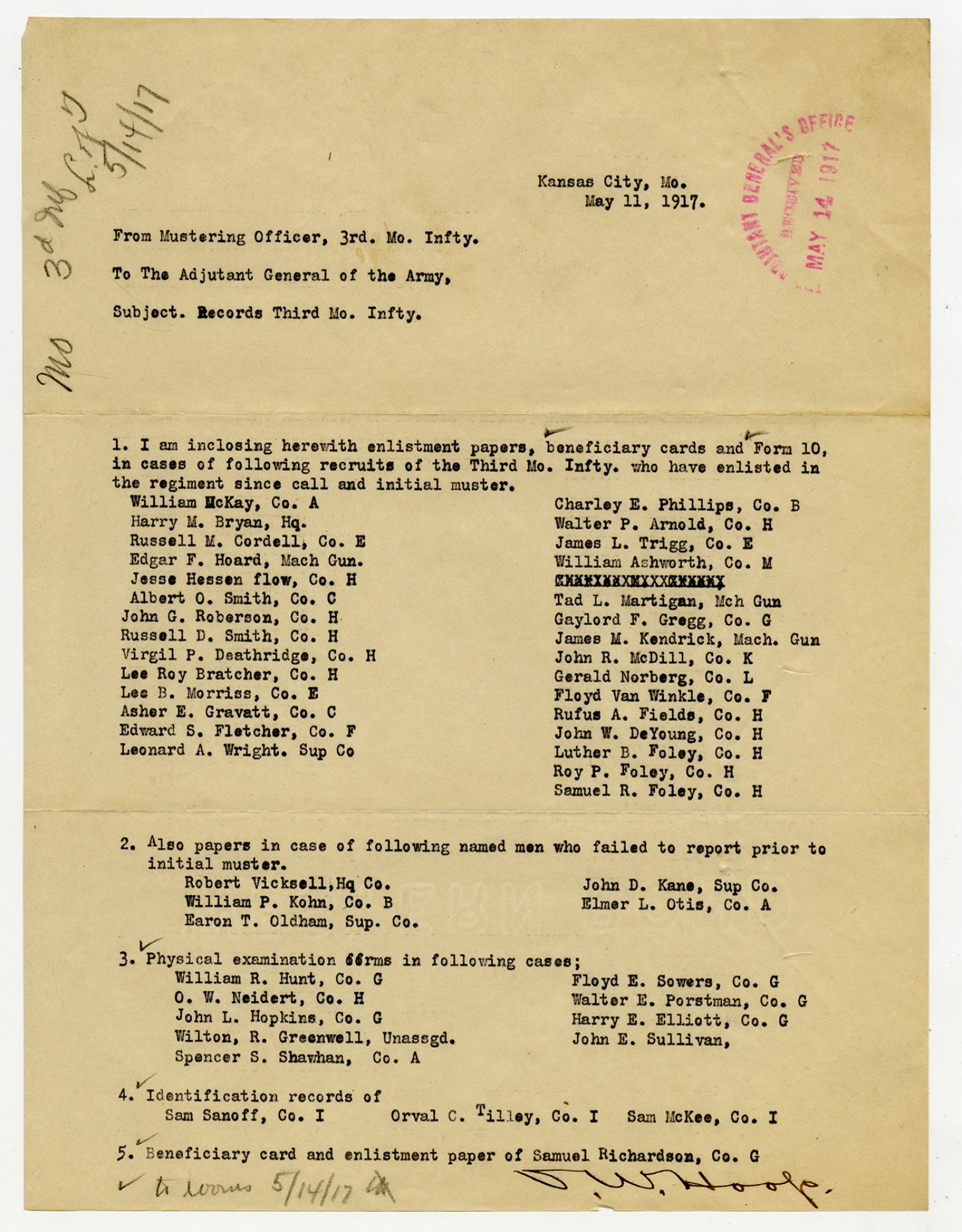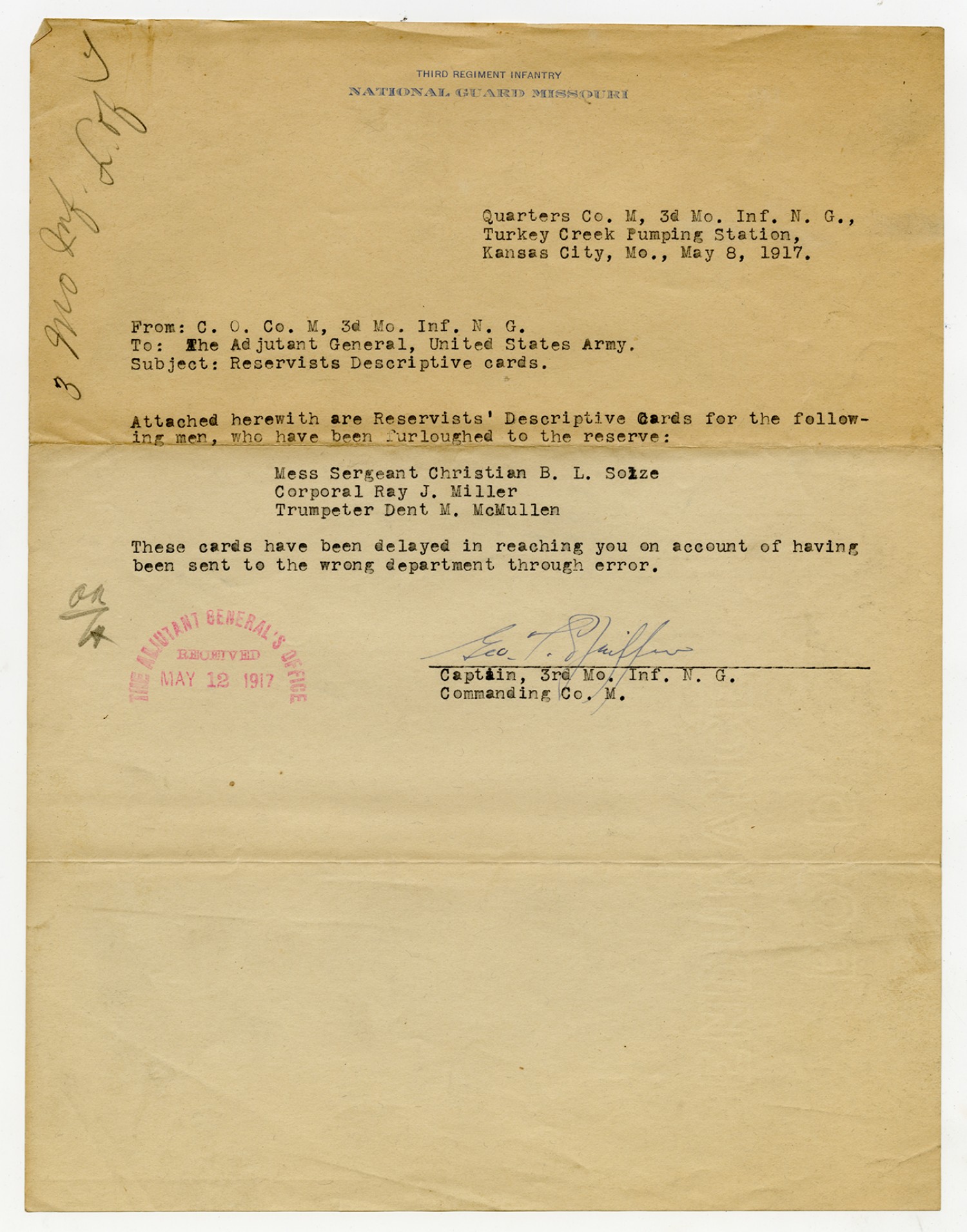 Captain of Company M letter to the Adjutant General - May 8, 1917