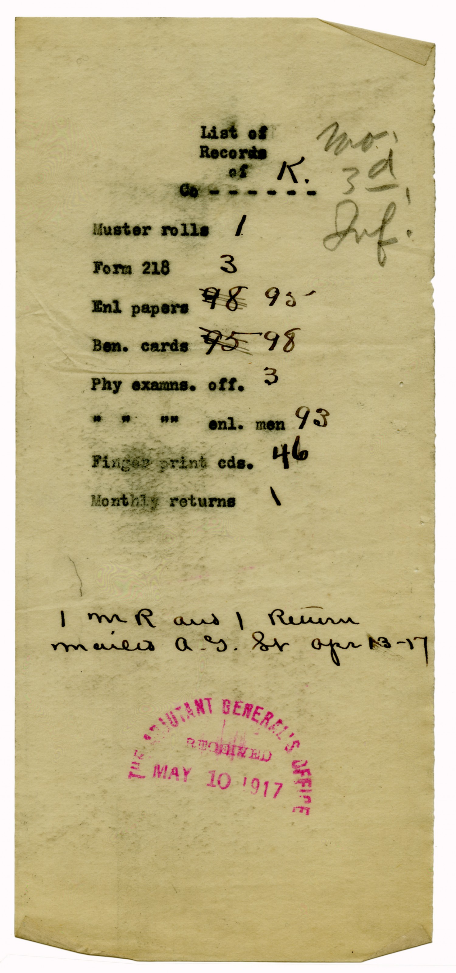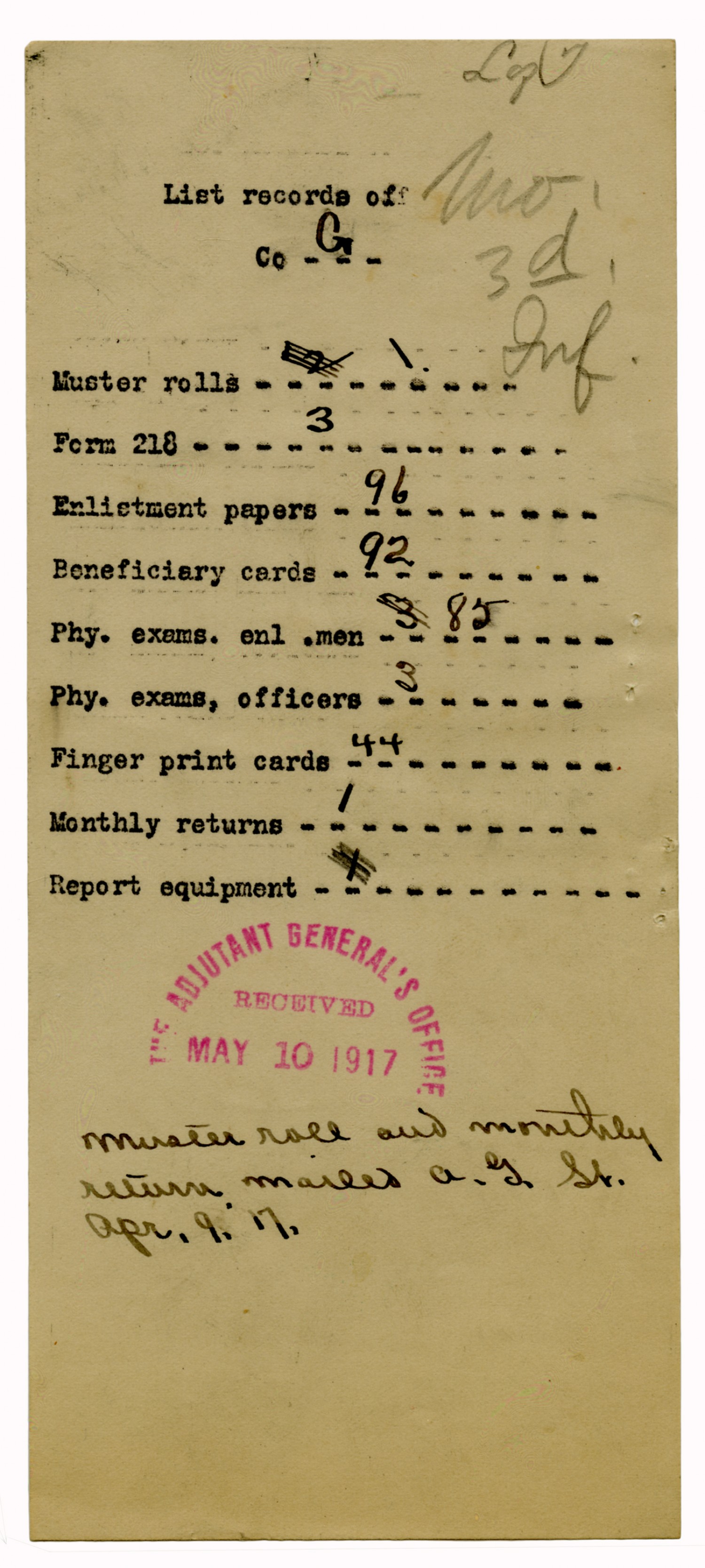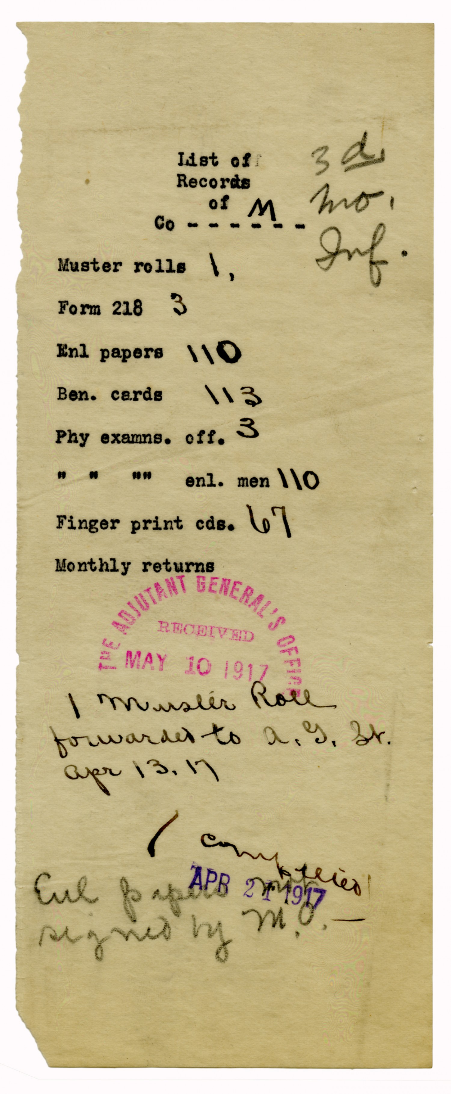 Captain of Company M letter to the Adjutant General - May 8, 1917
