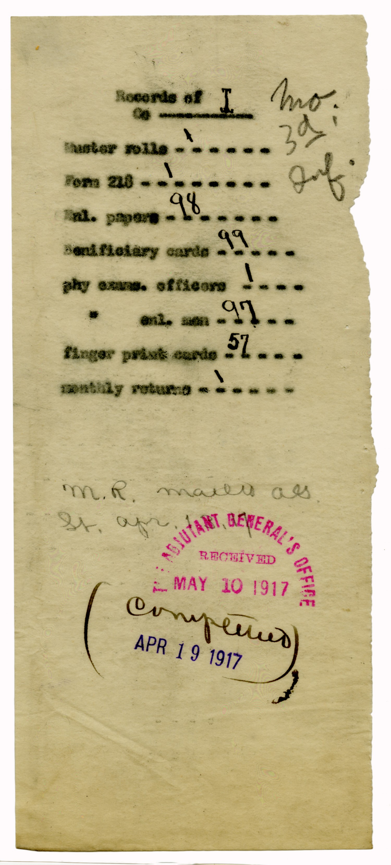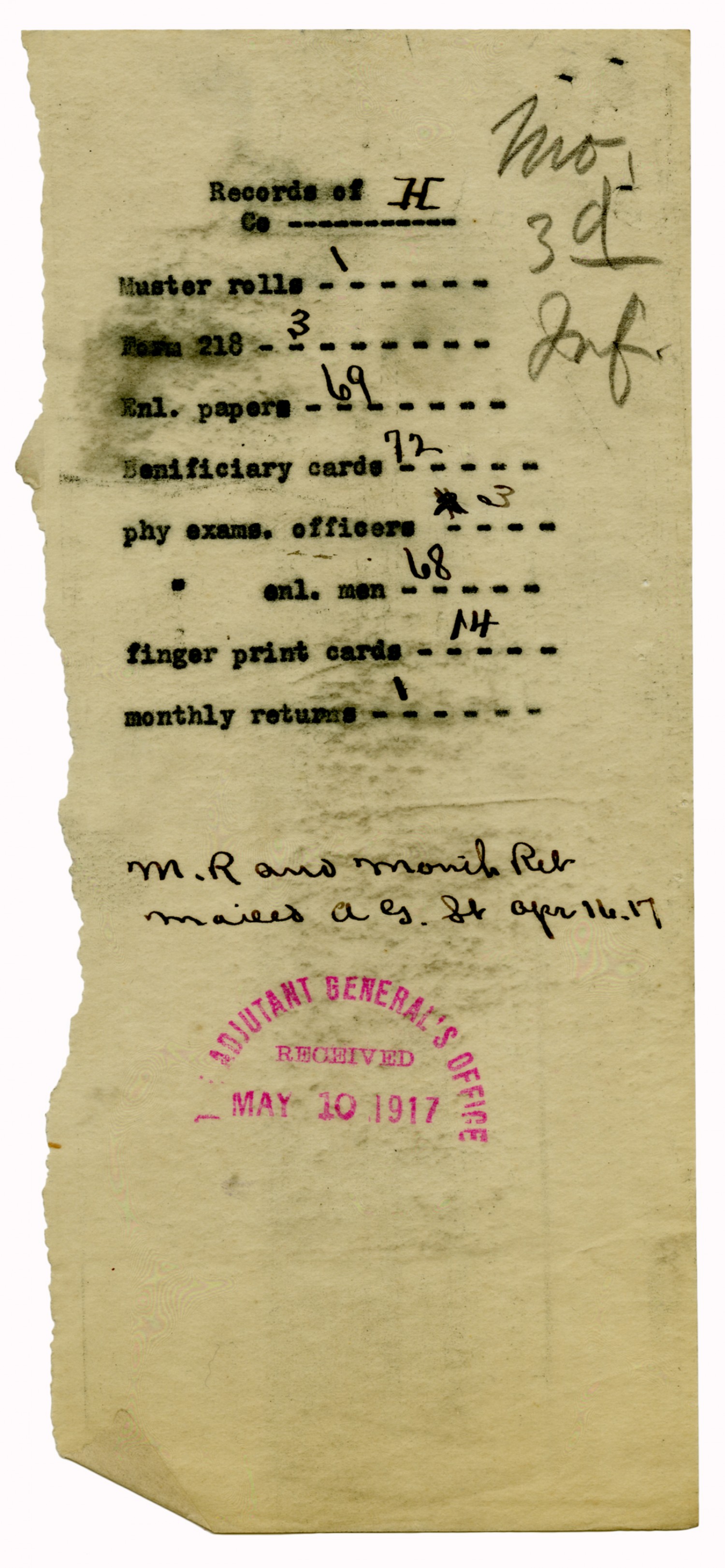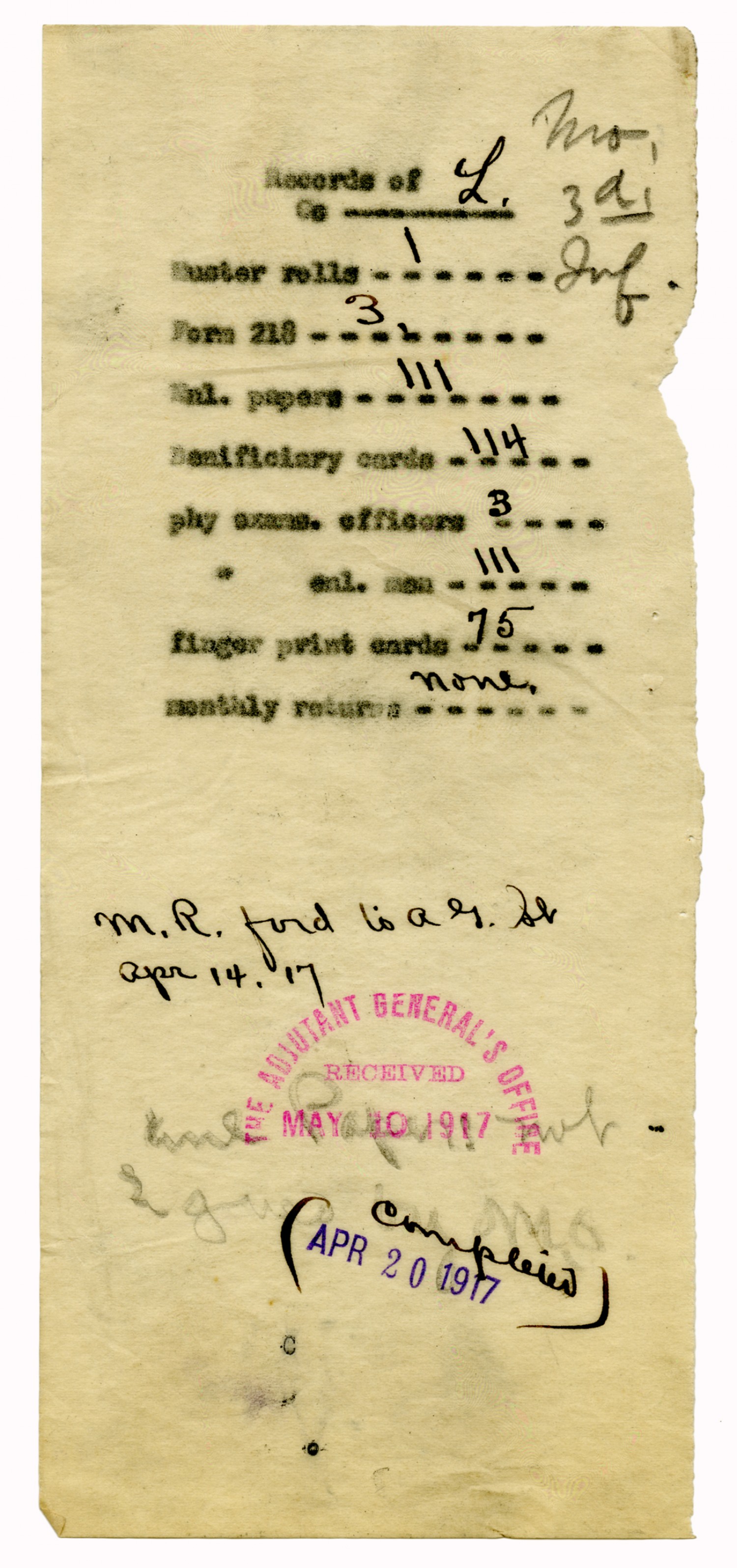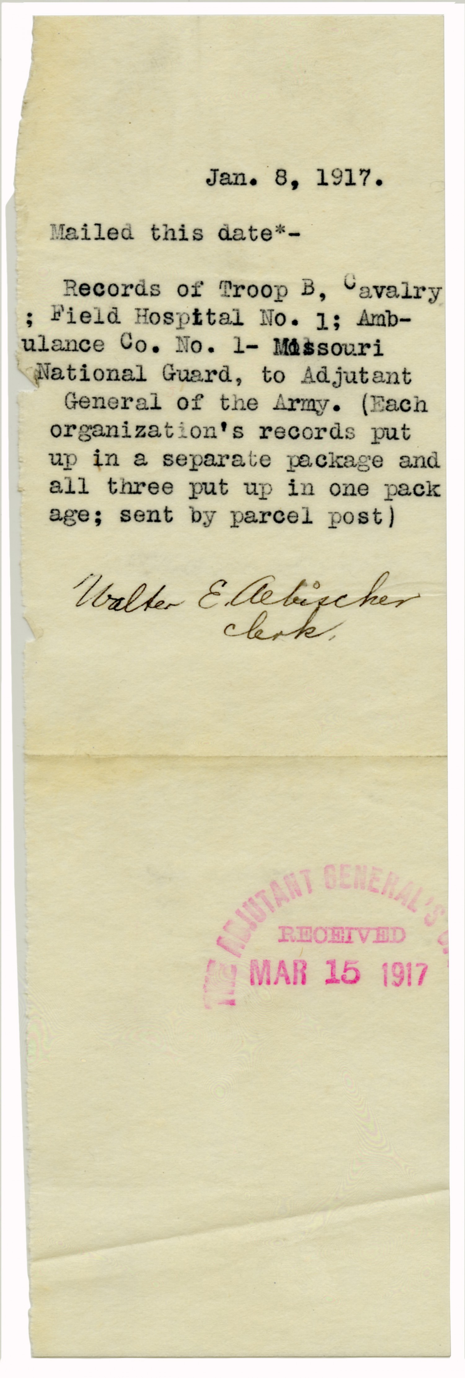 Mail Slip for Records of Troop B - January 8, 1917