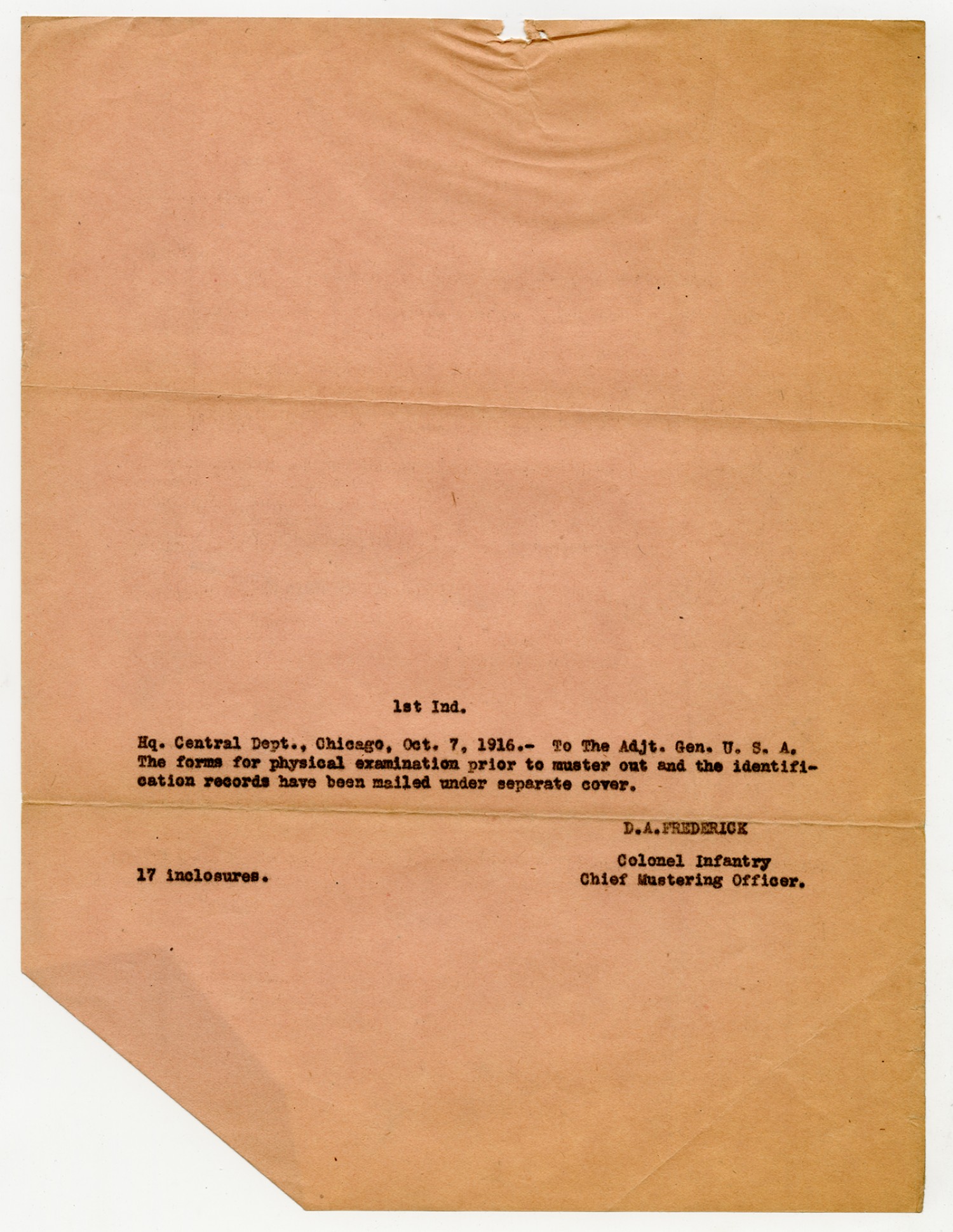 D.A. Frederick letter to the Senior Mustering Officer - January 6, 1917