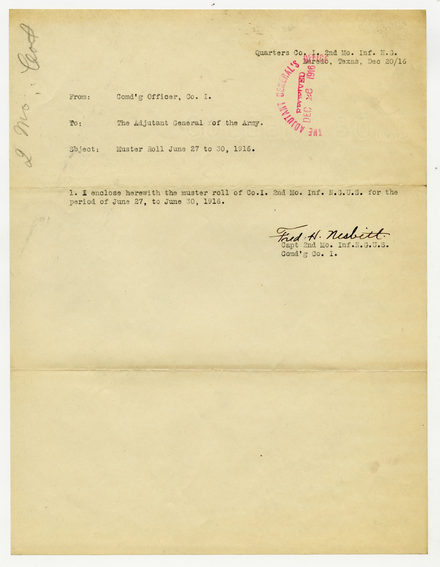 Fred H. Nesbitt letter to the Adjutant General - December 20, 1916