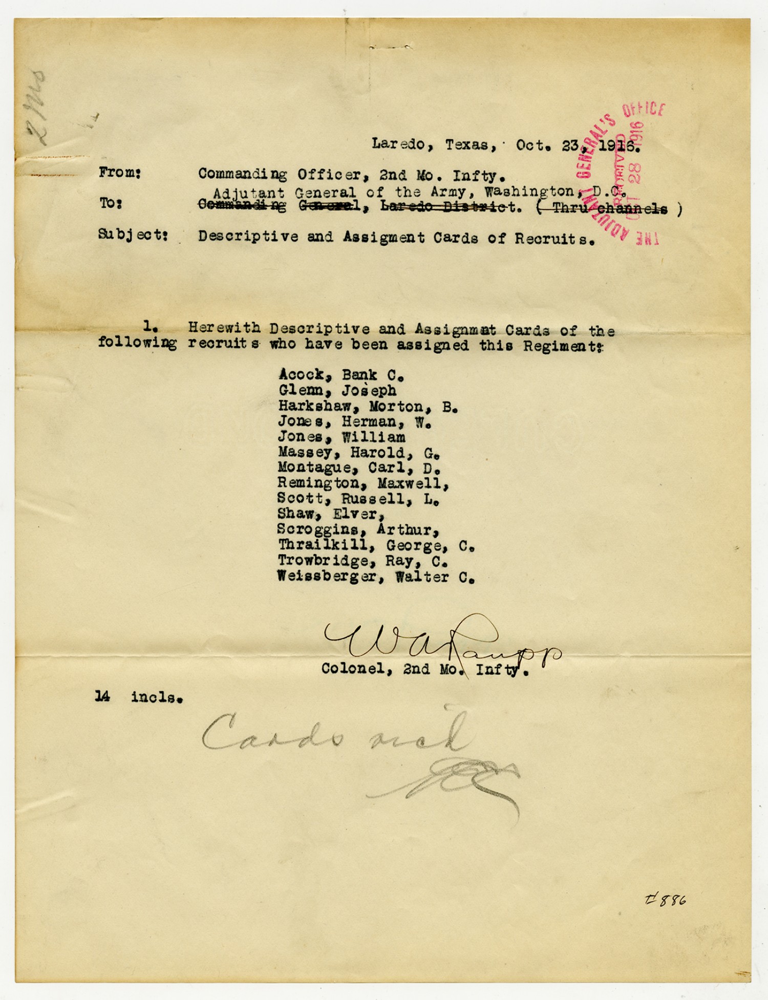 W.A. Raupp letter to the Adjutant General - October 23, 1916