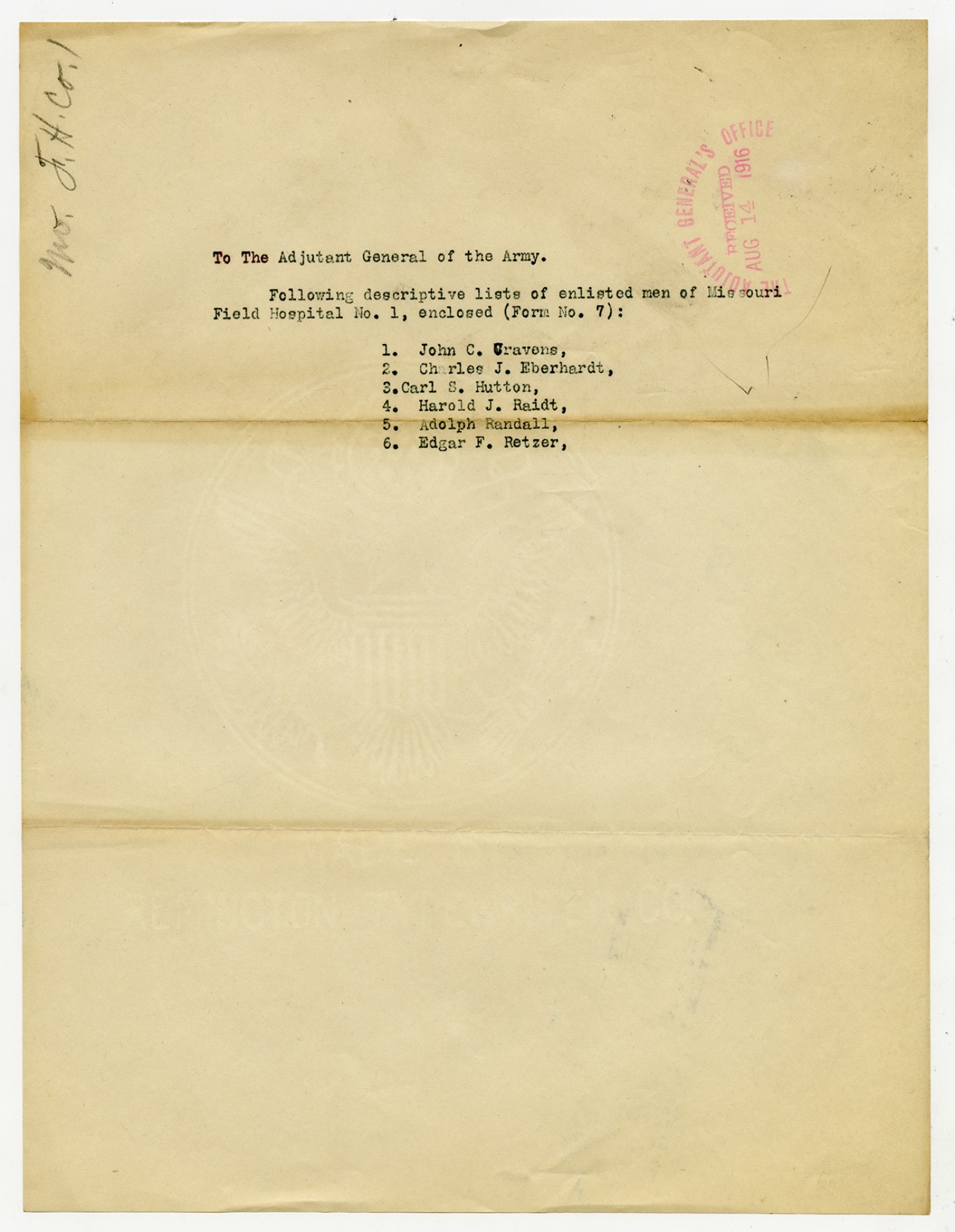 Letter to Adjutant General of the Army - August 14, 1916