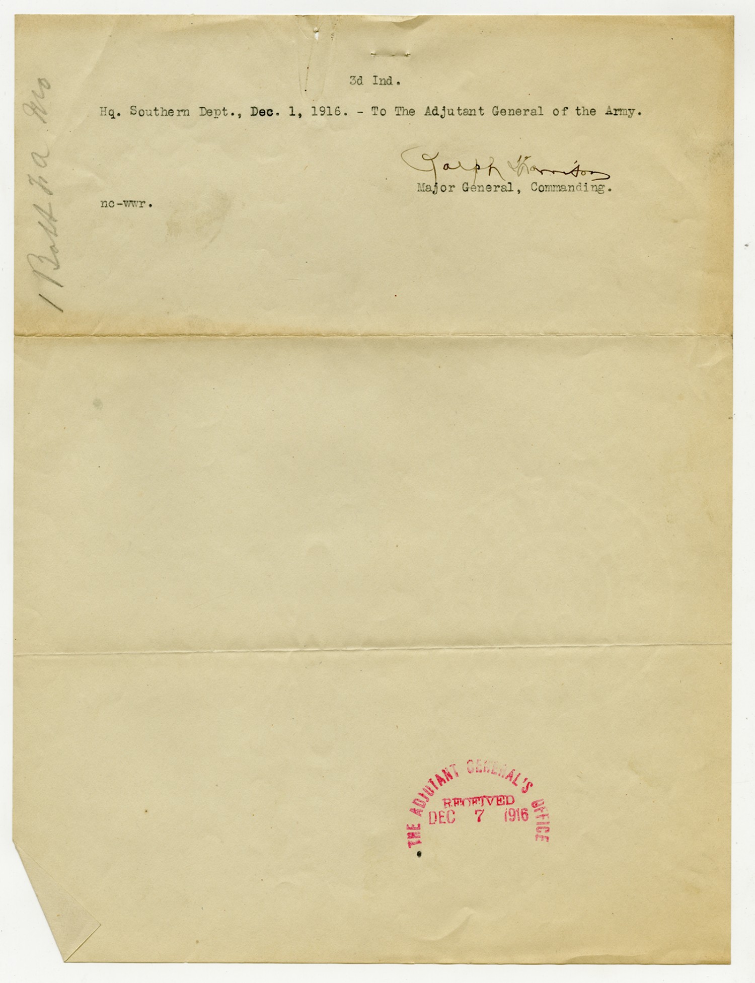 Major Cavalry letter to the Quartermaster General - December 30, 1916