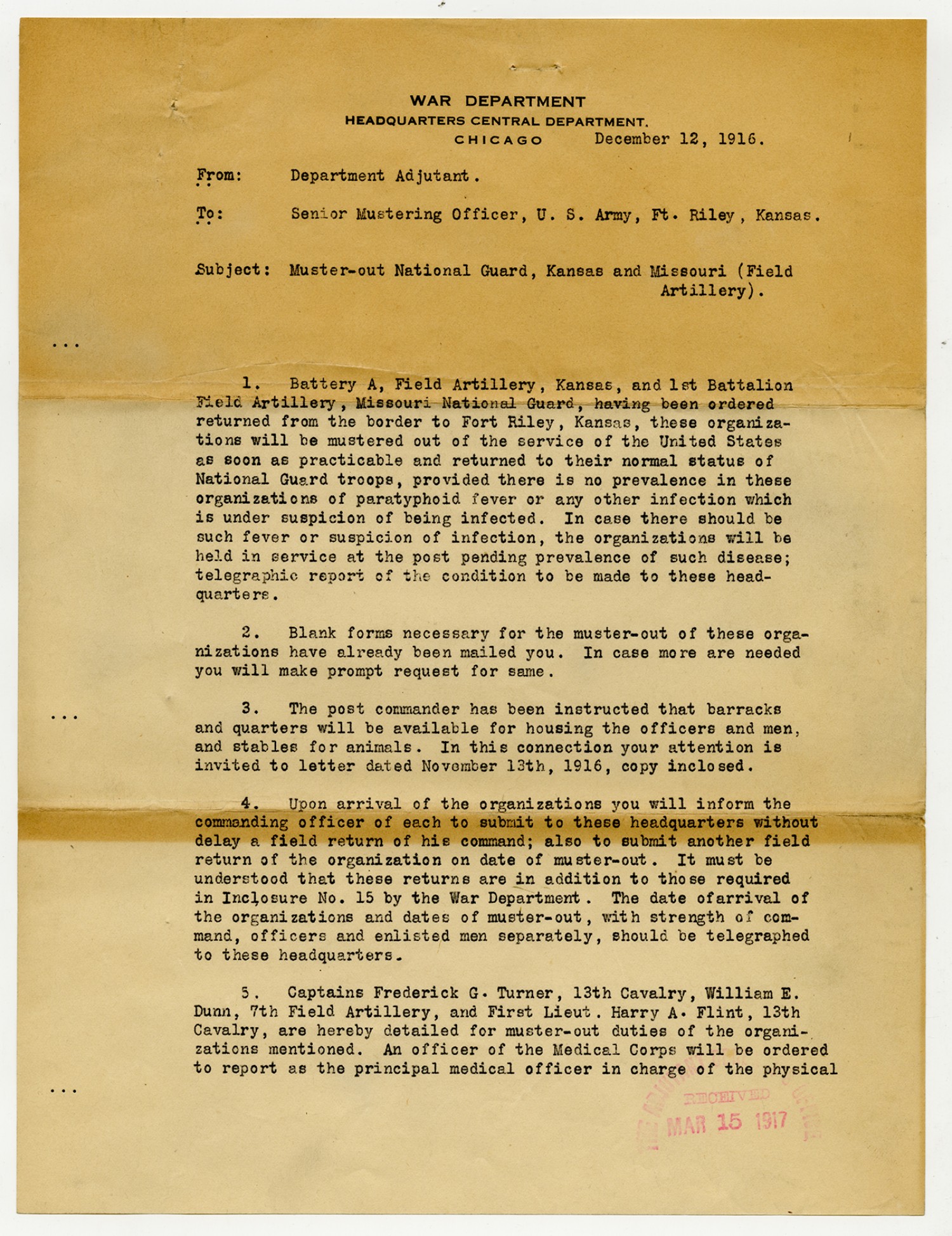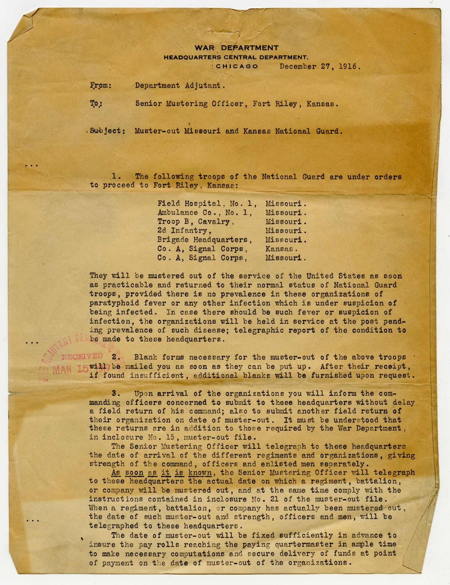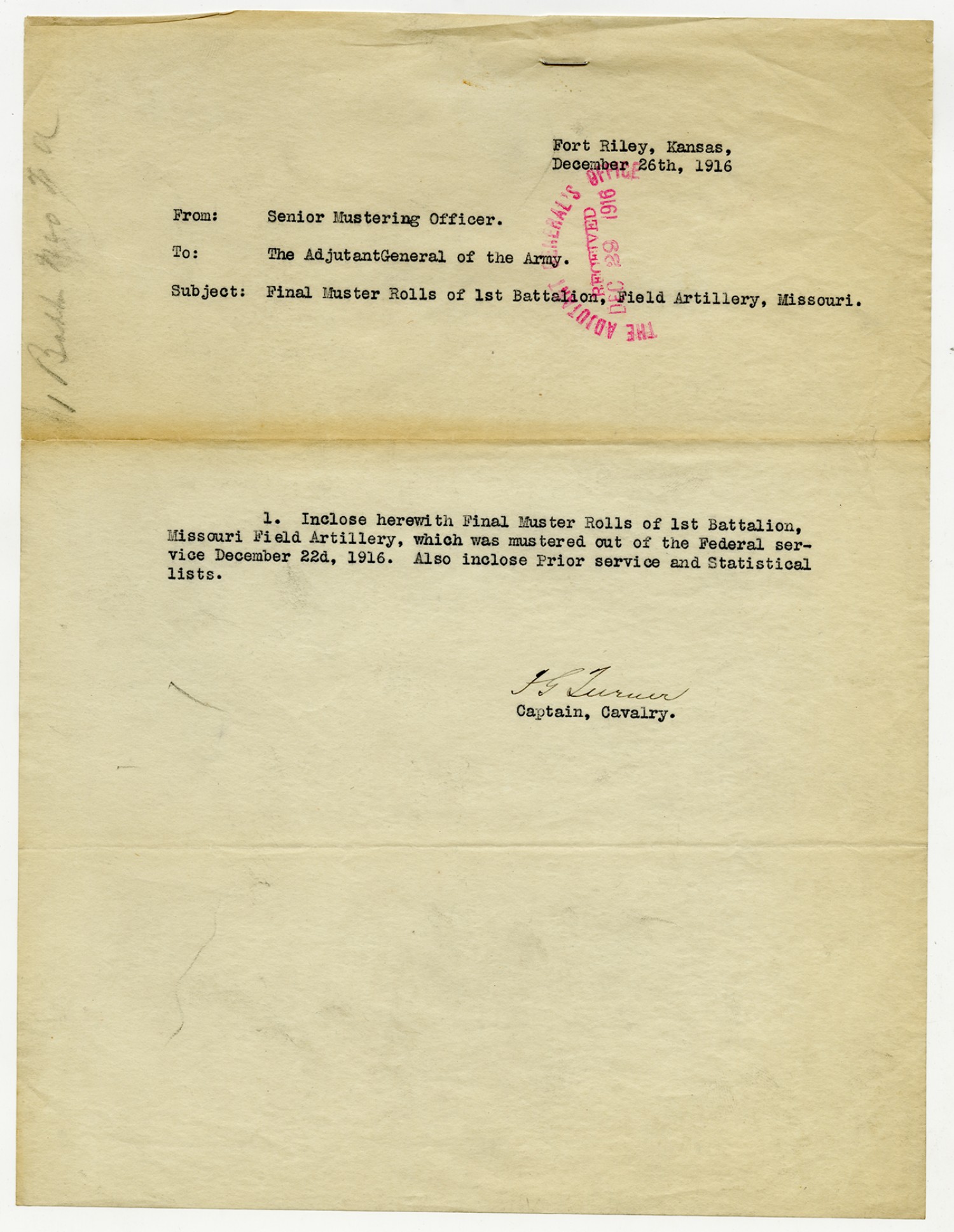 Department Adjutant letter to the Senior Mustering Officer - December 12, 1916