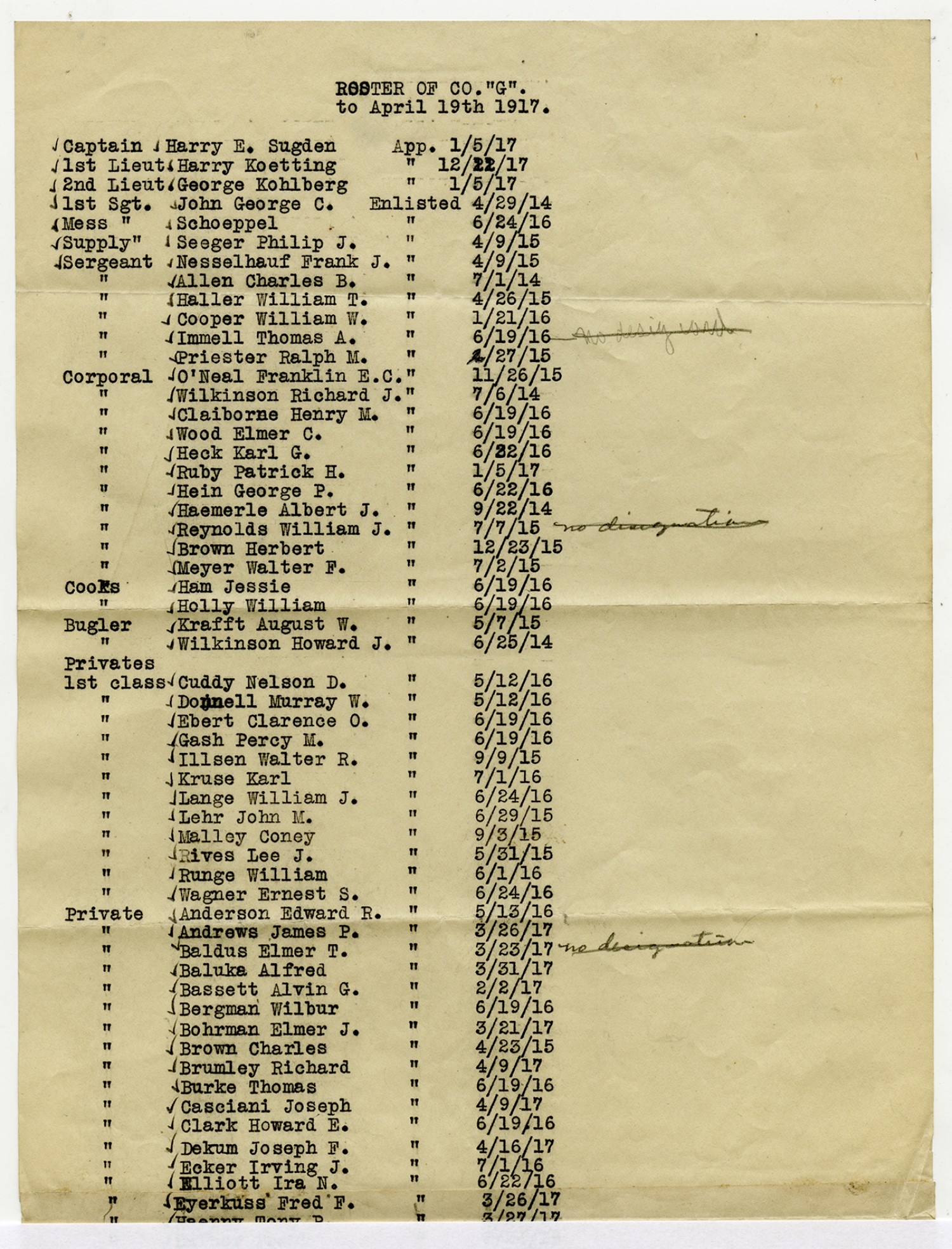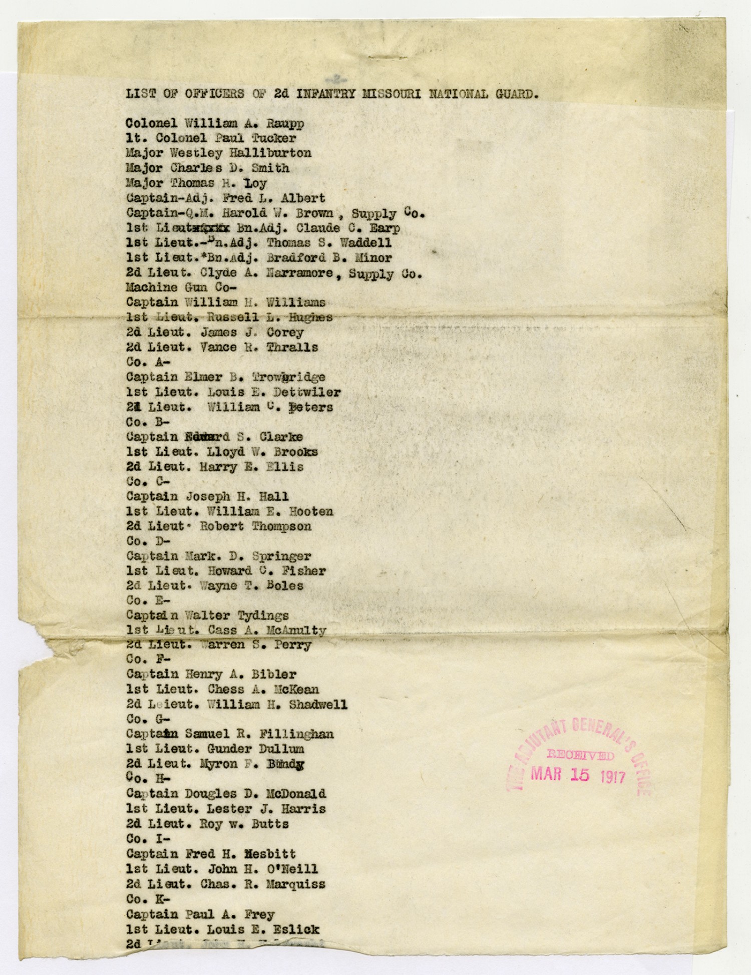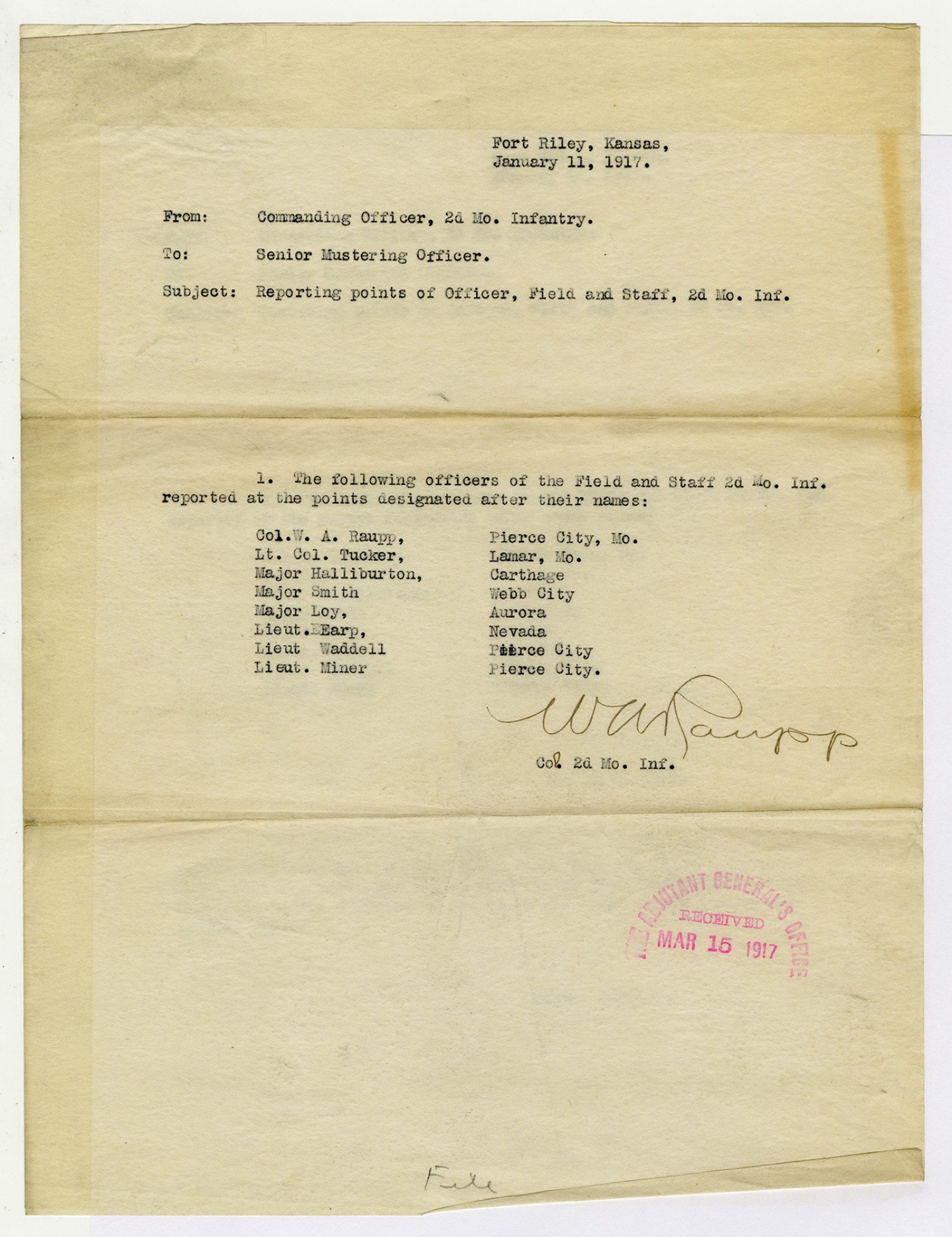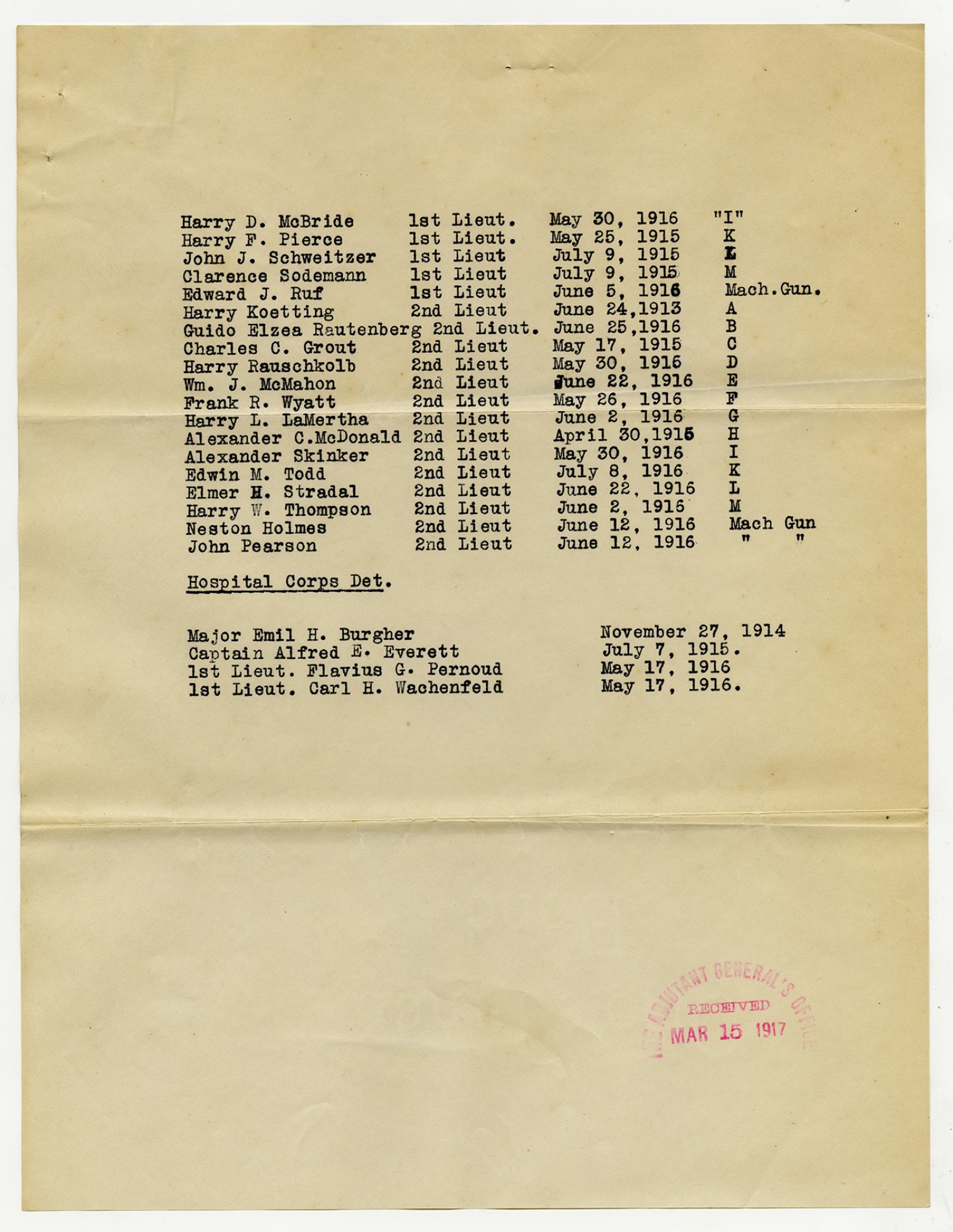 Colonel W.A. Raupp Roster - March 15, 1917